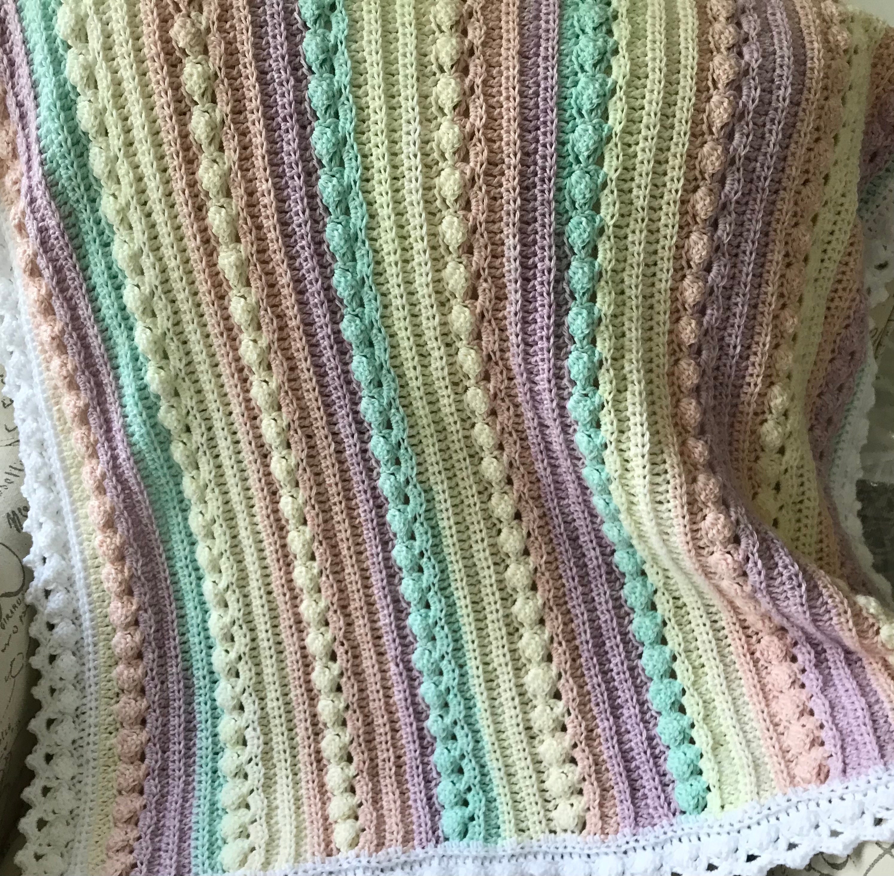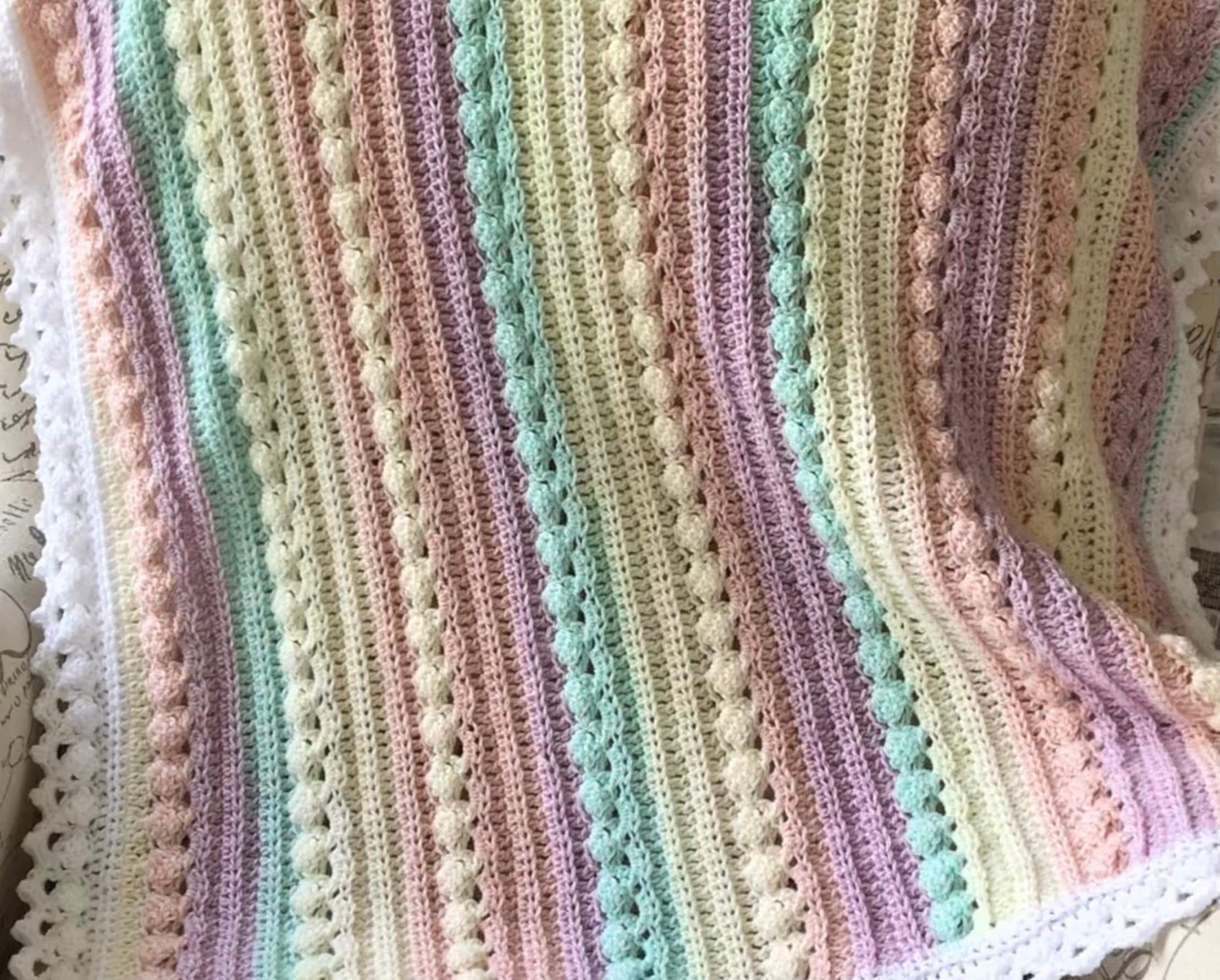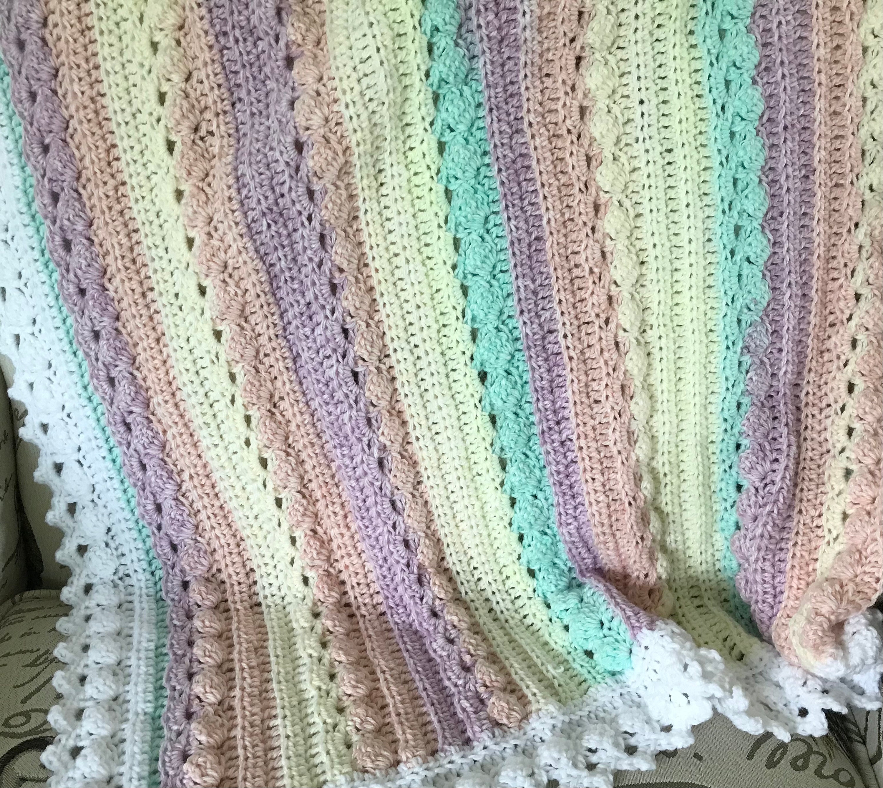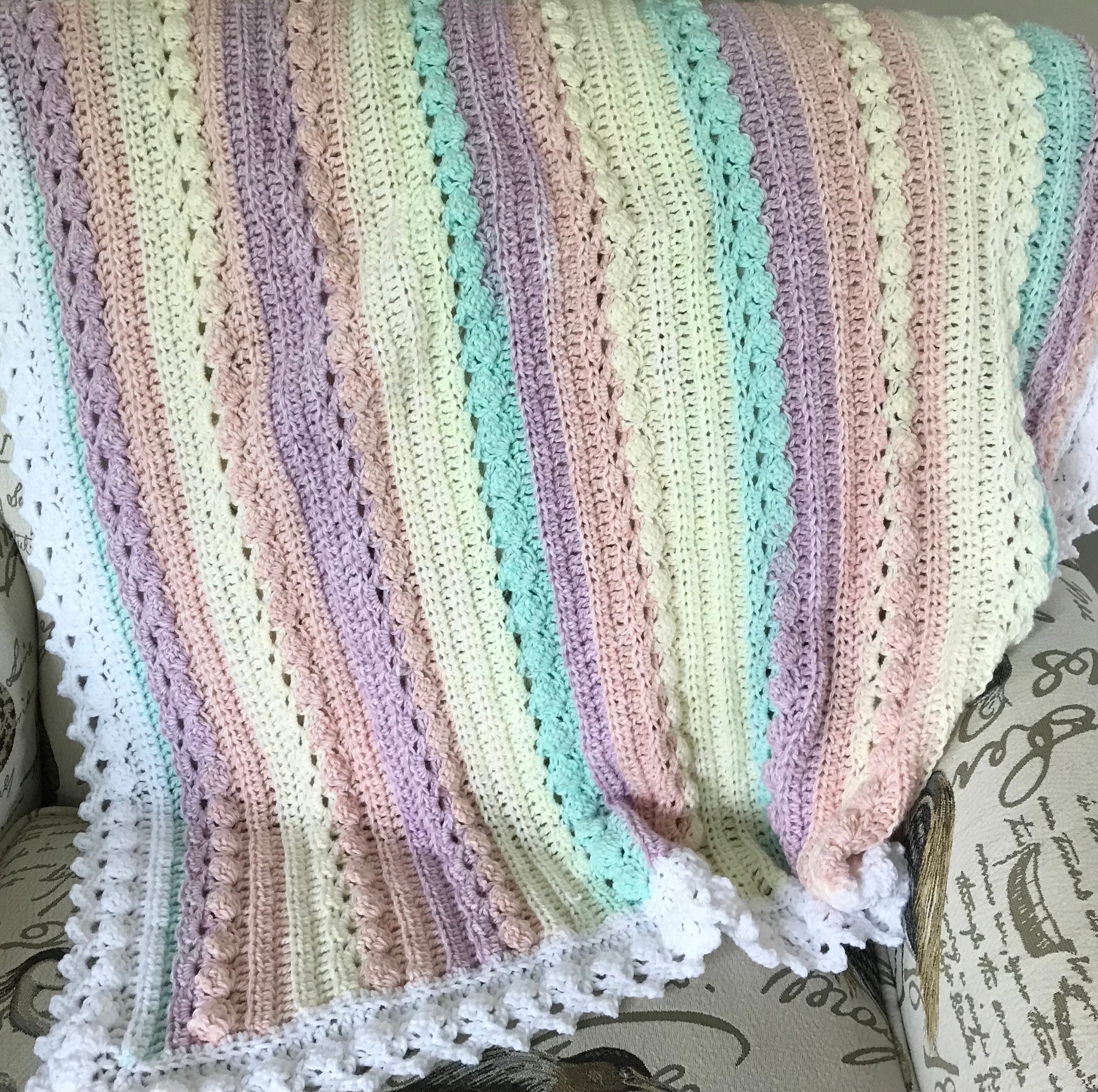 Beautiful pastel self striping BOHO rainbow colors baby blanket. NOTE: Due to the nature of self-striping yarns, there will be color and striping variations. Each blanket will be unique!