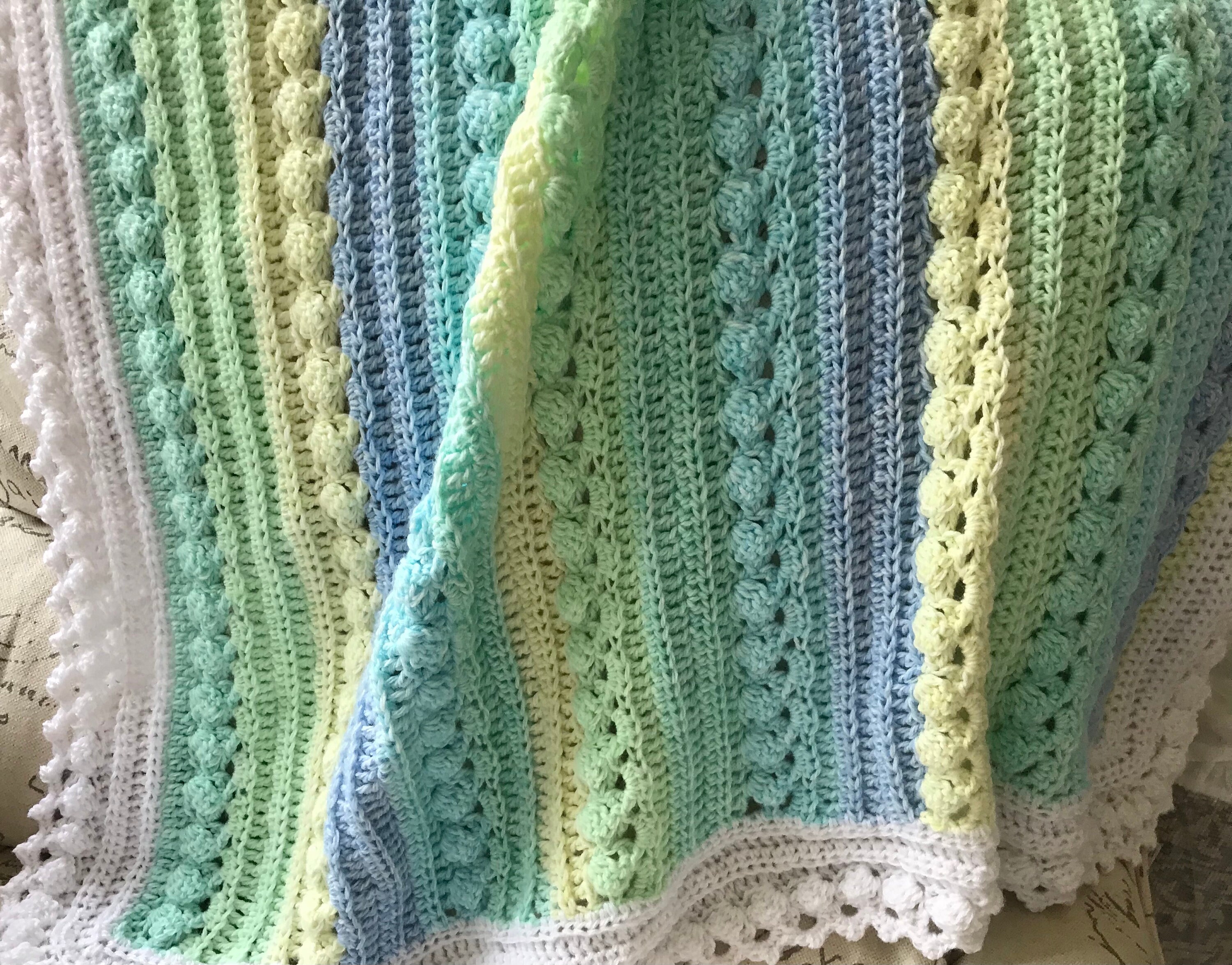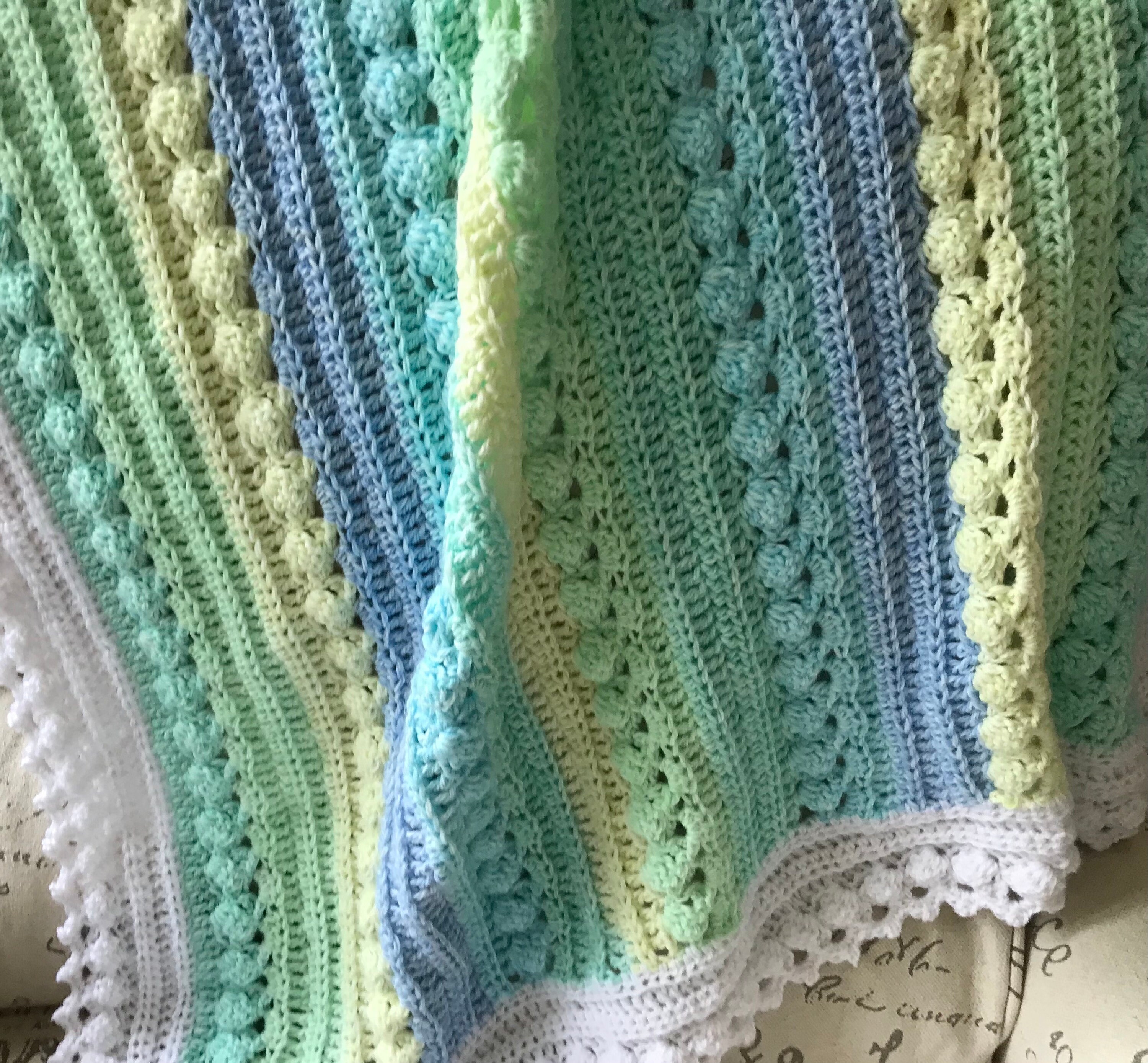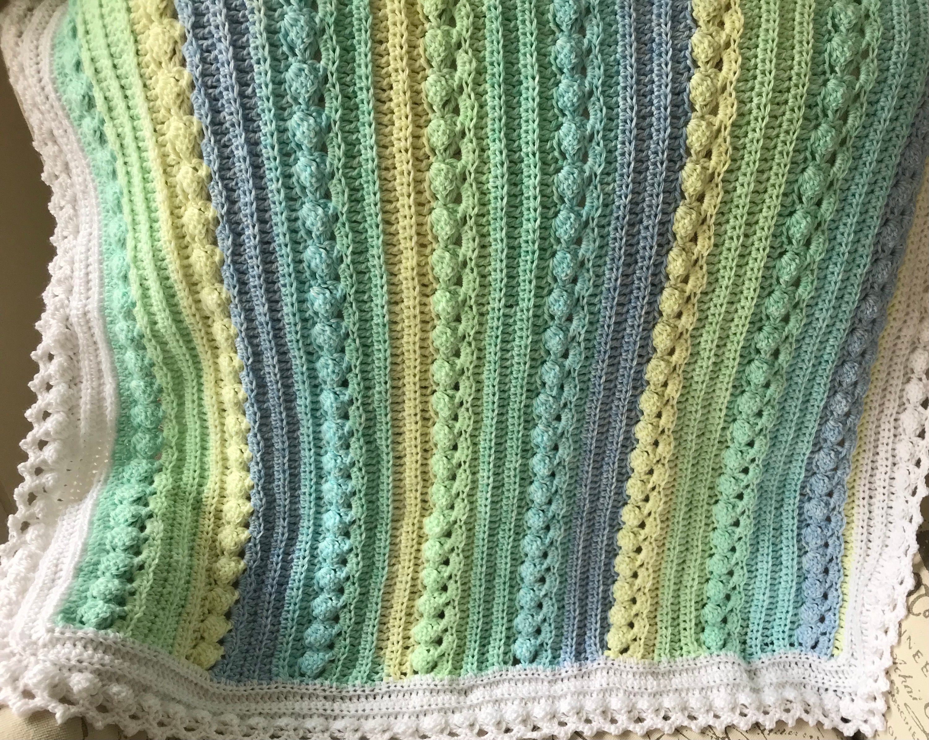 Super soft baby crocheted blanket in a wonderful NEW cable pattern. Original Baby Tuckers design. White edge as shown.