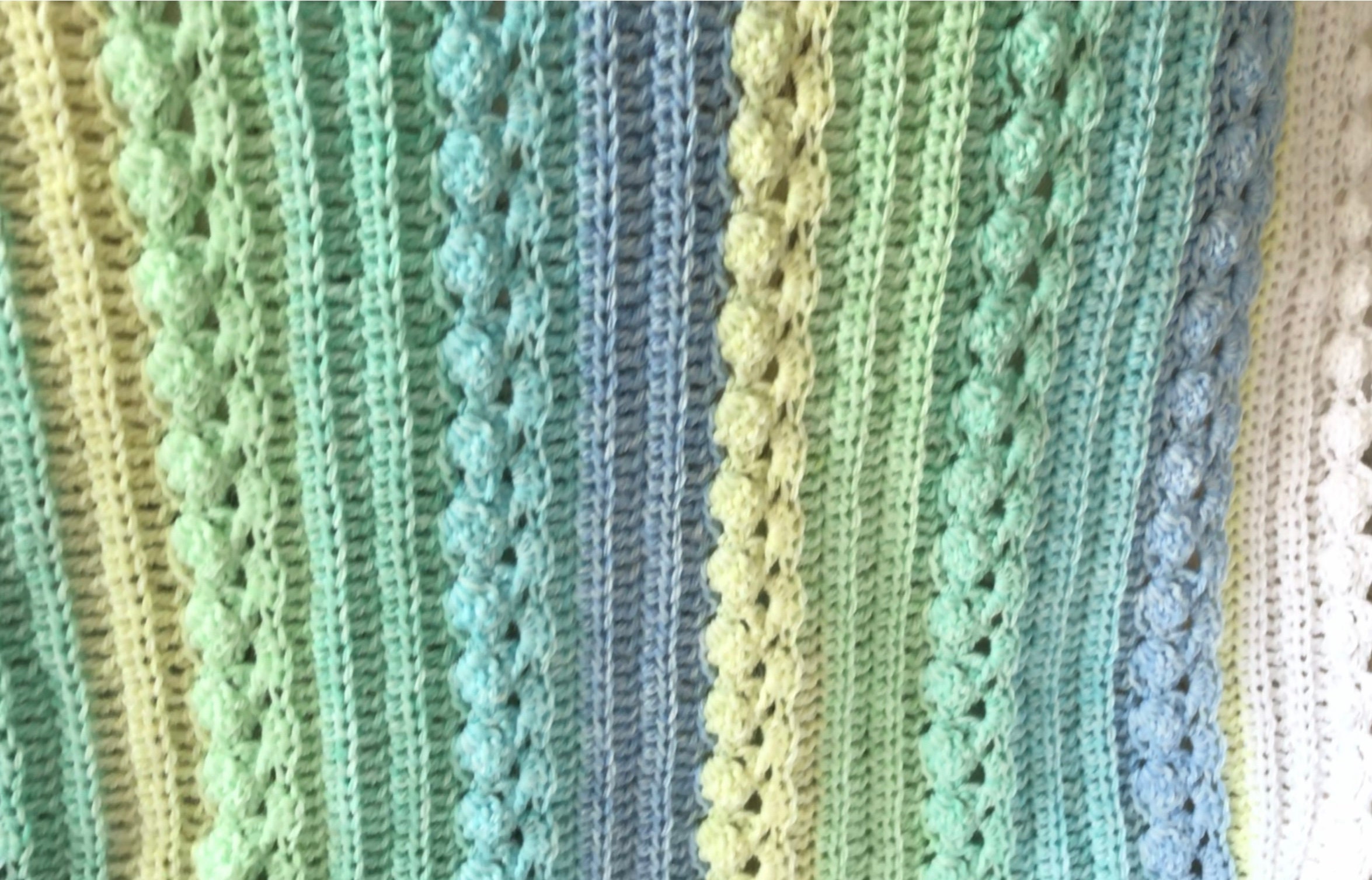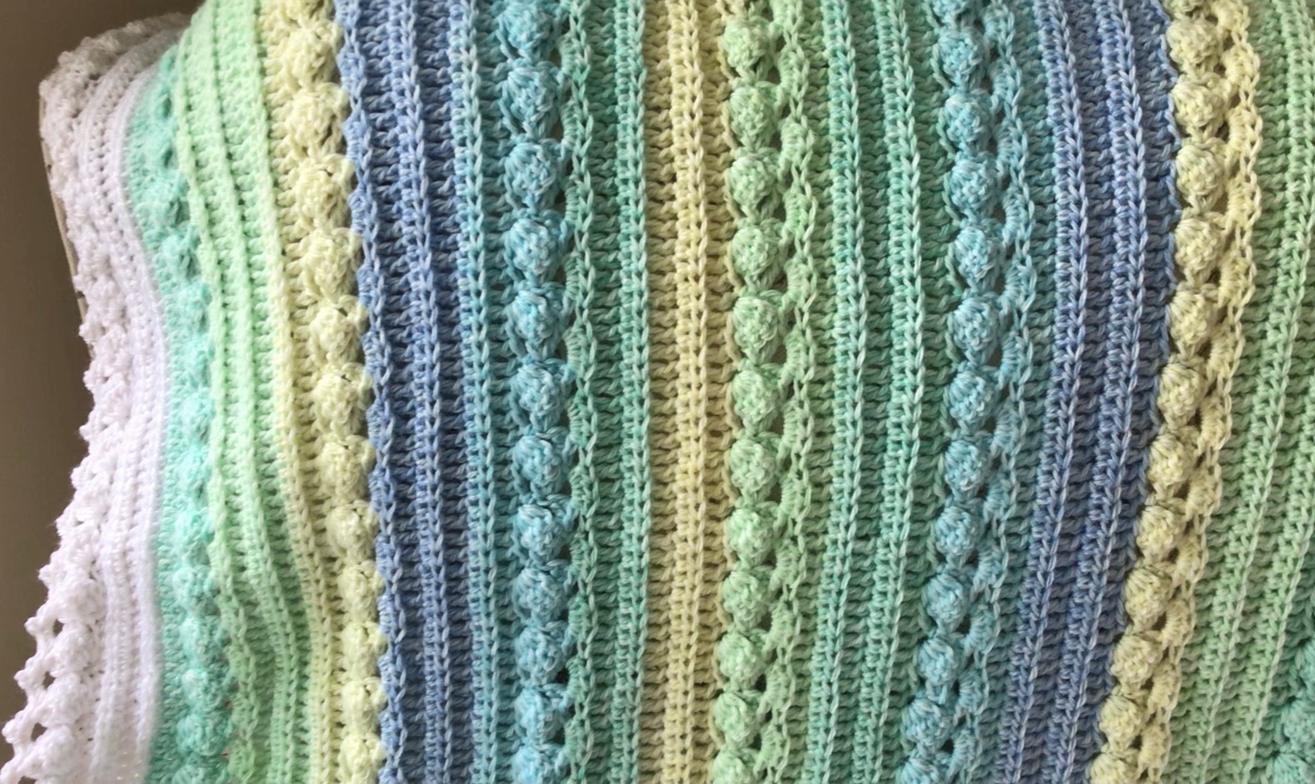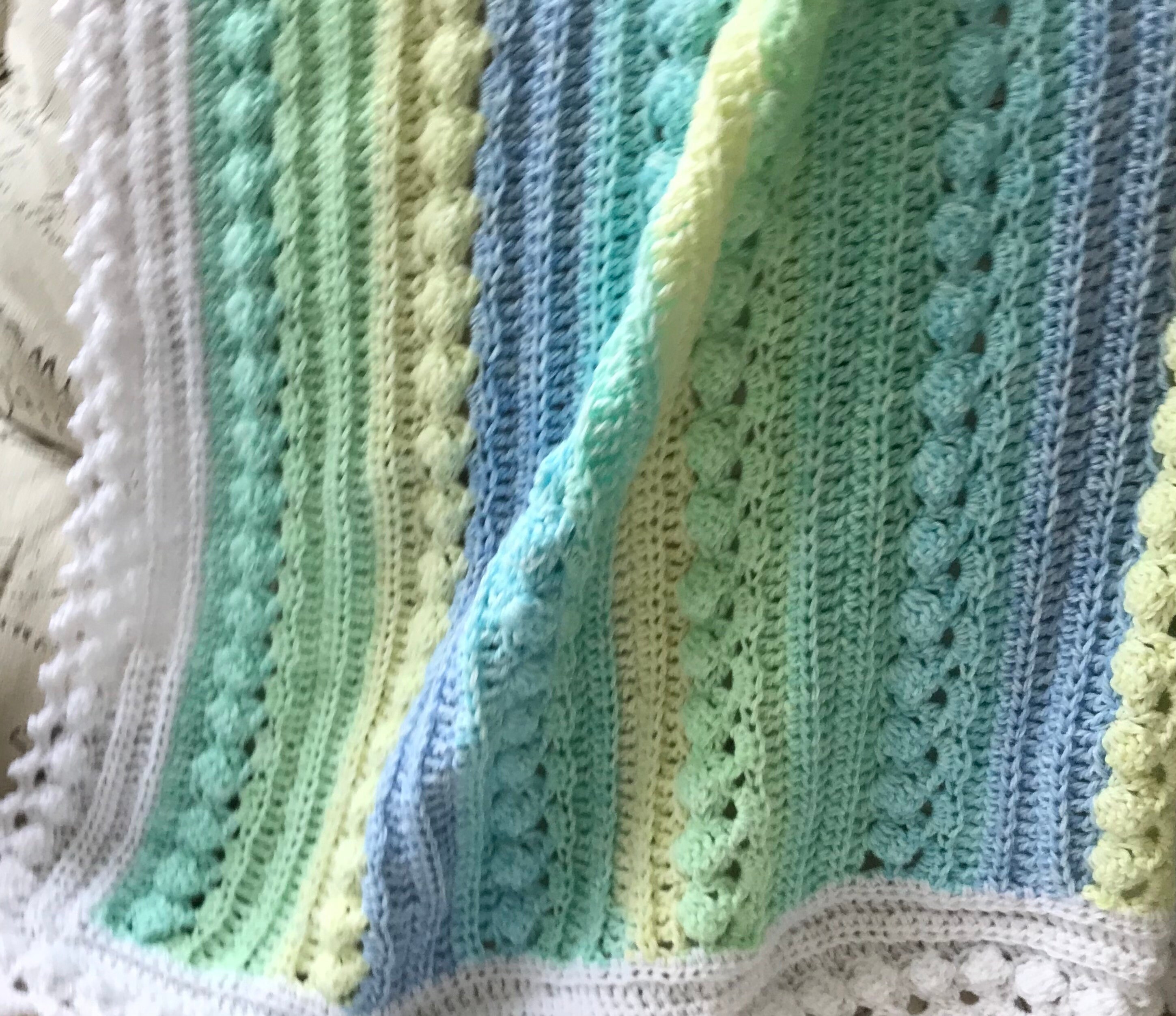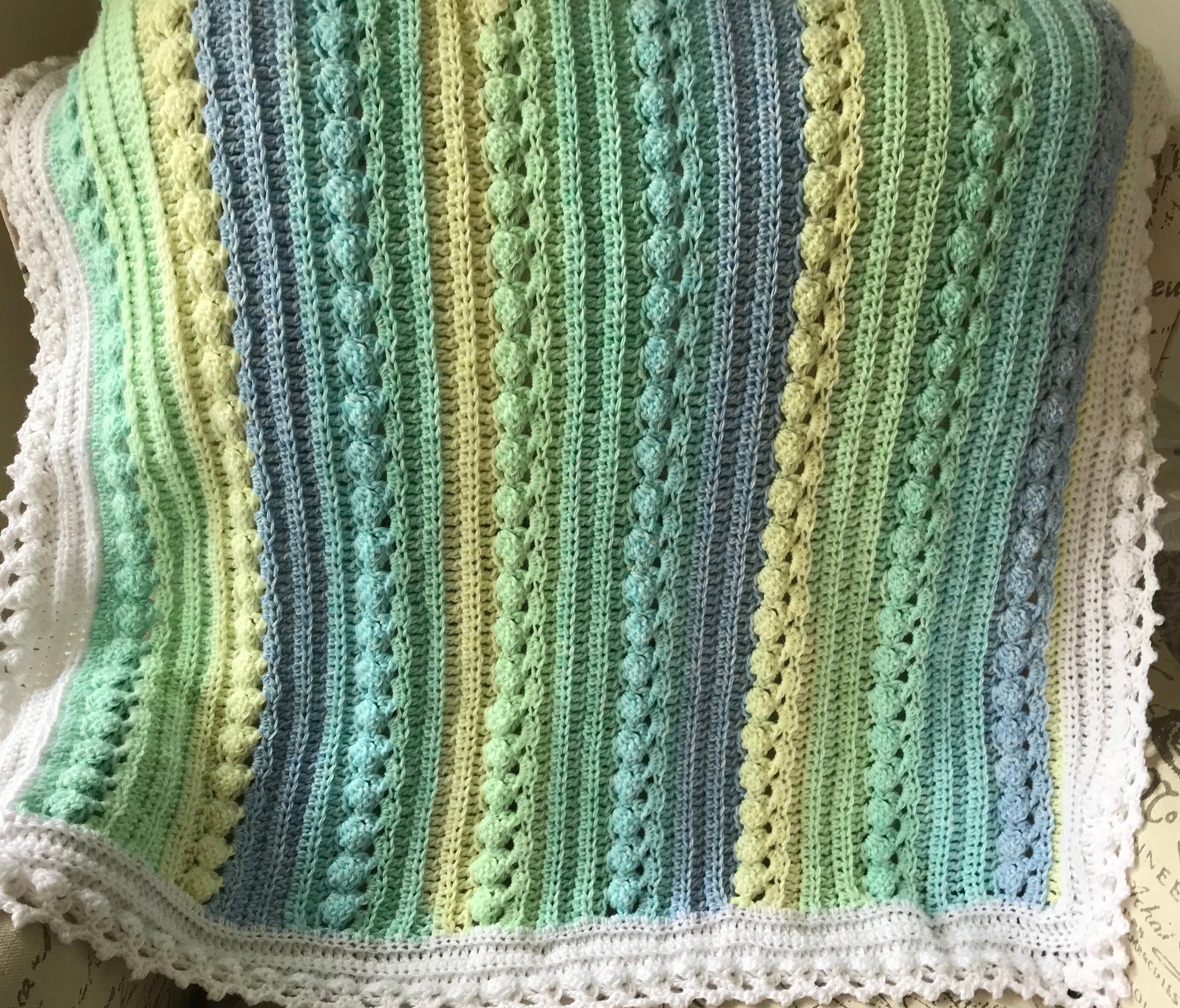Super soft baby crocheted blanket in a wonderful NEW cable pattern. Original Baby Tuckers design. White edge as shown.