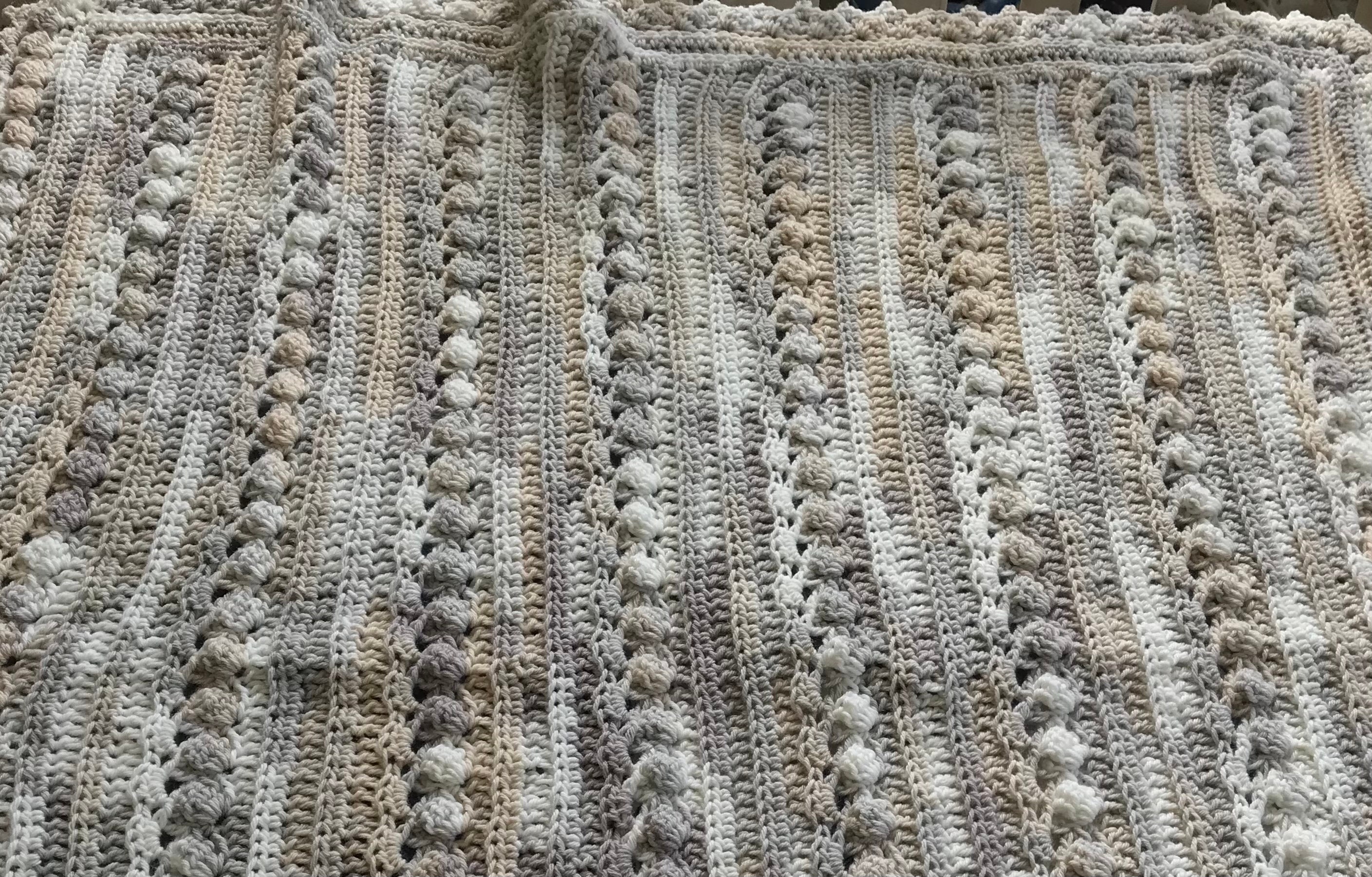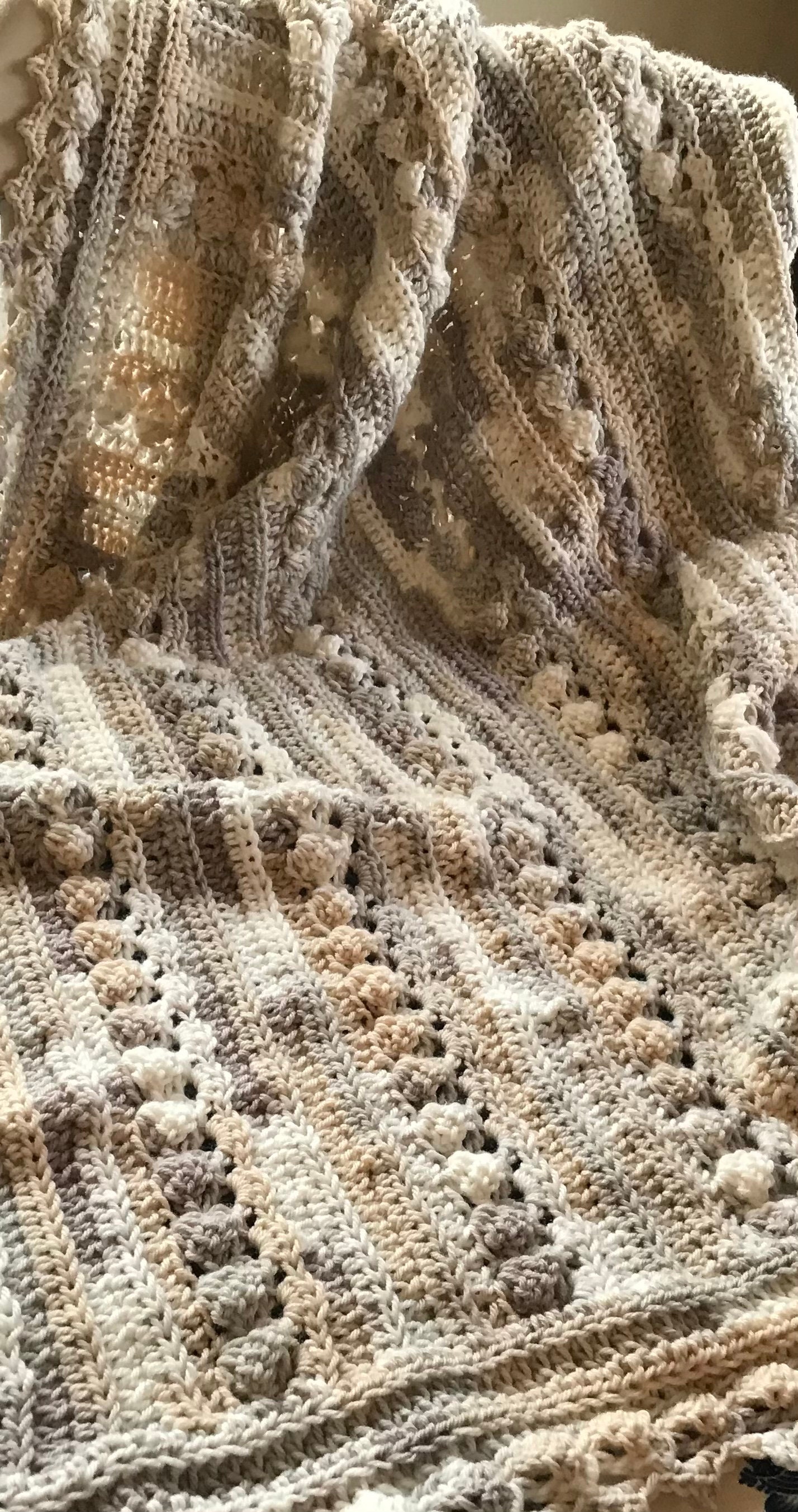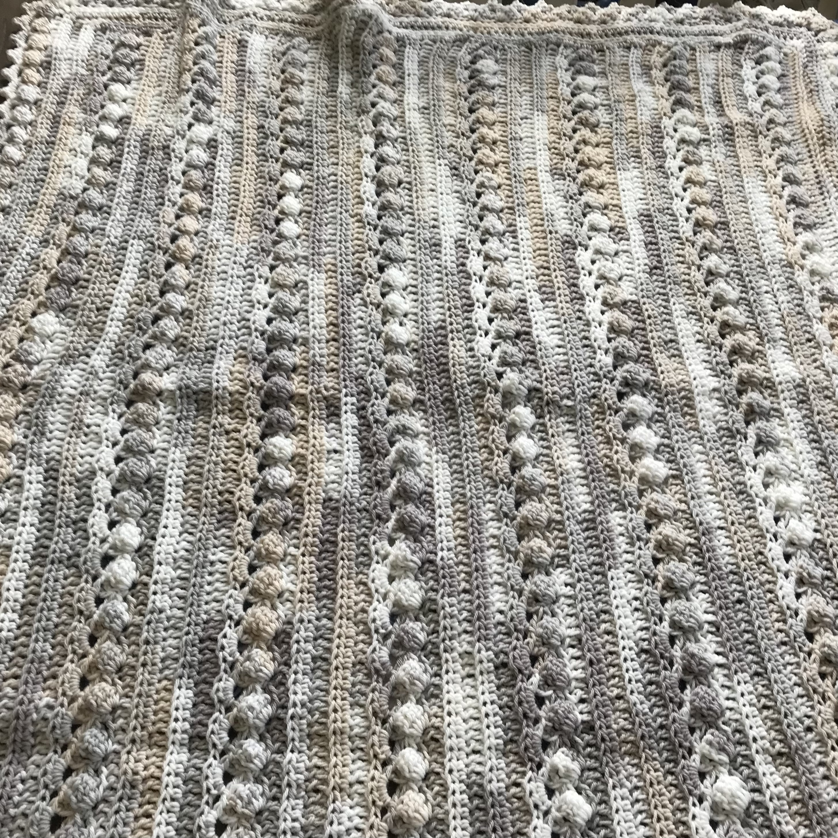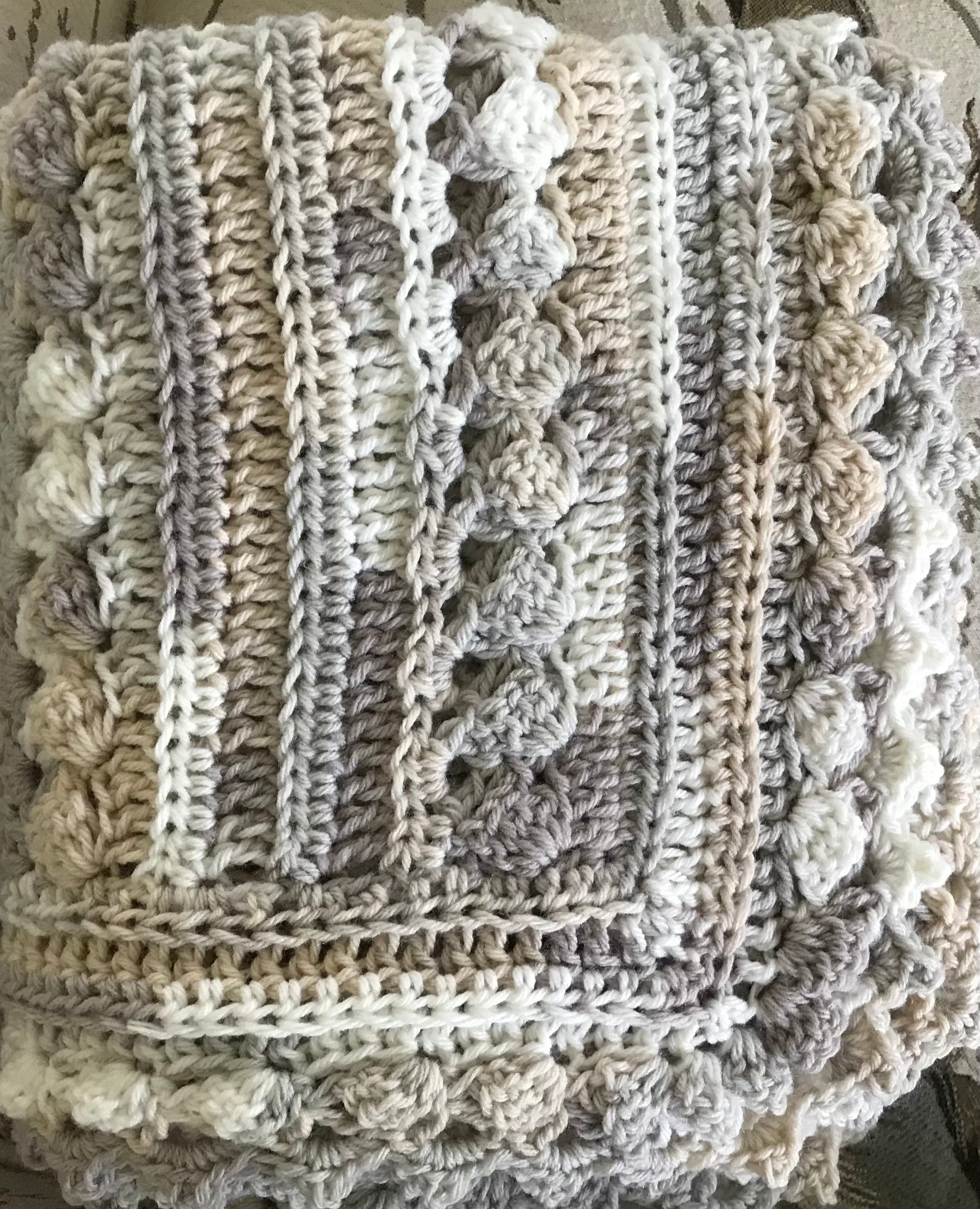 Beautiful variegated coloration self striping yarn BOHO baby blanket. NOTE: Due to the nature of self-striping yarns, there will be some color and striping variations. Super soft baby crocheted blanket in a wonderful NEW cable pattern. Original Baby Tuckers design.