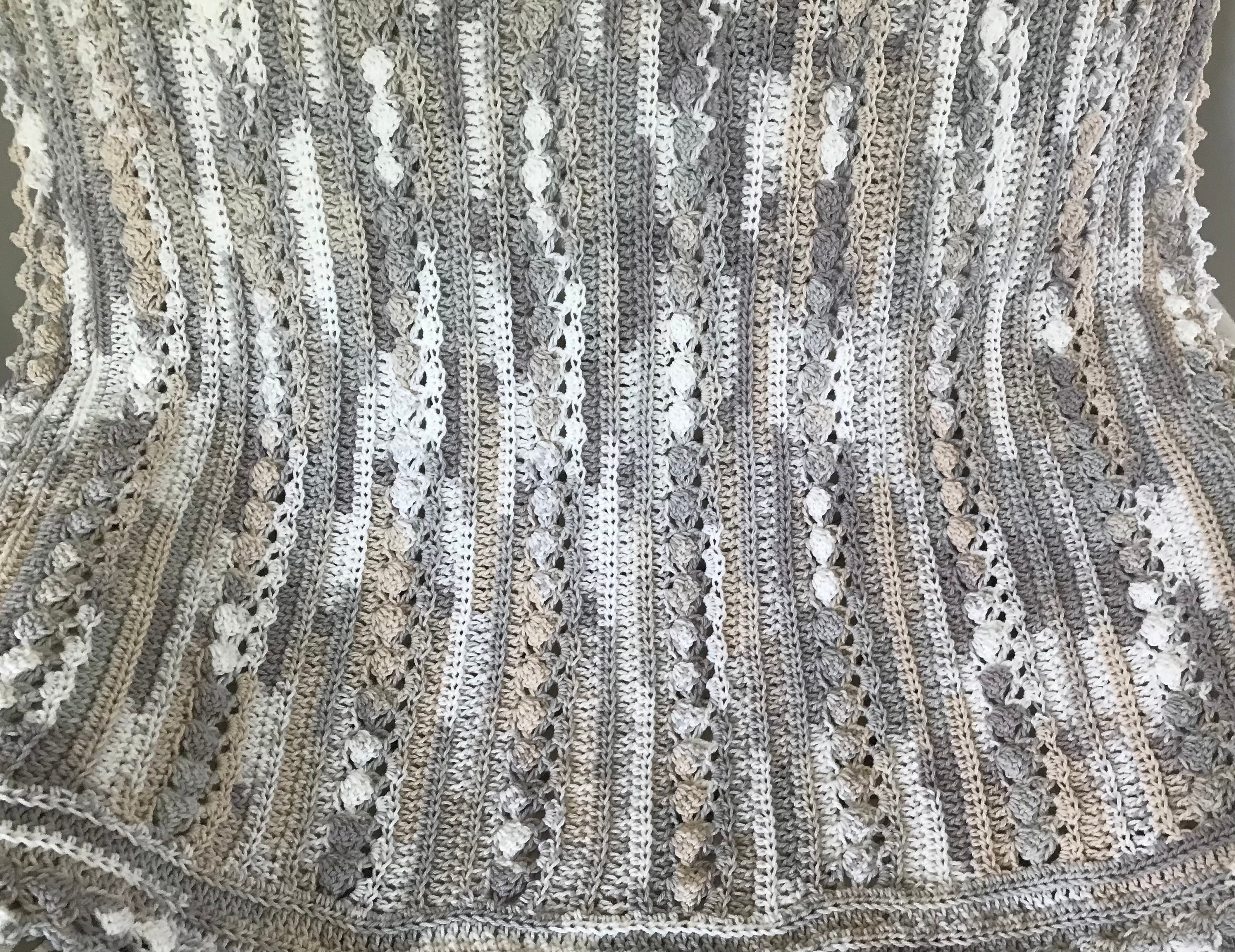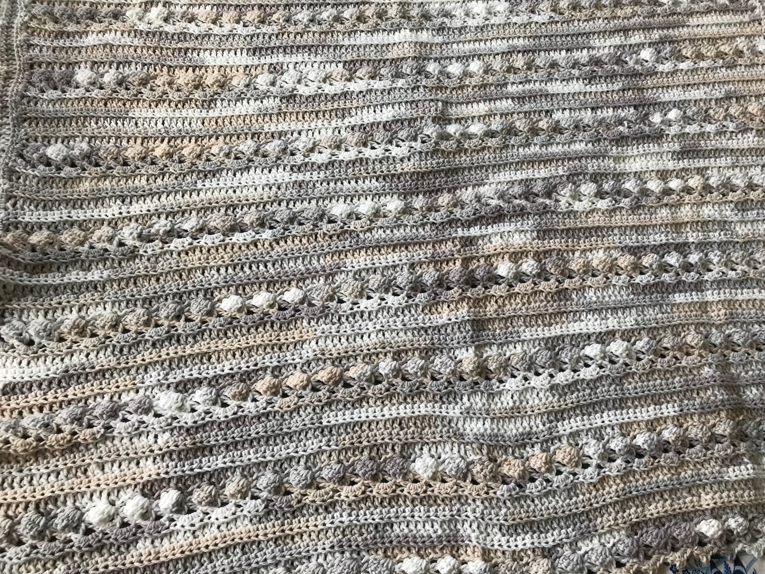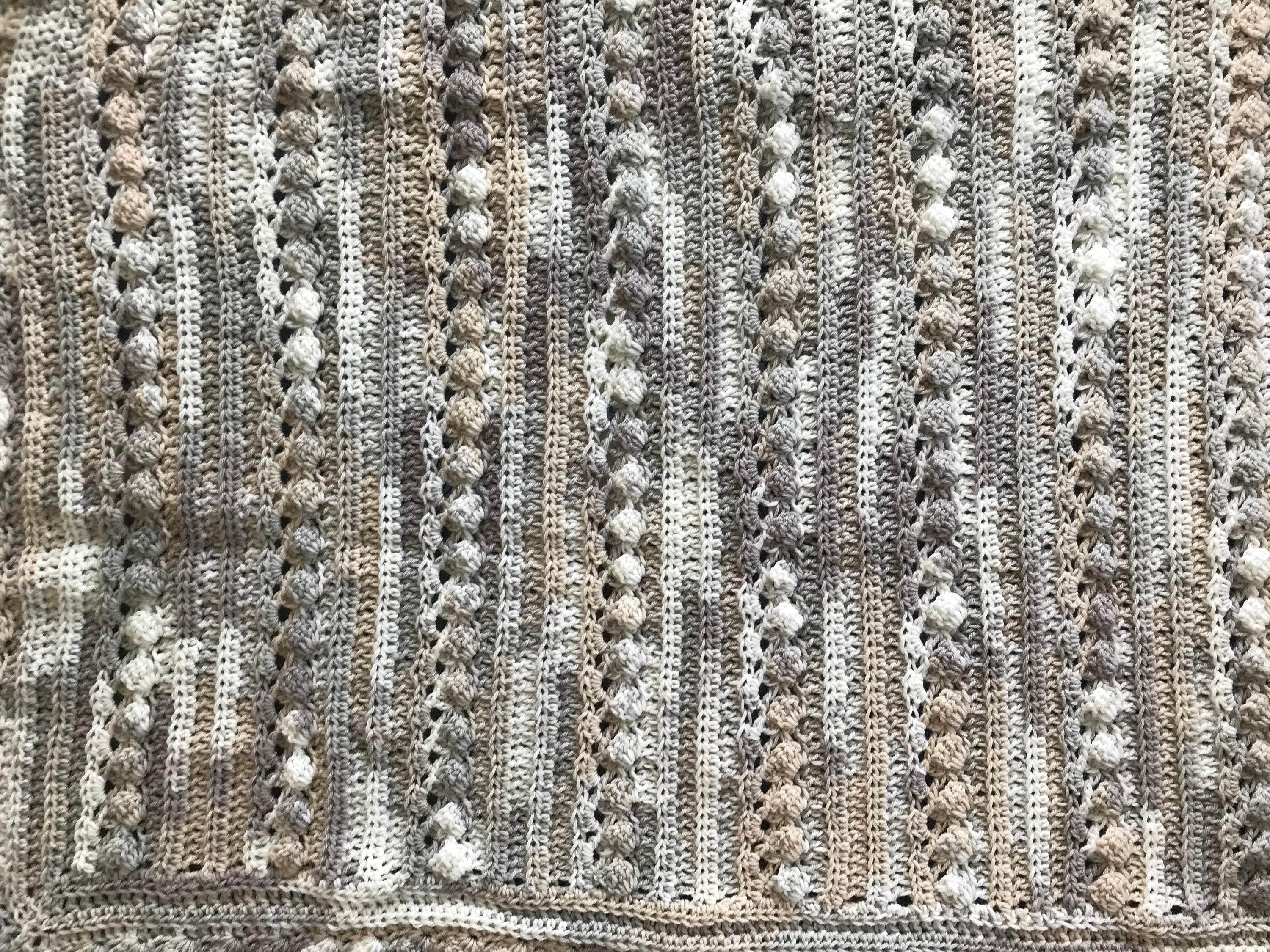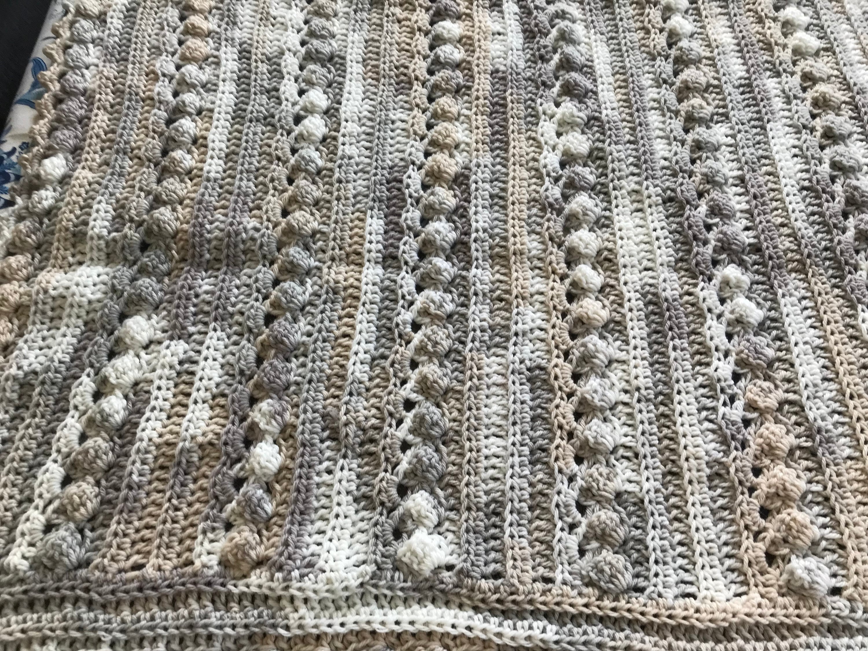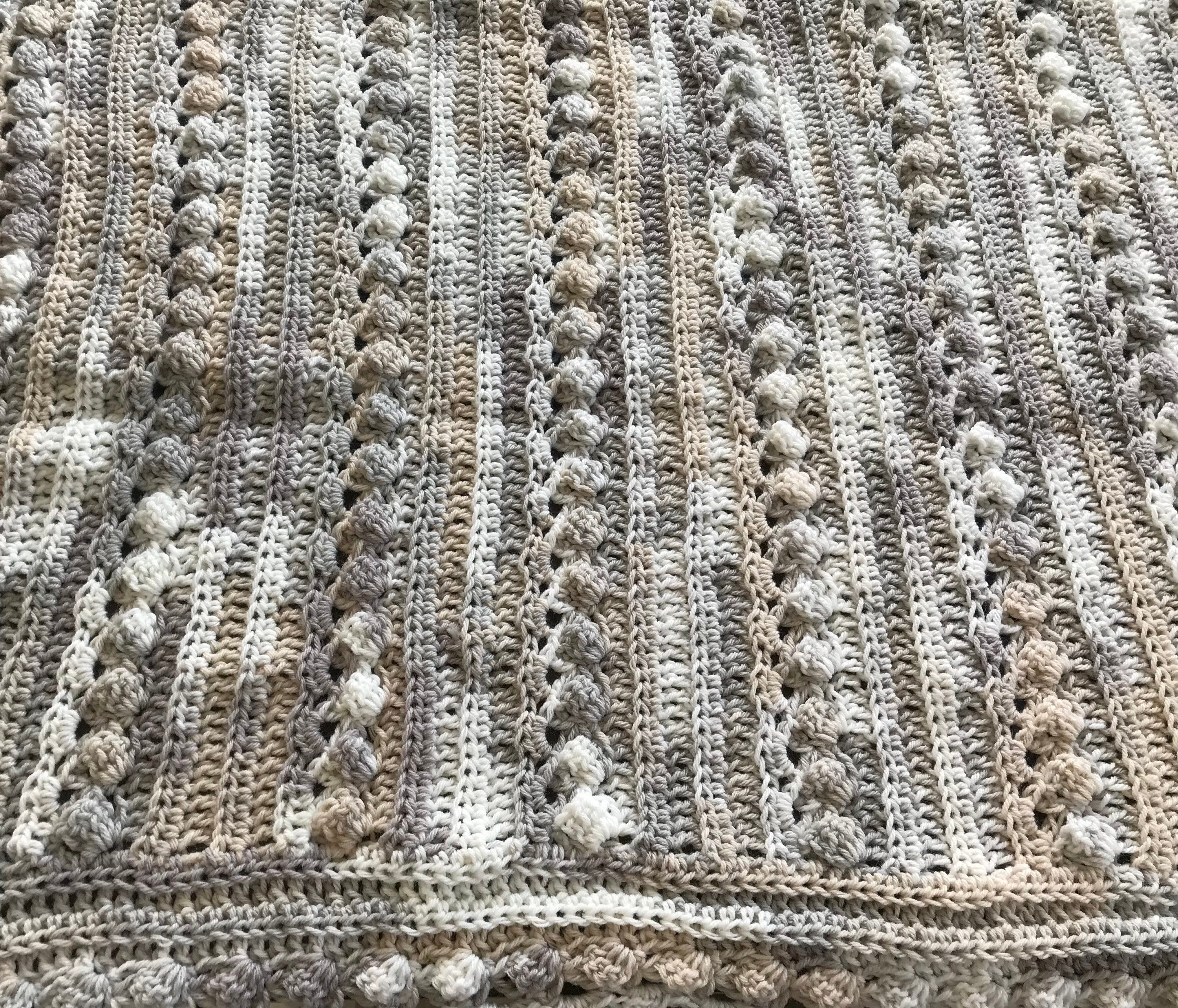 Beautiful variegated coloration self striping yarn BOHO baby blanket. NOTE: Due to the nature of self-striping yarns, there will be some color and striping variations. Super soft baby crocheted blanket in a wonderful NEW cable pattern. Original Baby Tuckers design.