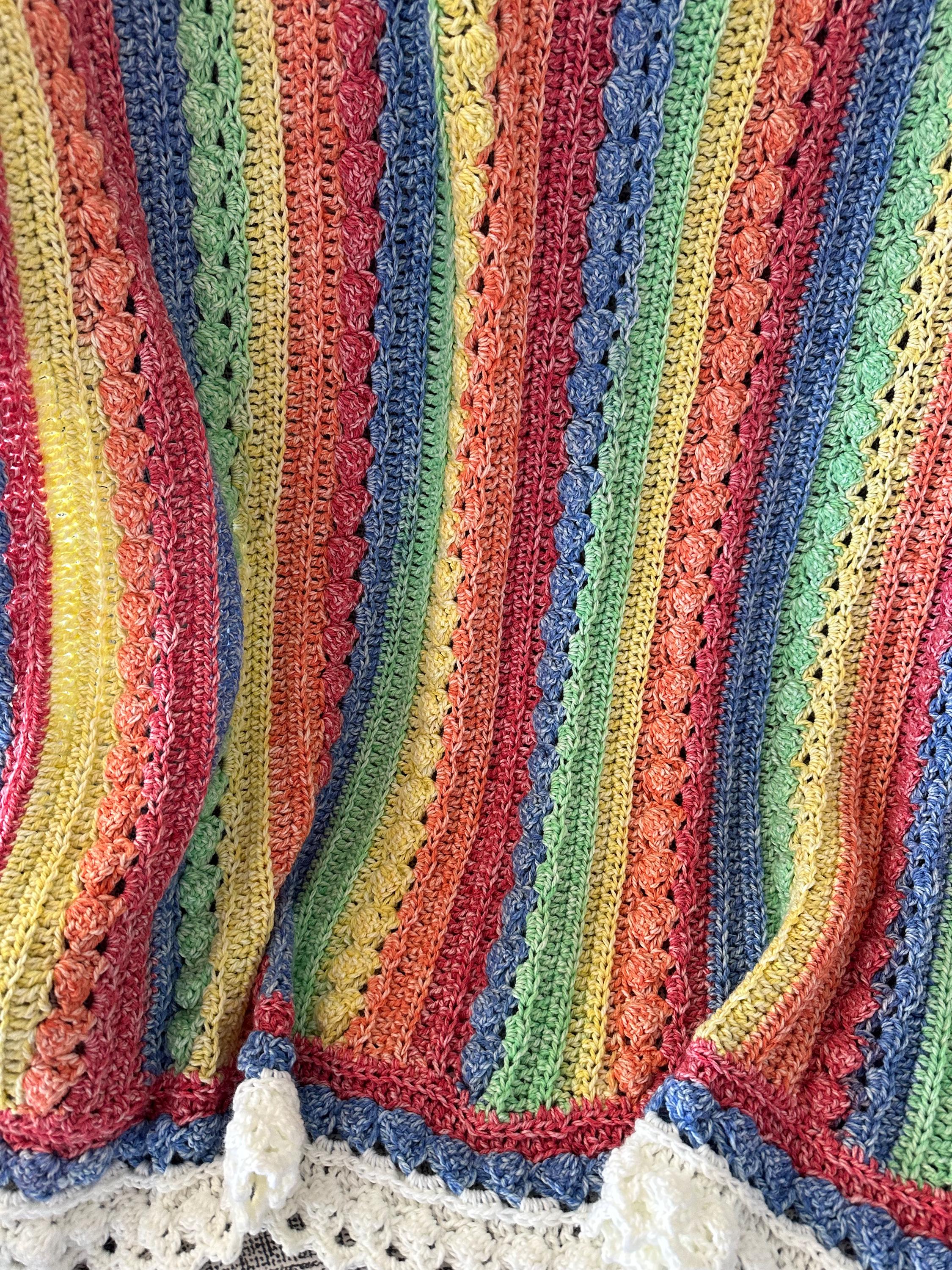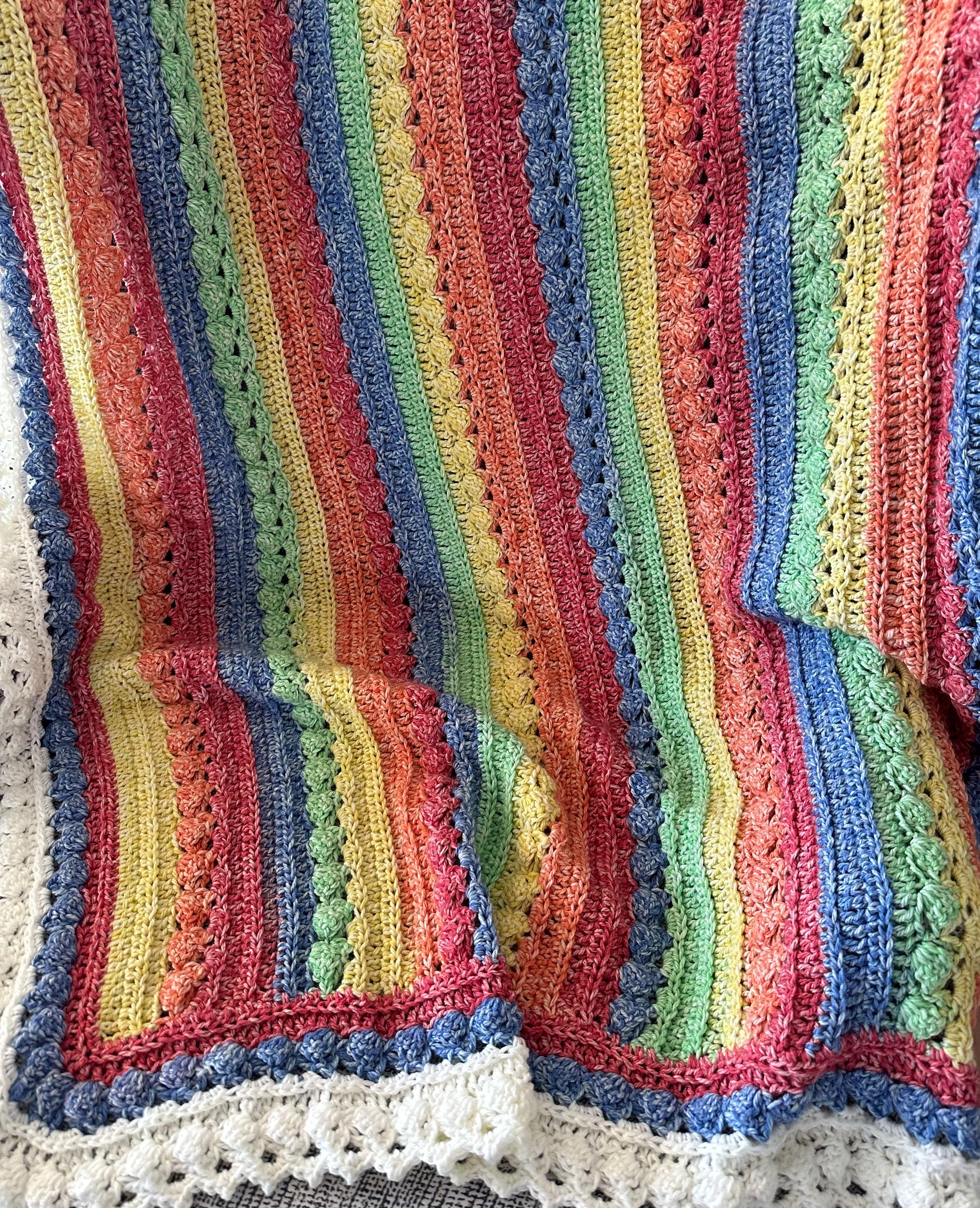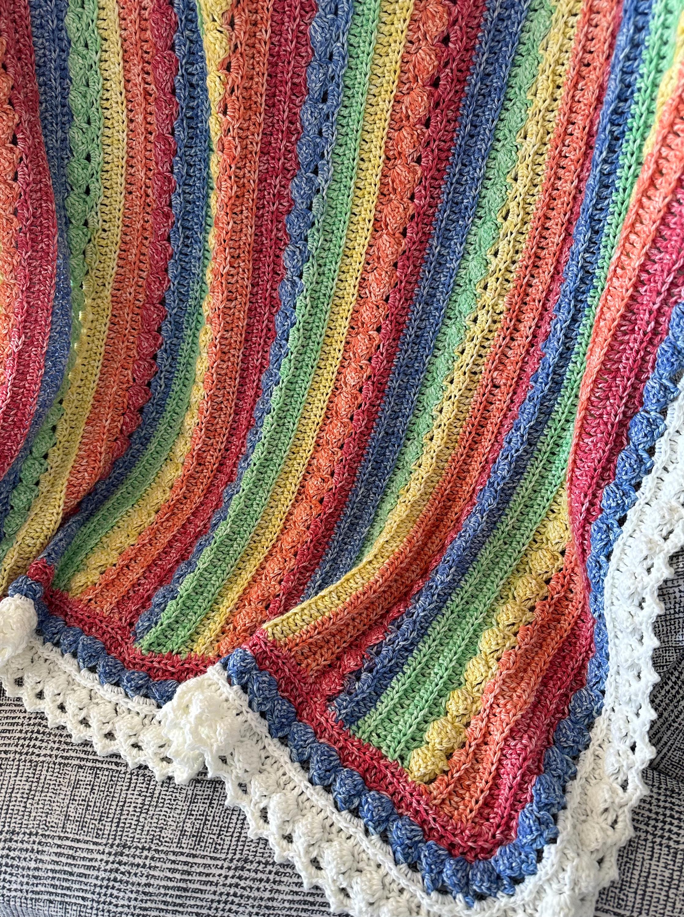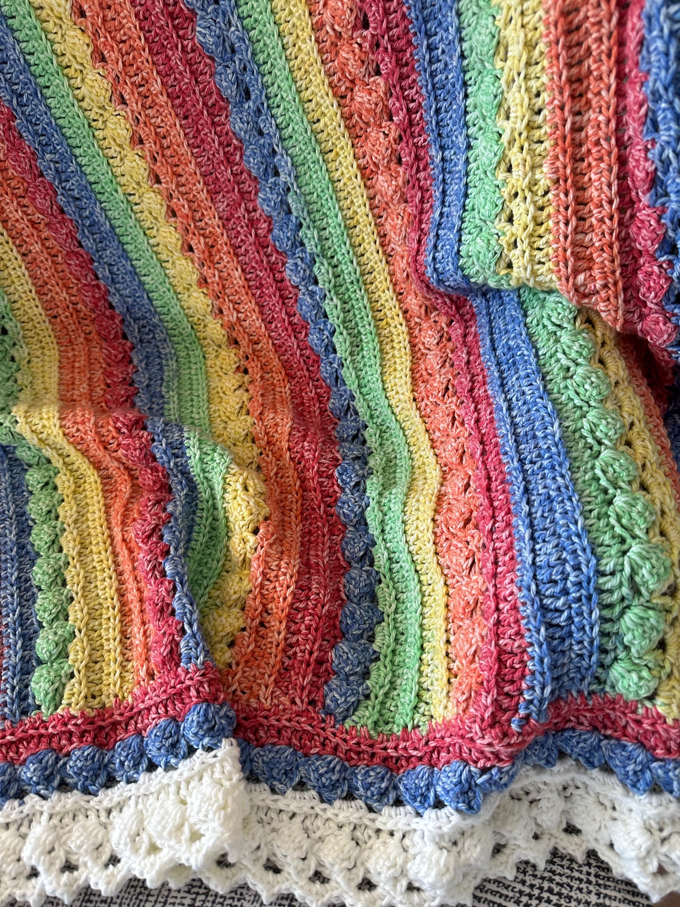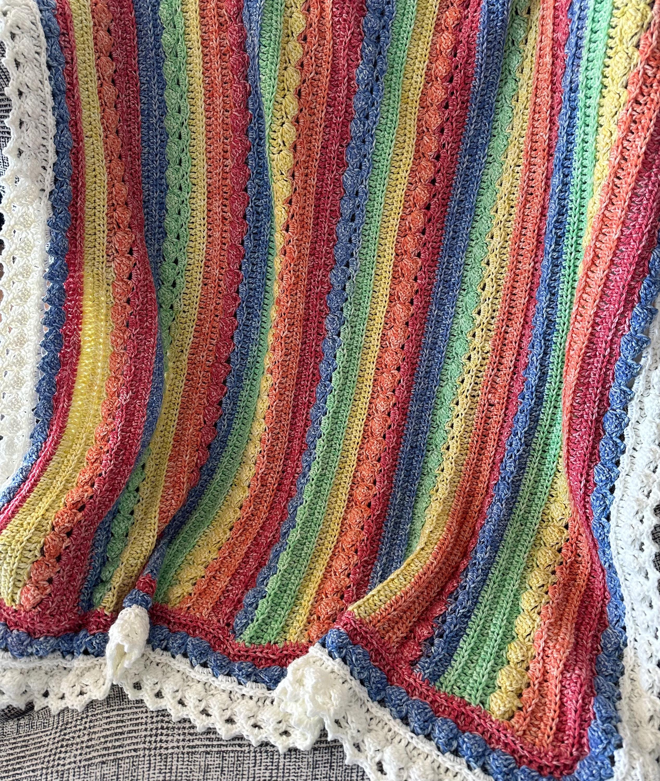 BOHO rainbow baby blanket hand crocheted in bold self striping primary colors and an off white edge. These are super soft quality baby yarns. Beautiful colors! Approximately 36 x 40