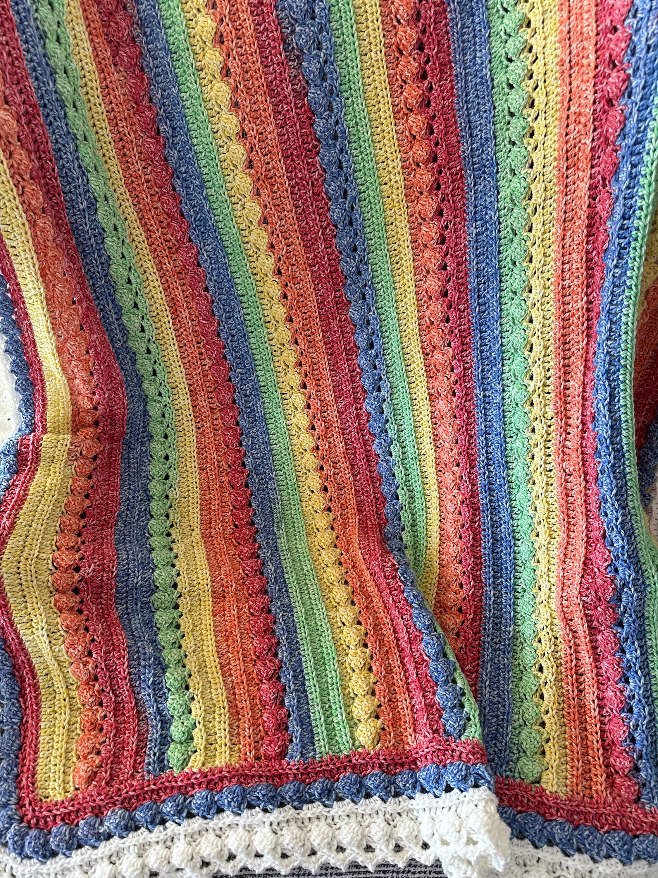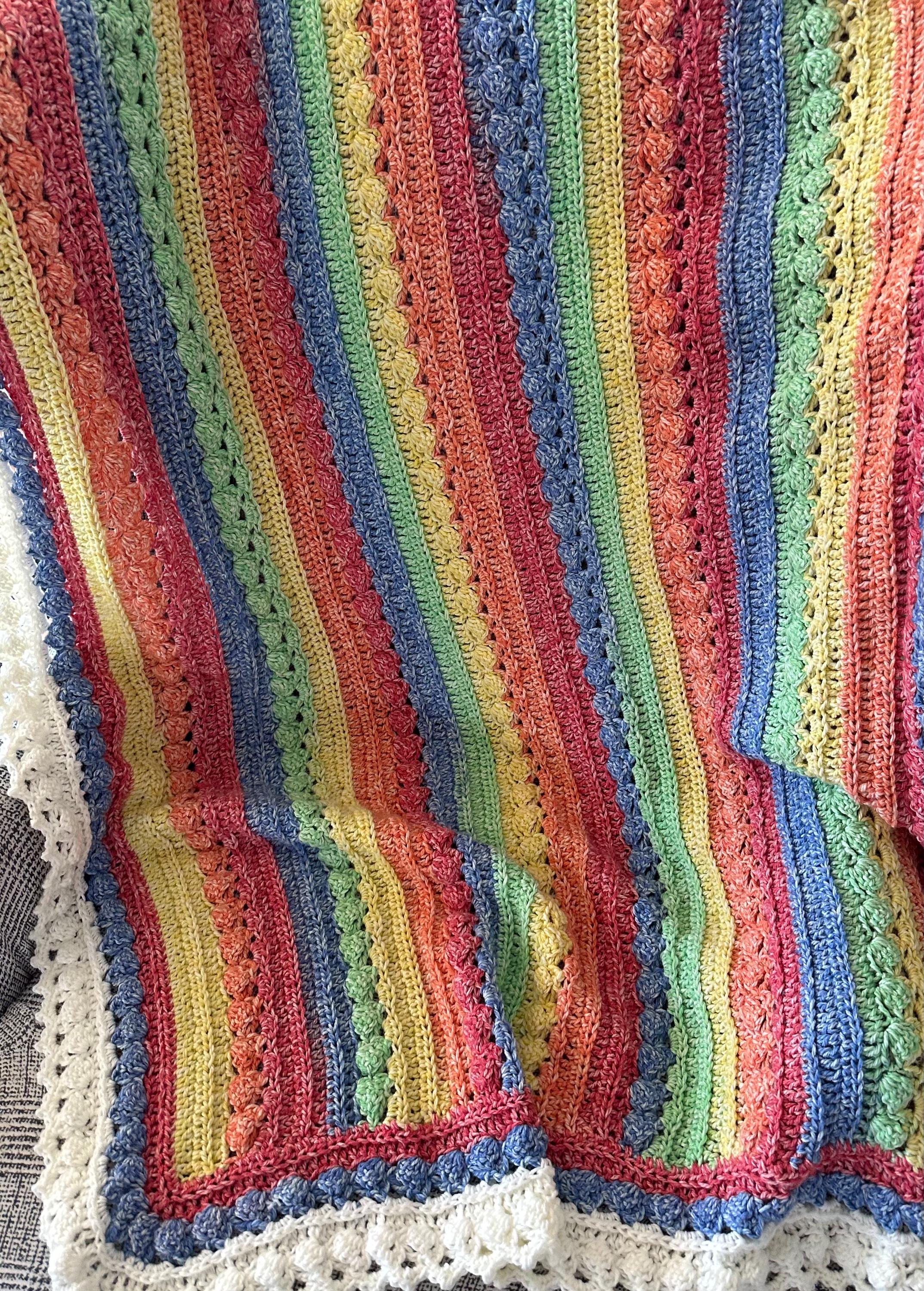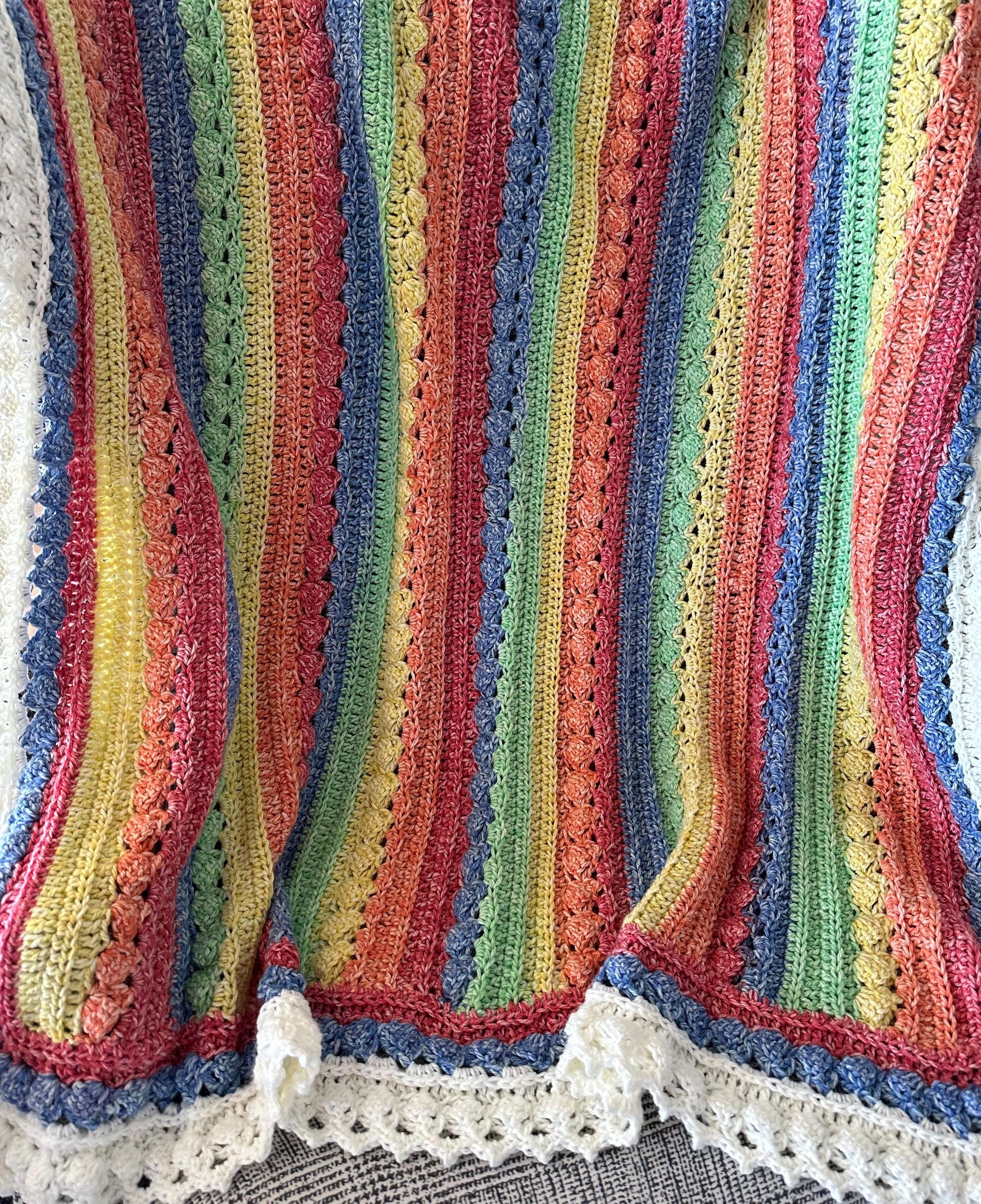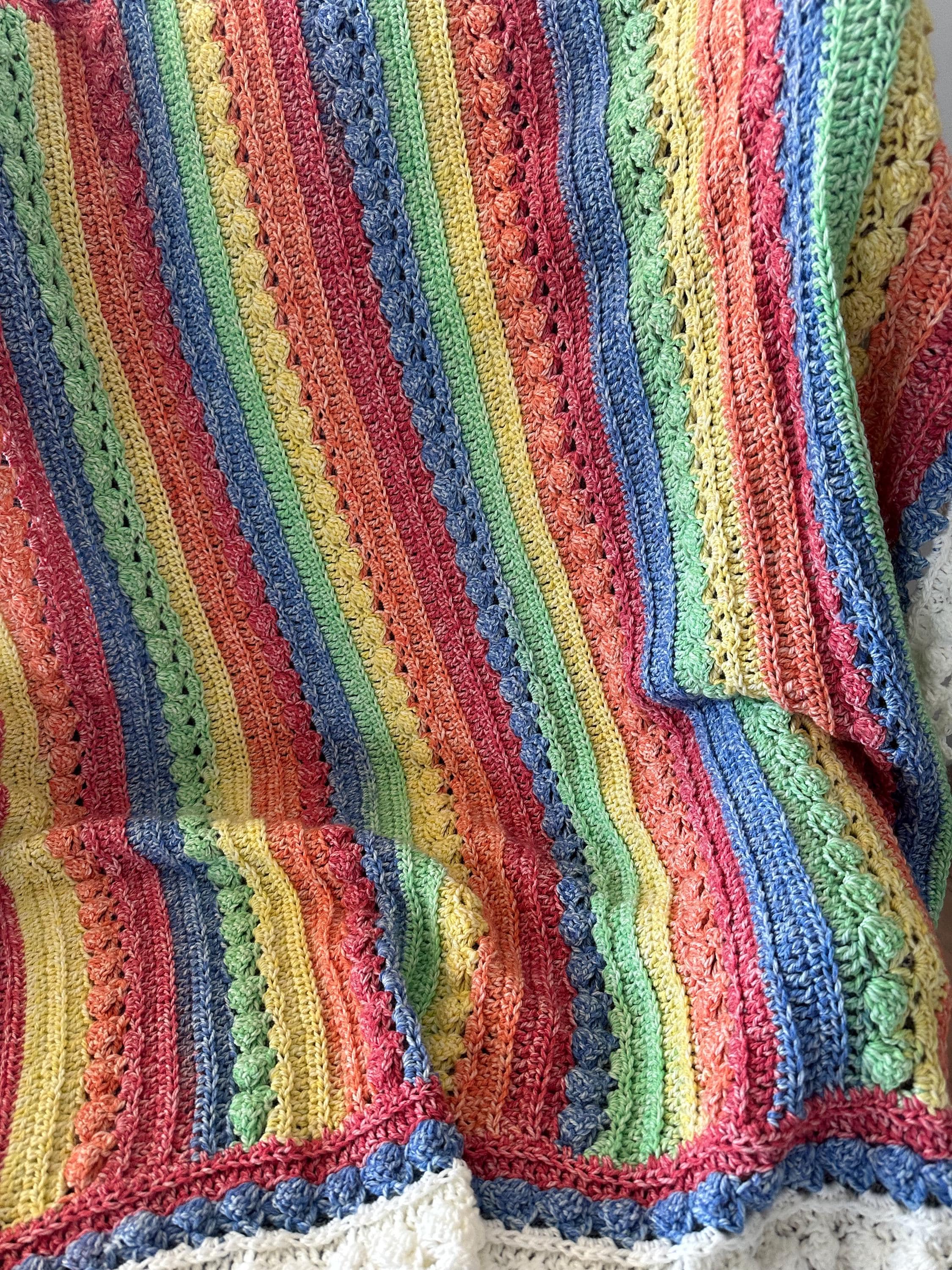 BOHO rainbow baby blanket hand crocheted in bold self striping primary colors and an off white edge. These are super soft quality baby yarns. Beautiful colors! Approximately 36 x 40