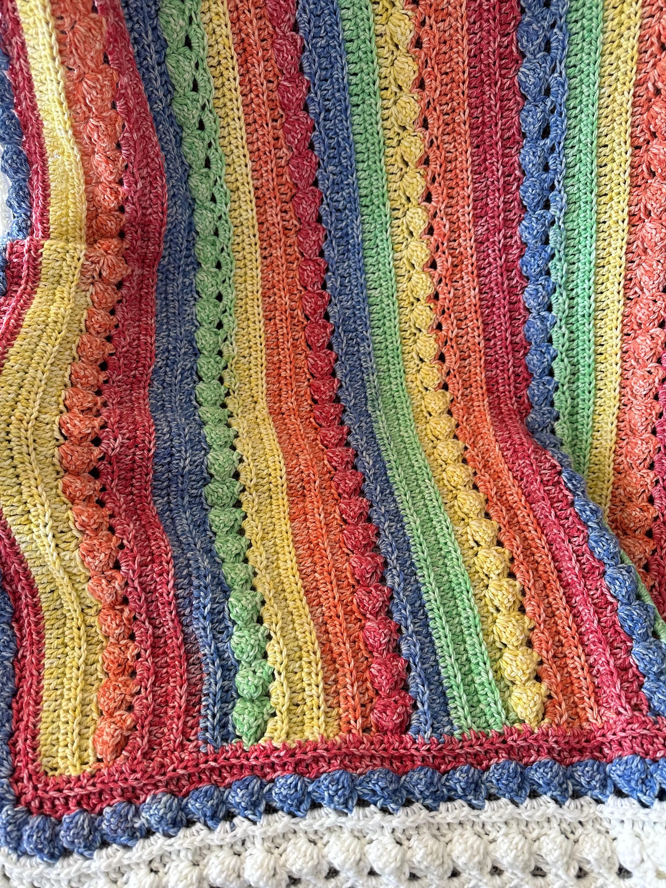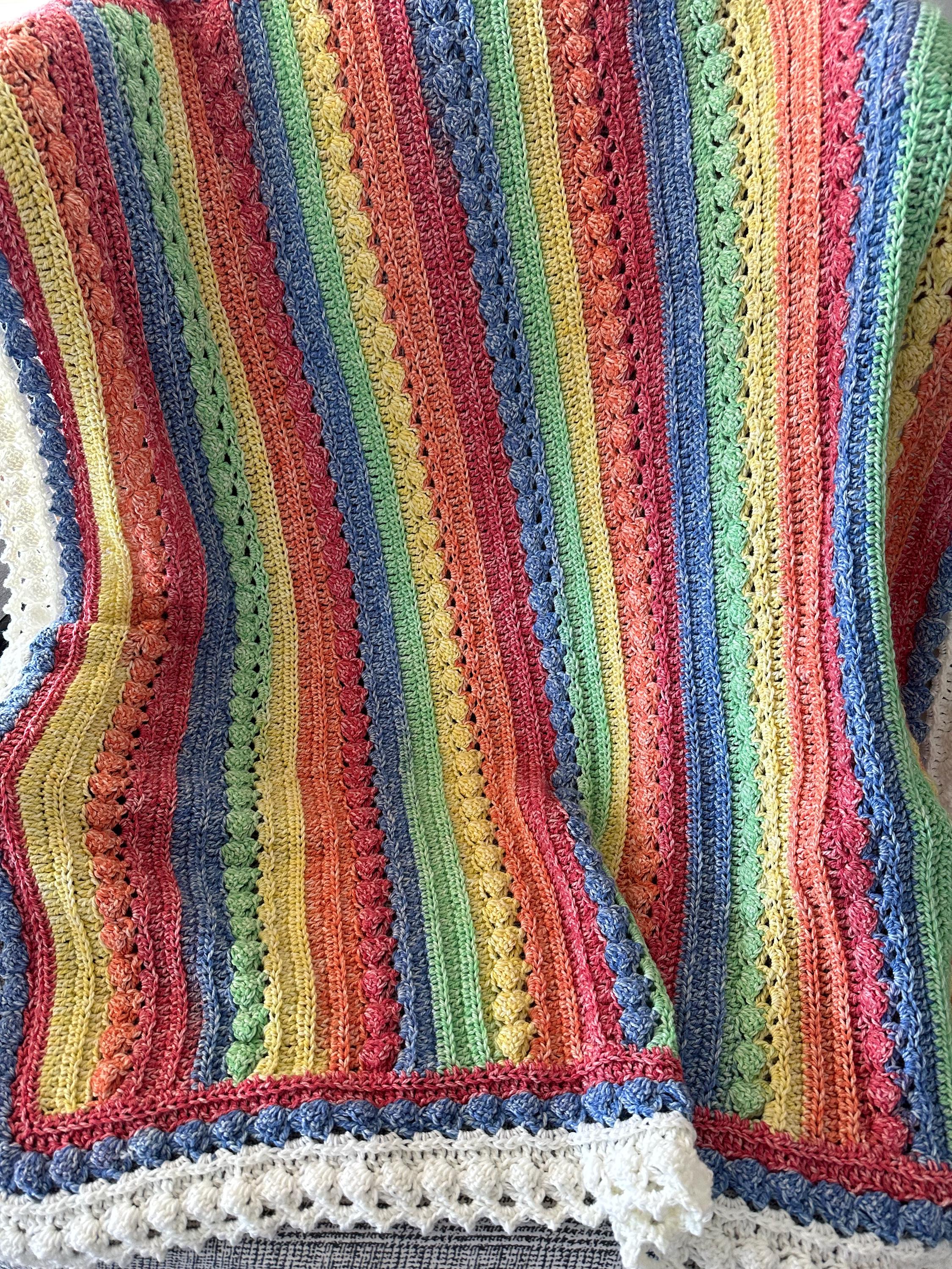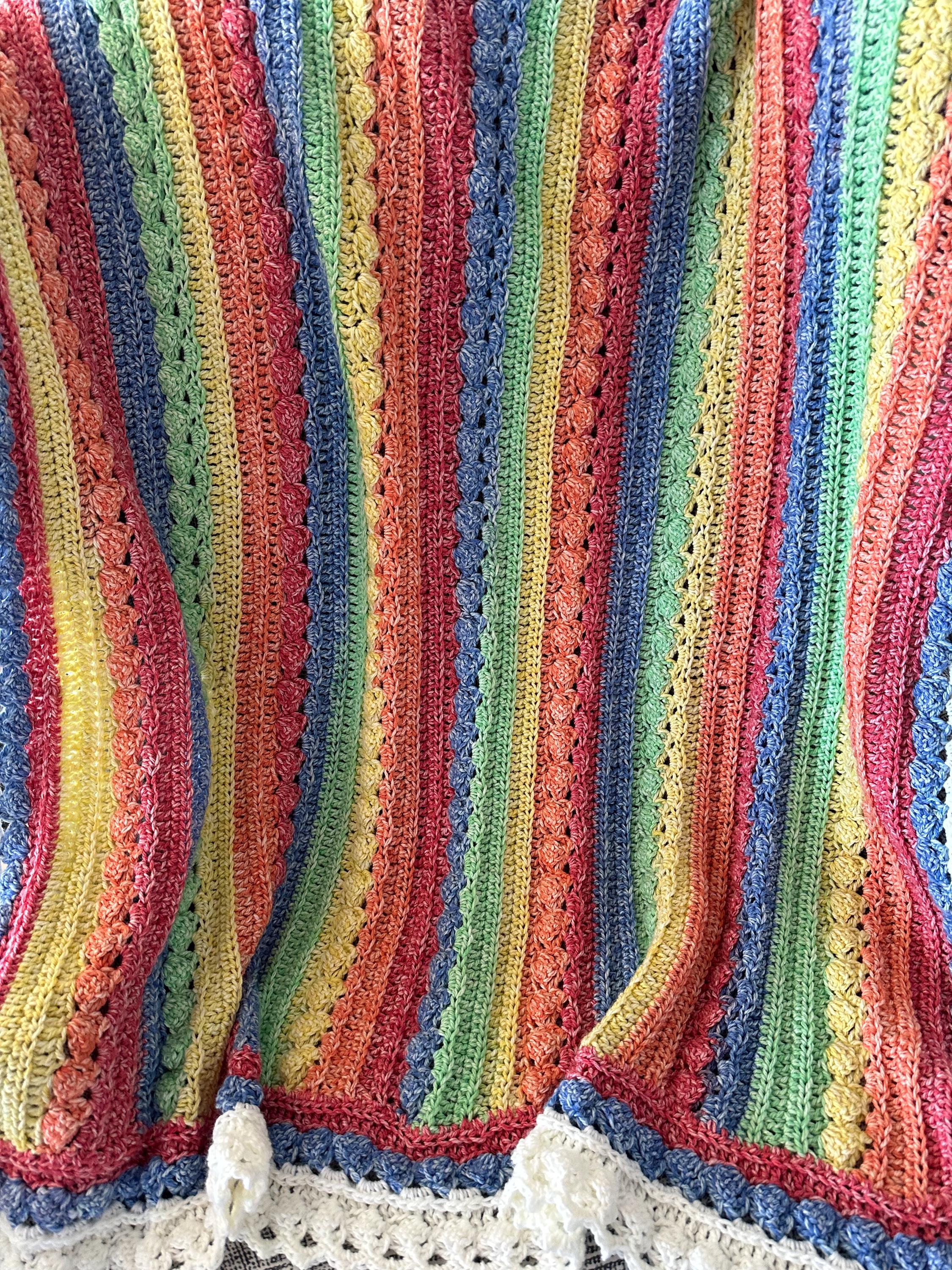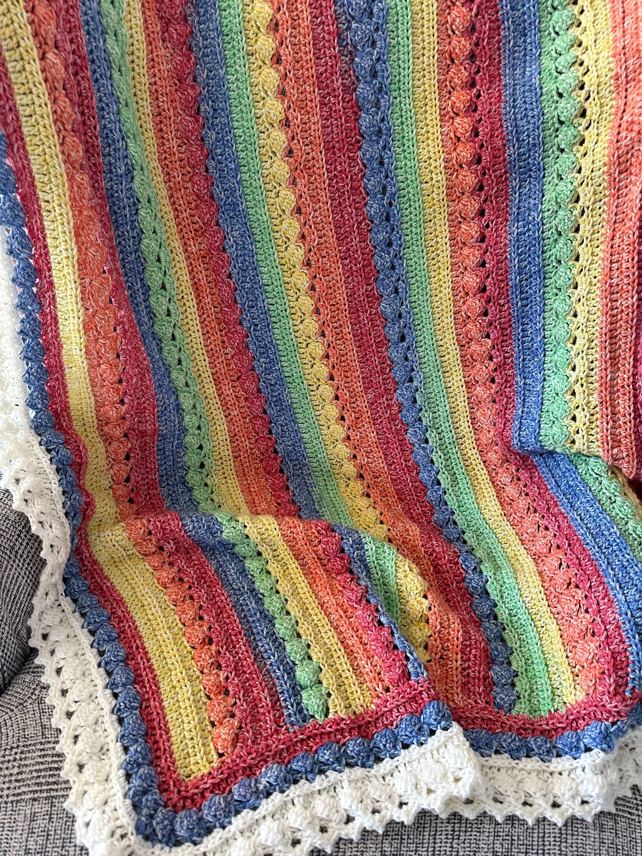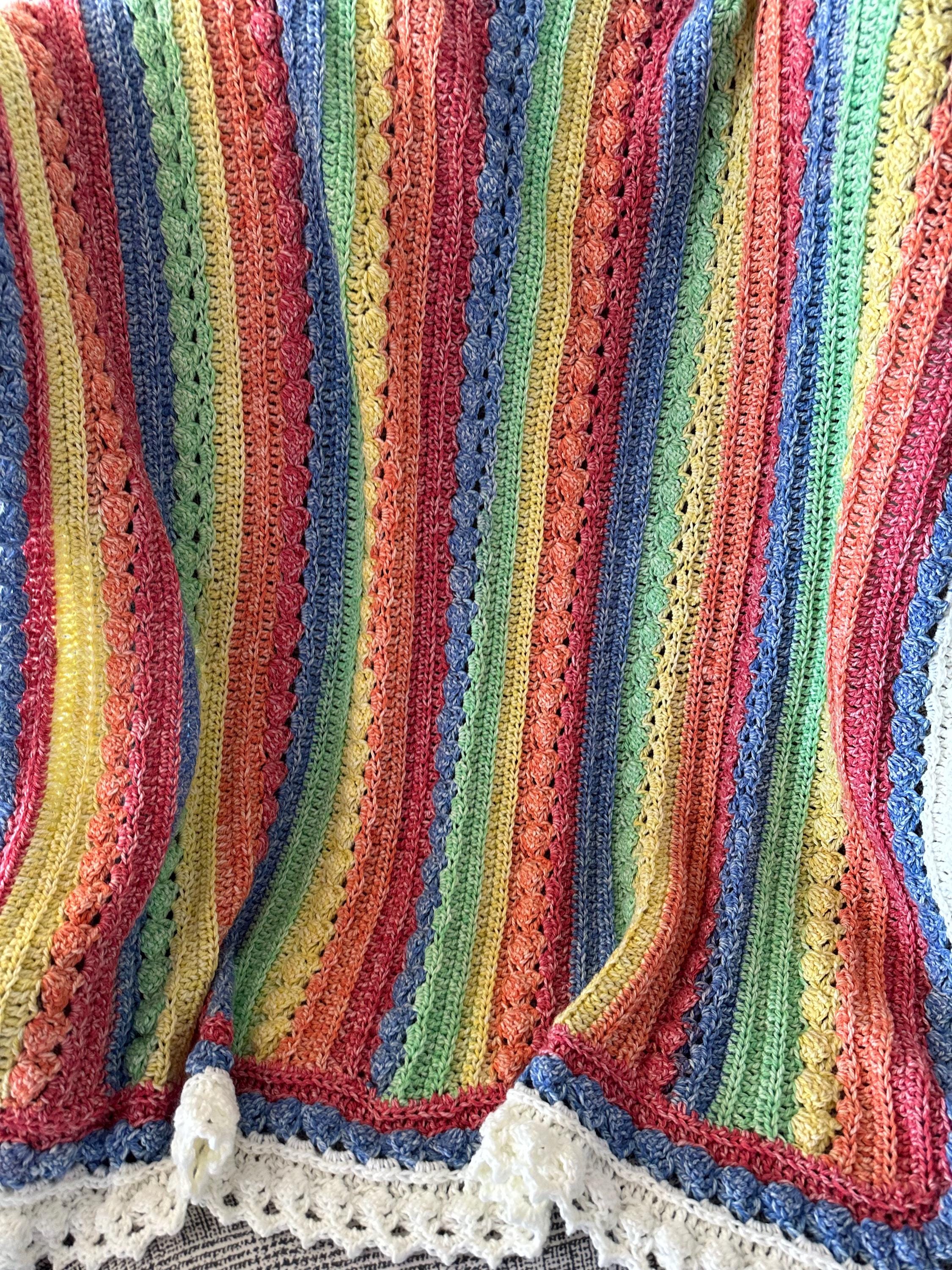 BOHO rainbow baby blanket hand crocheted in bold self striping primary colors and an off white edge. These are super soft quality baby yarns. Beautiful colors! Approximately 36 x 40
