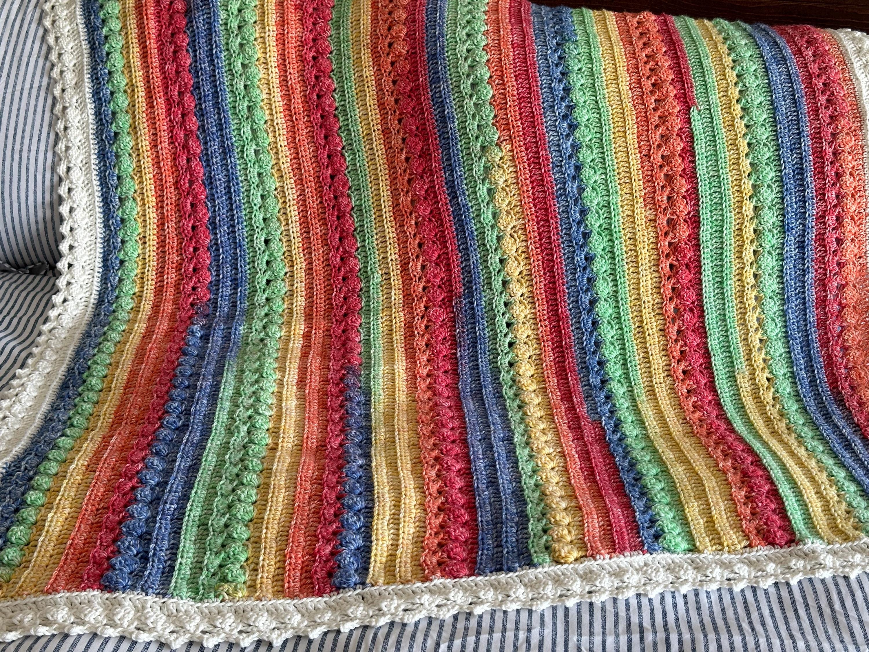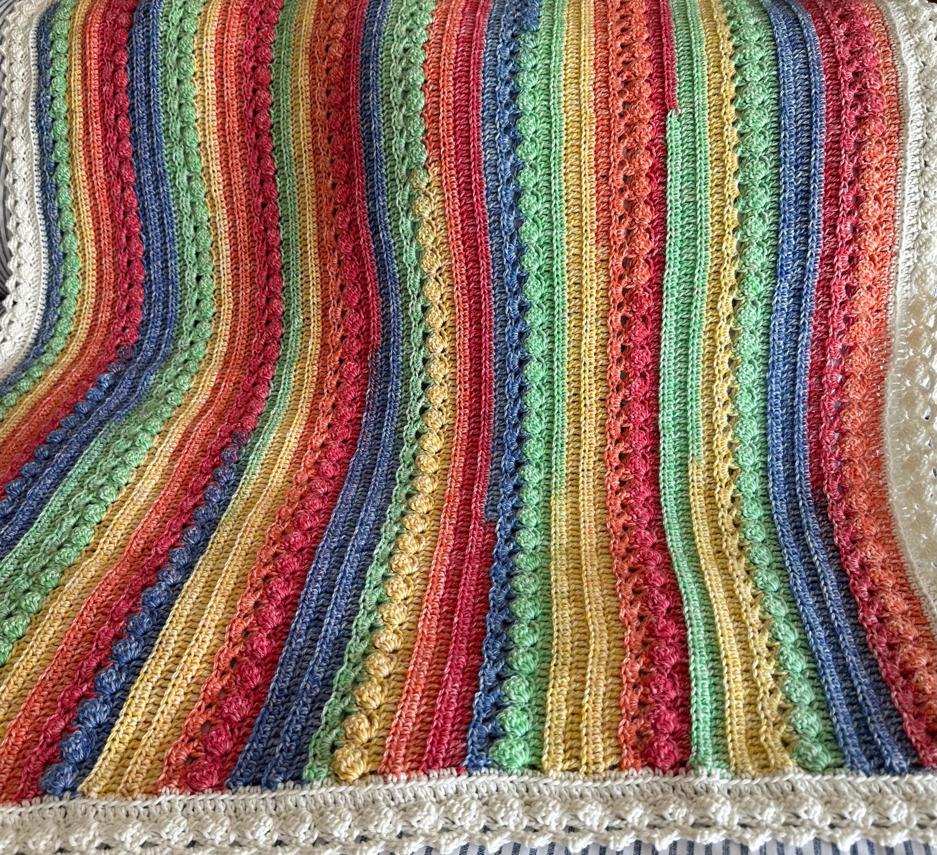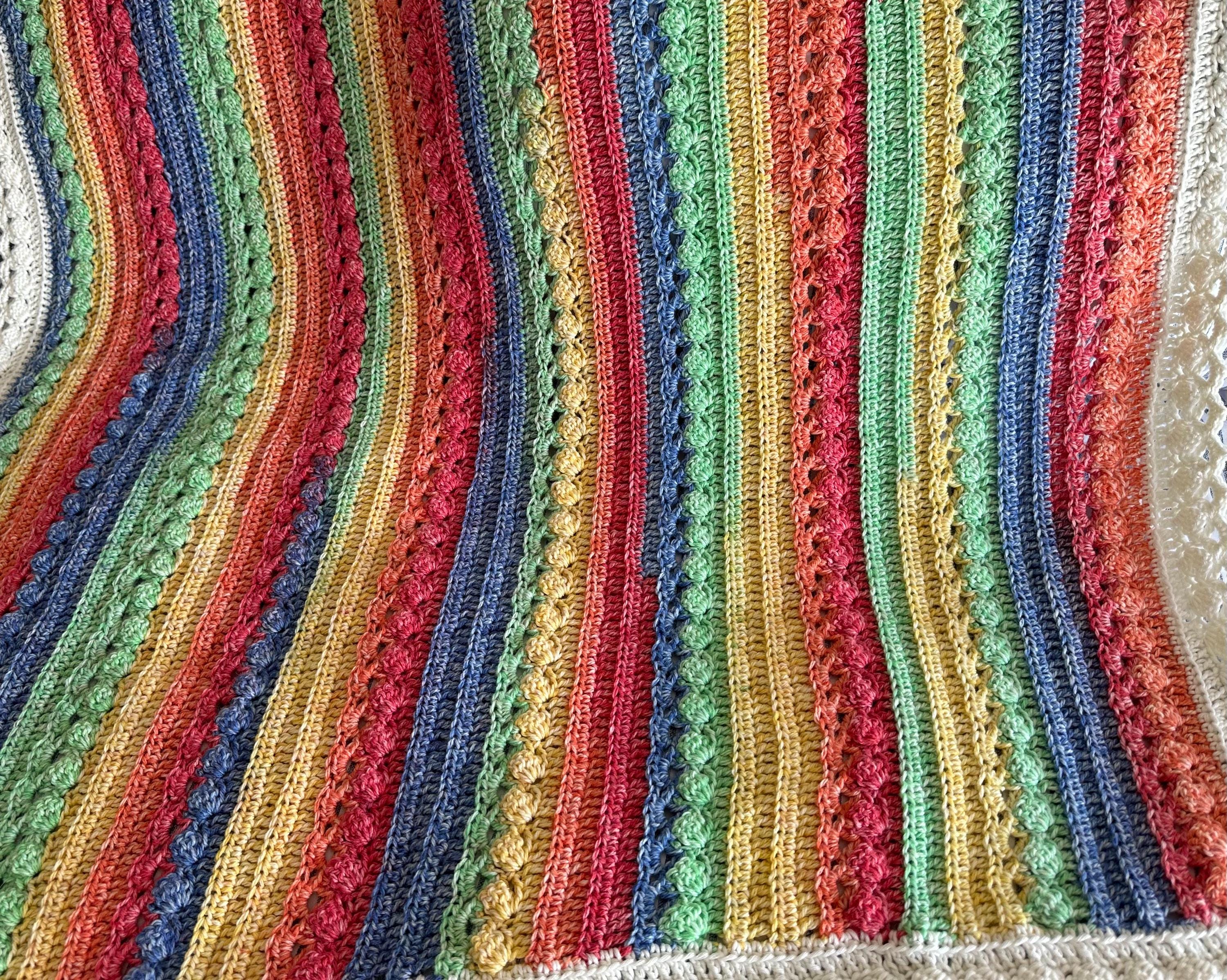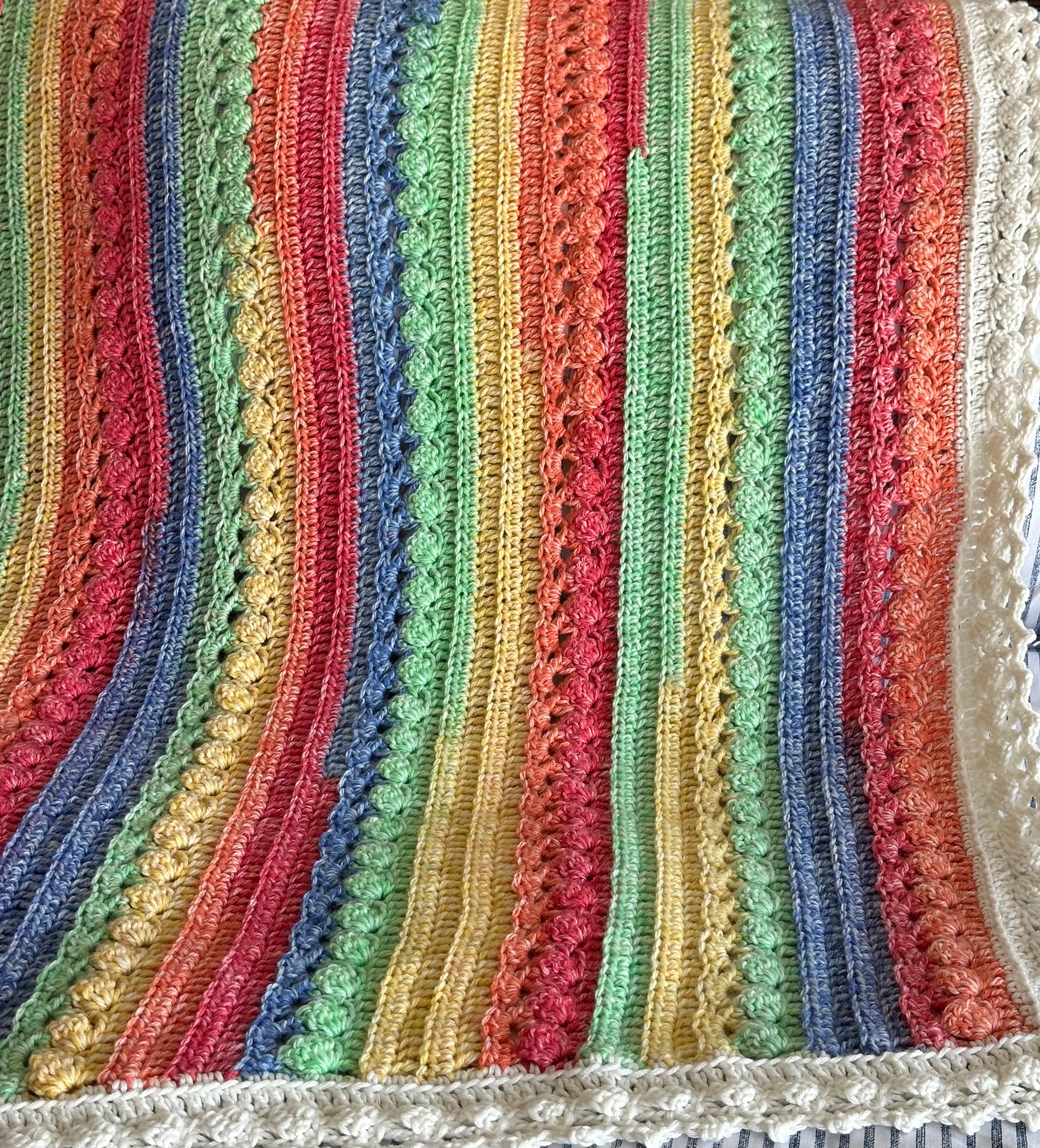 BOHO rainbow baby blanket hand crocheted in bold self striping primary colors and an off white edge. These are super soft quality baby yarns. Beautiful colors! Approximately 38 x 38