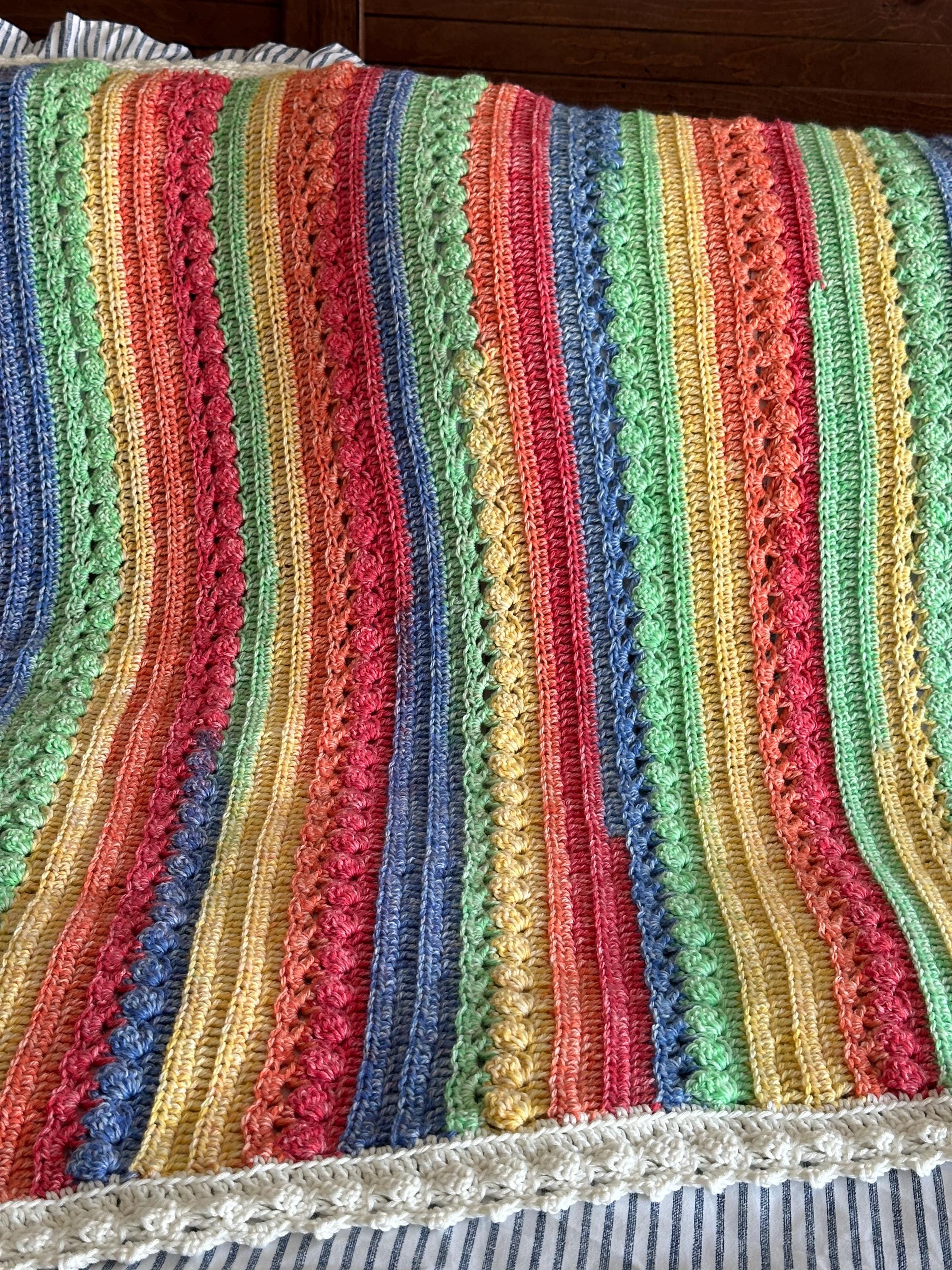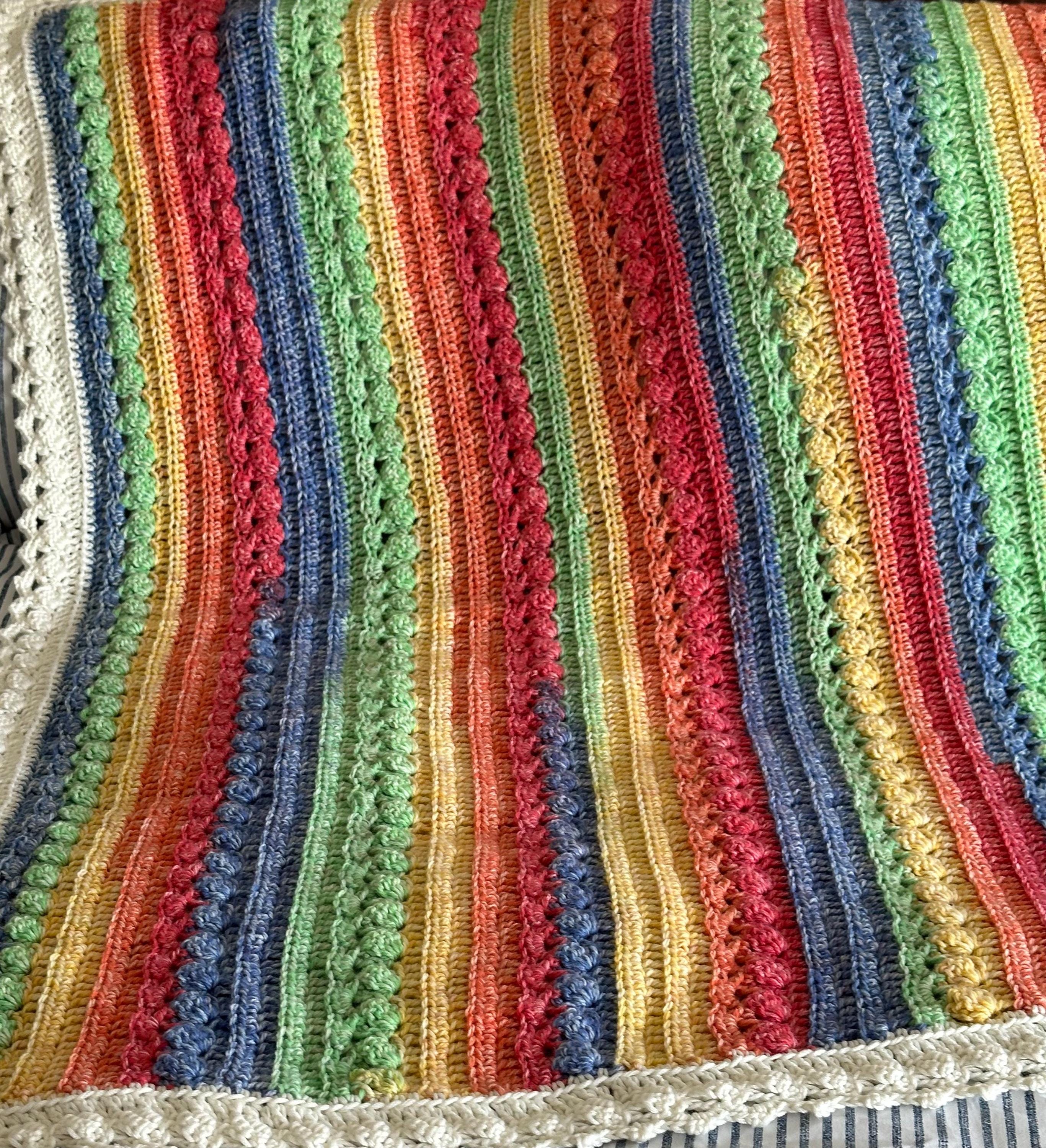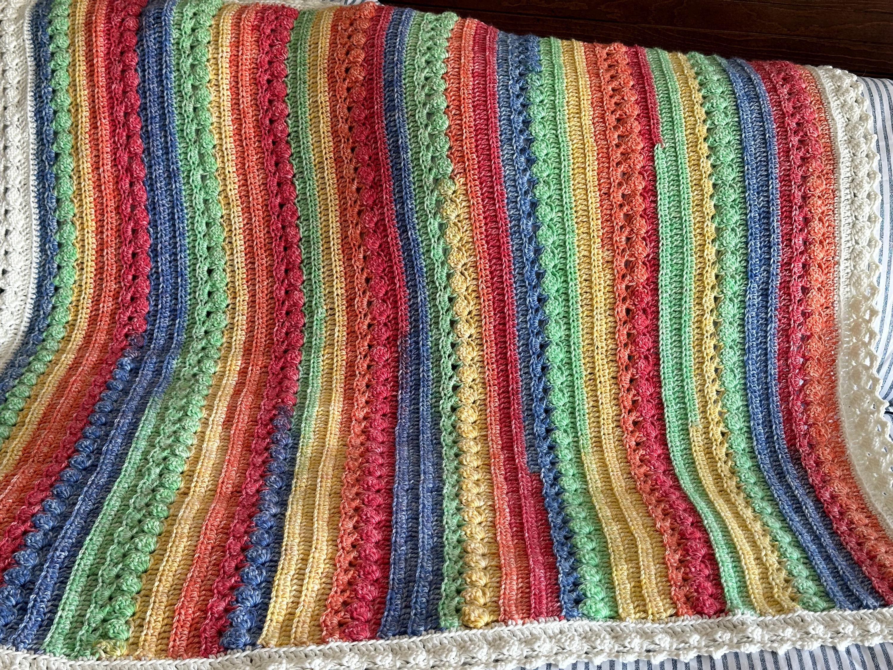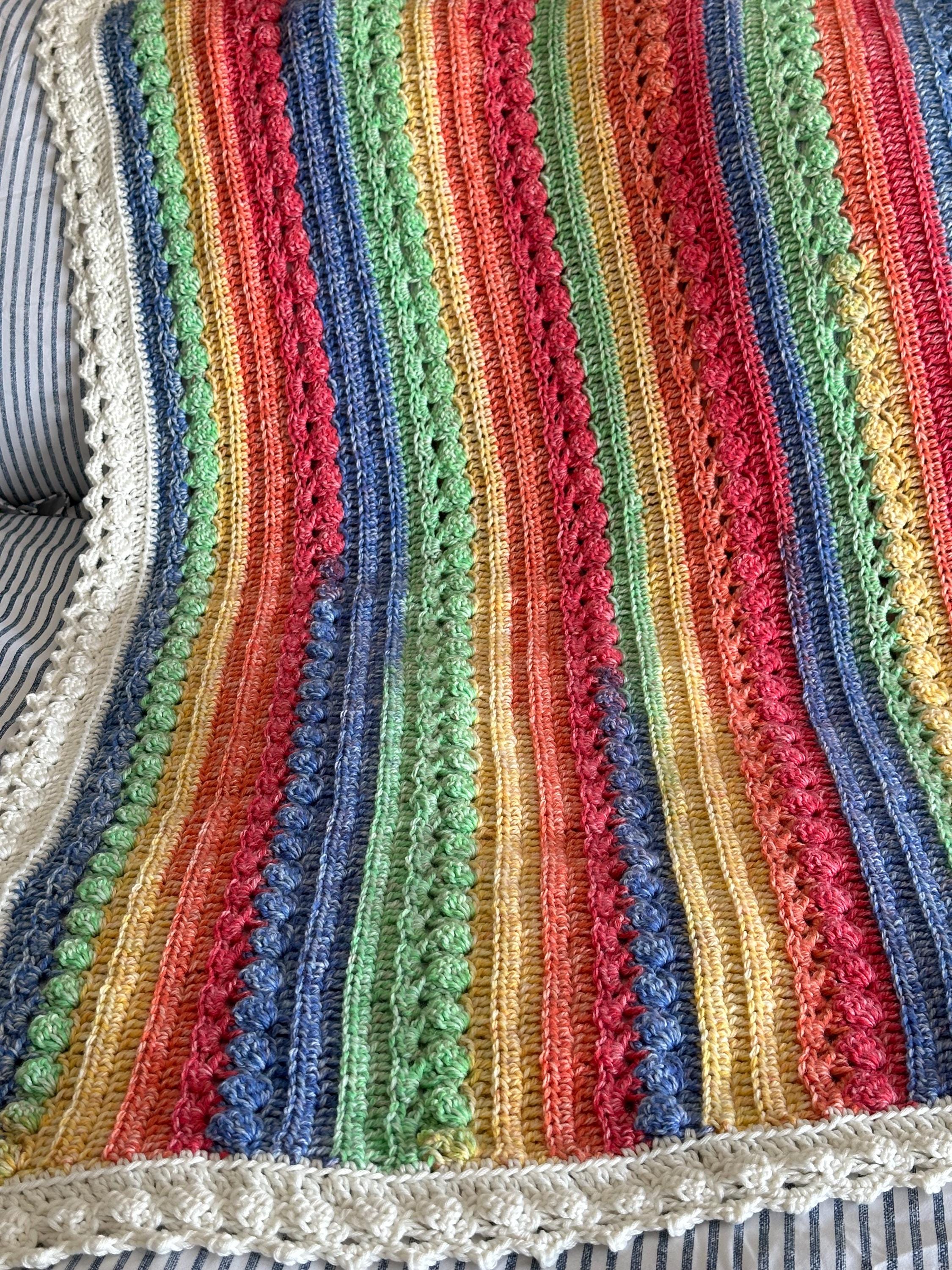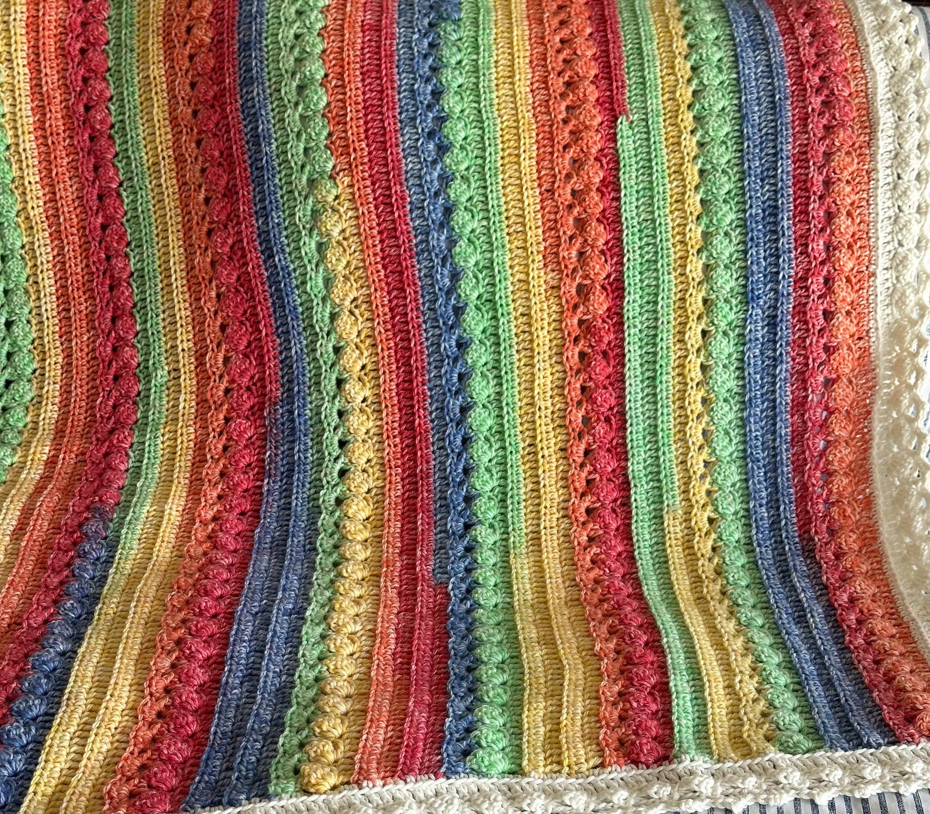 BOHO rainbow baby blanket hand crocheted in bold self striping primary colors and an off white edge. These are super soft quality baby yarns. Beautiful colors! Approximately 38 x 38