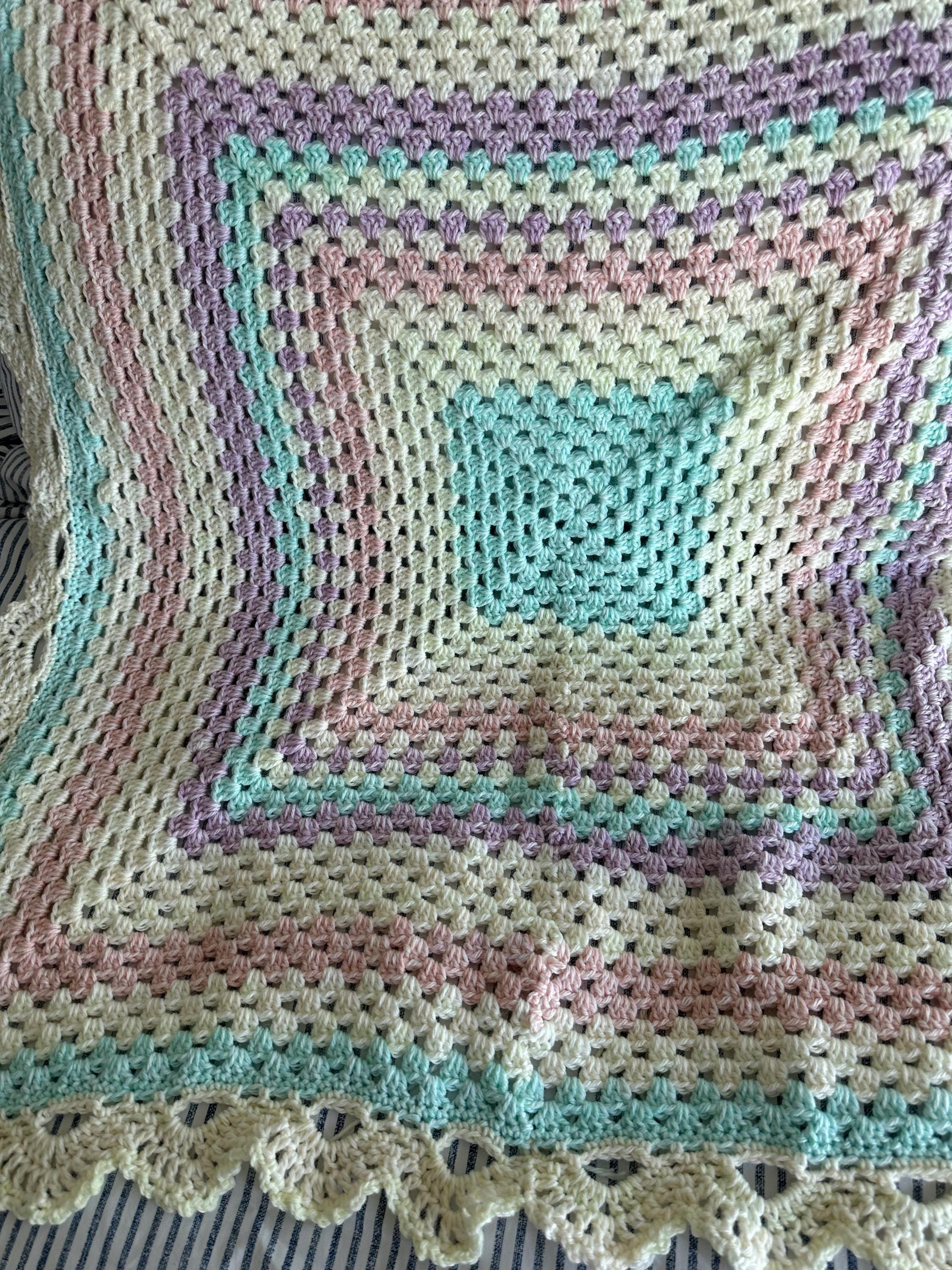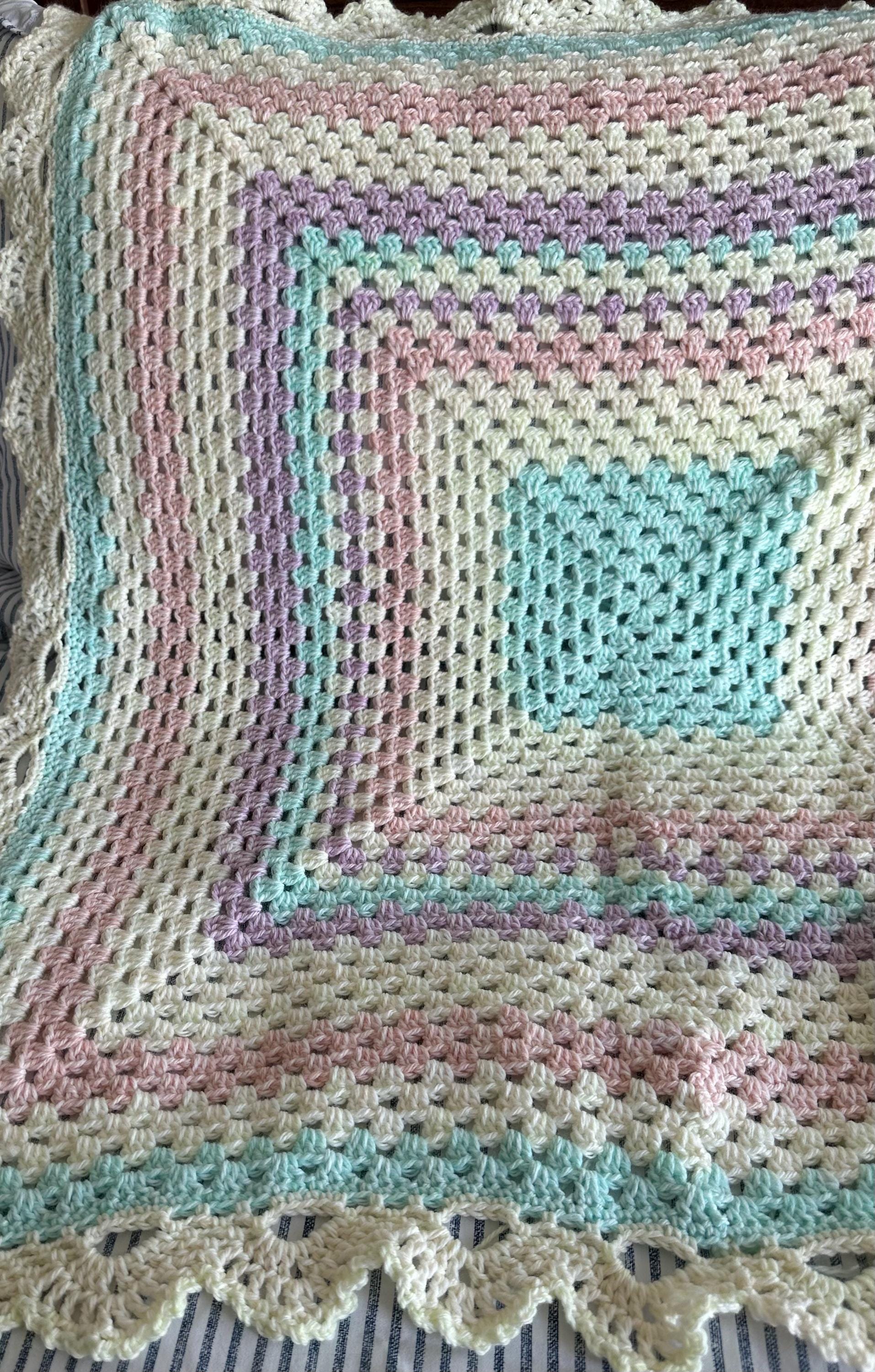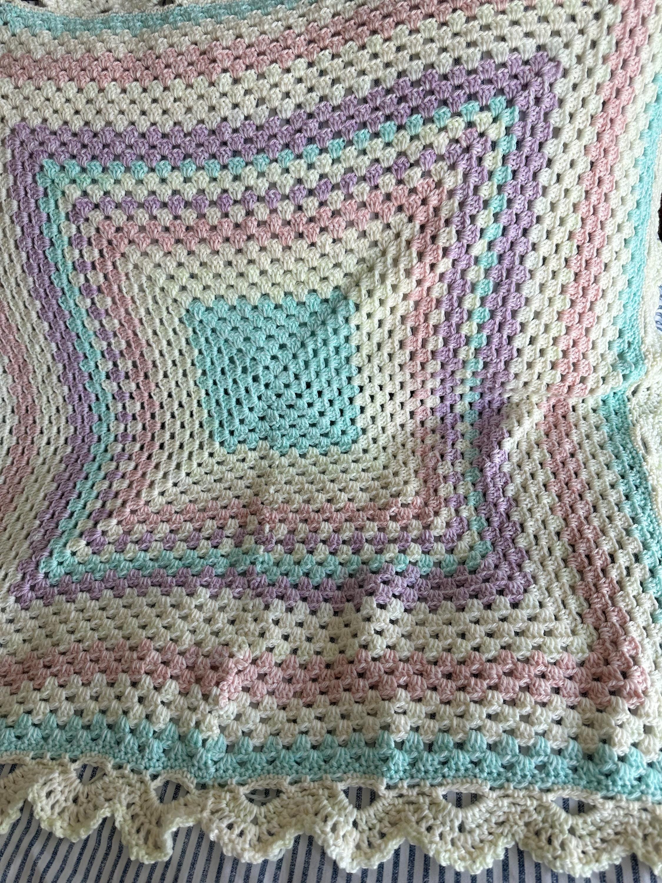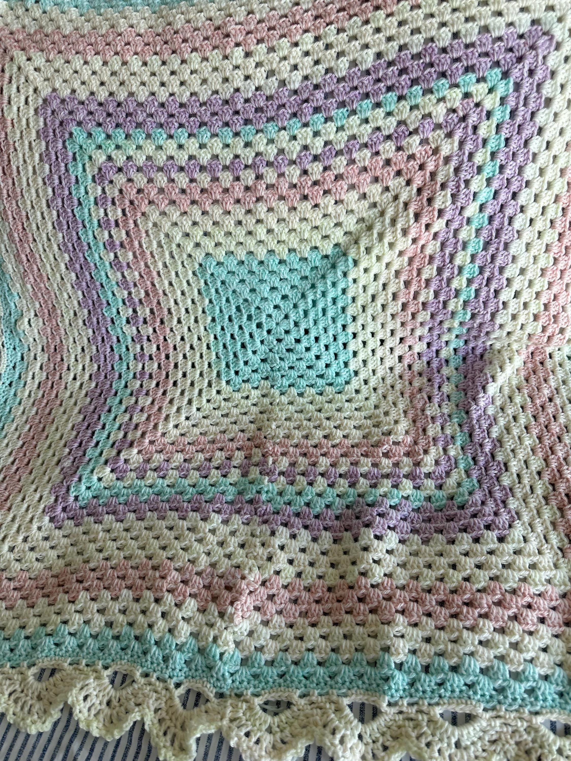 Beautiful pastel granny square baby blanket in SoHo rainbow colors with creamy lace edge. Super soft baby crocheted blanket in a wonderful NEW granny square Baby Tucker’s design.