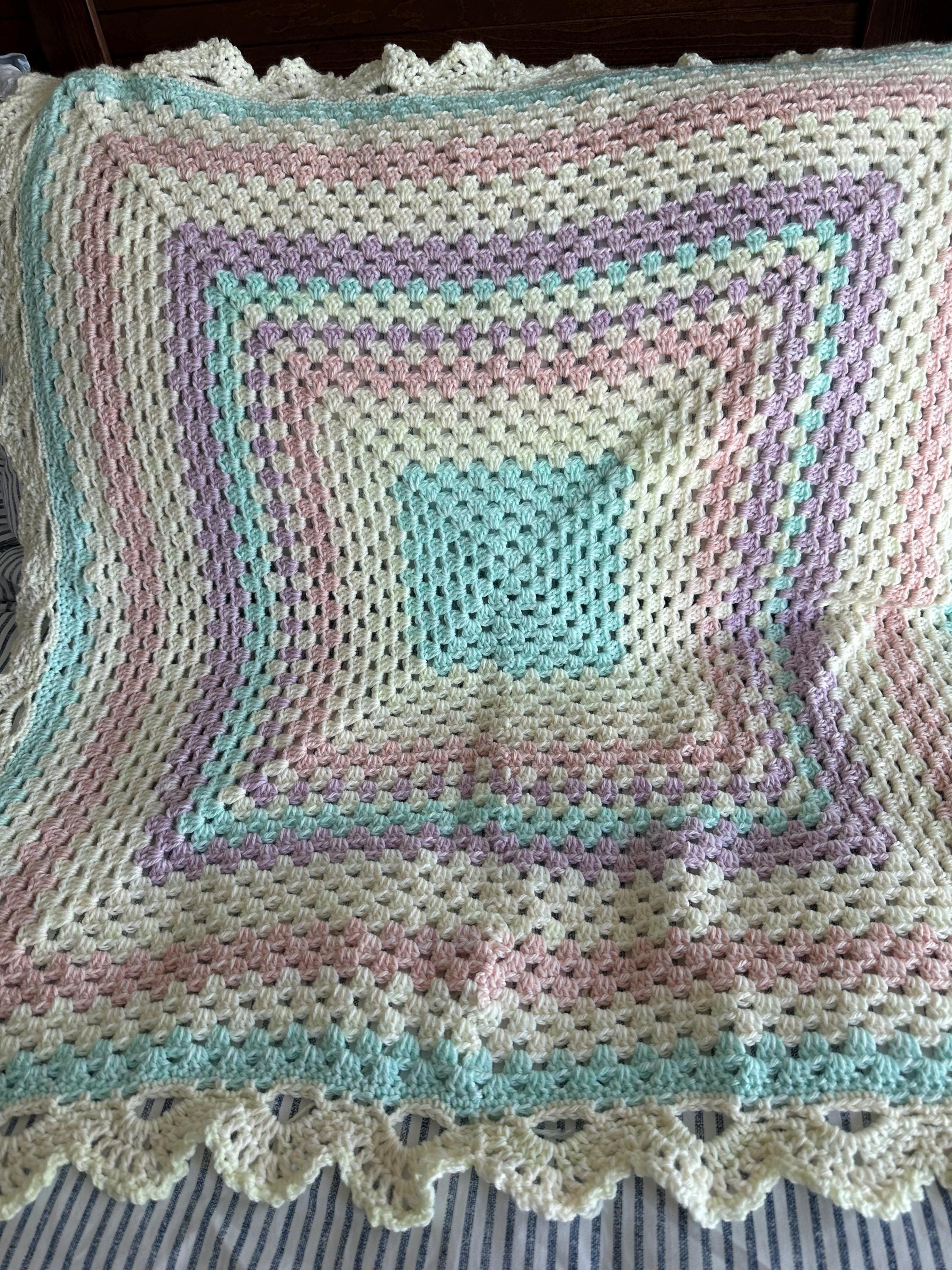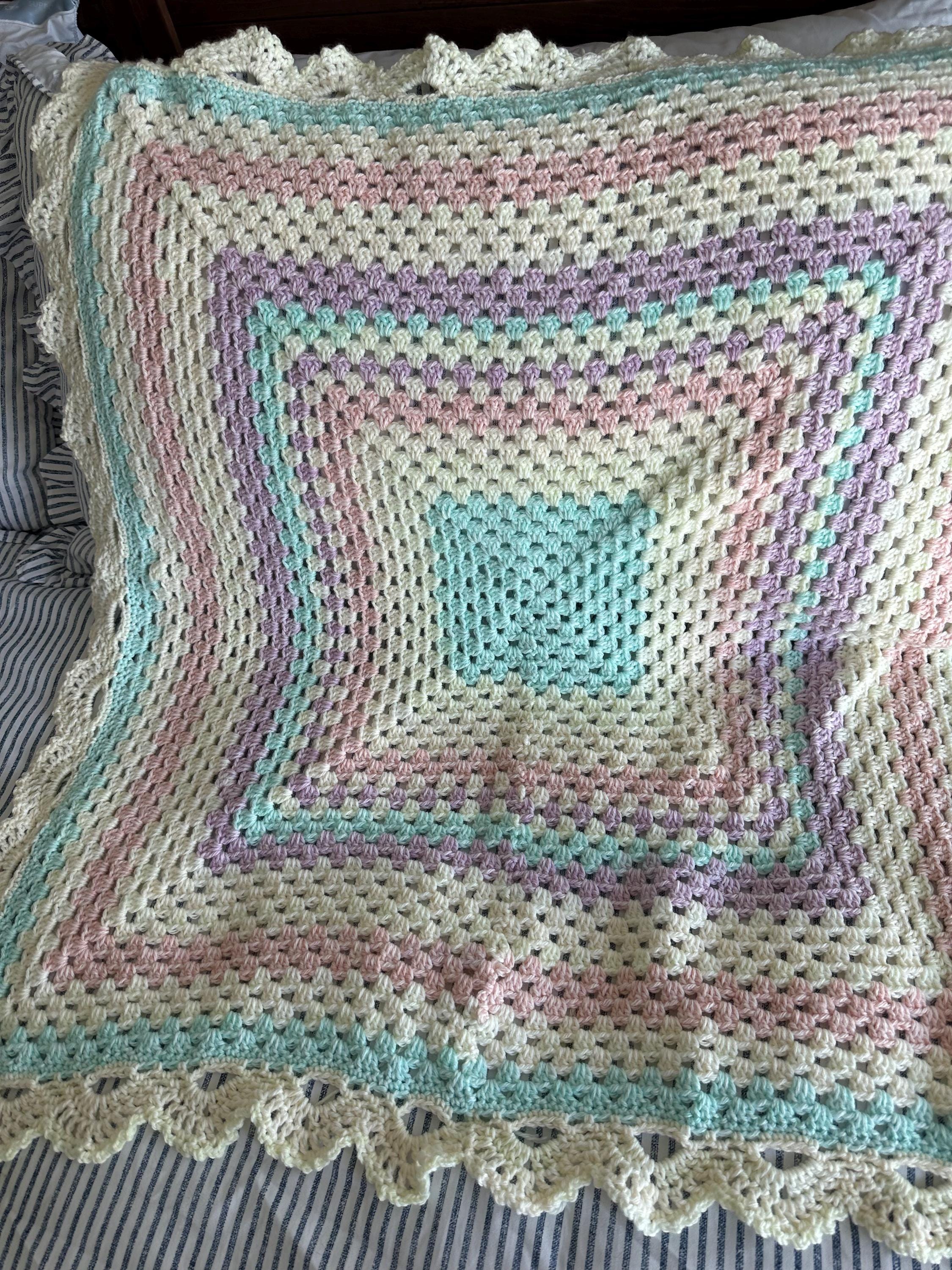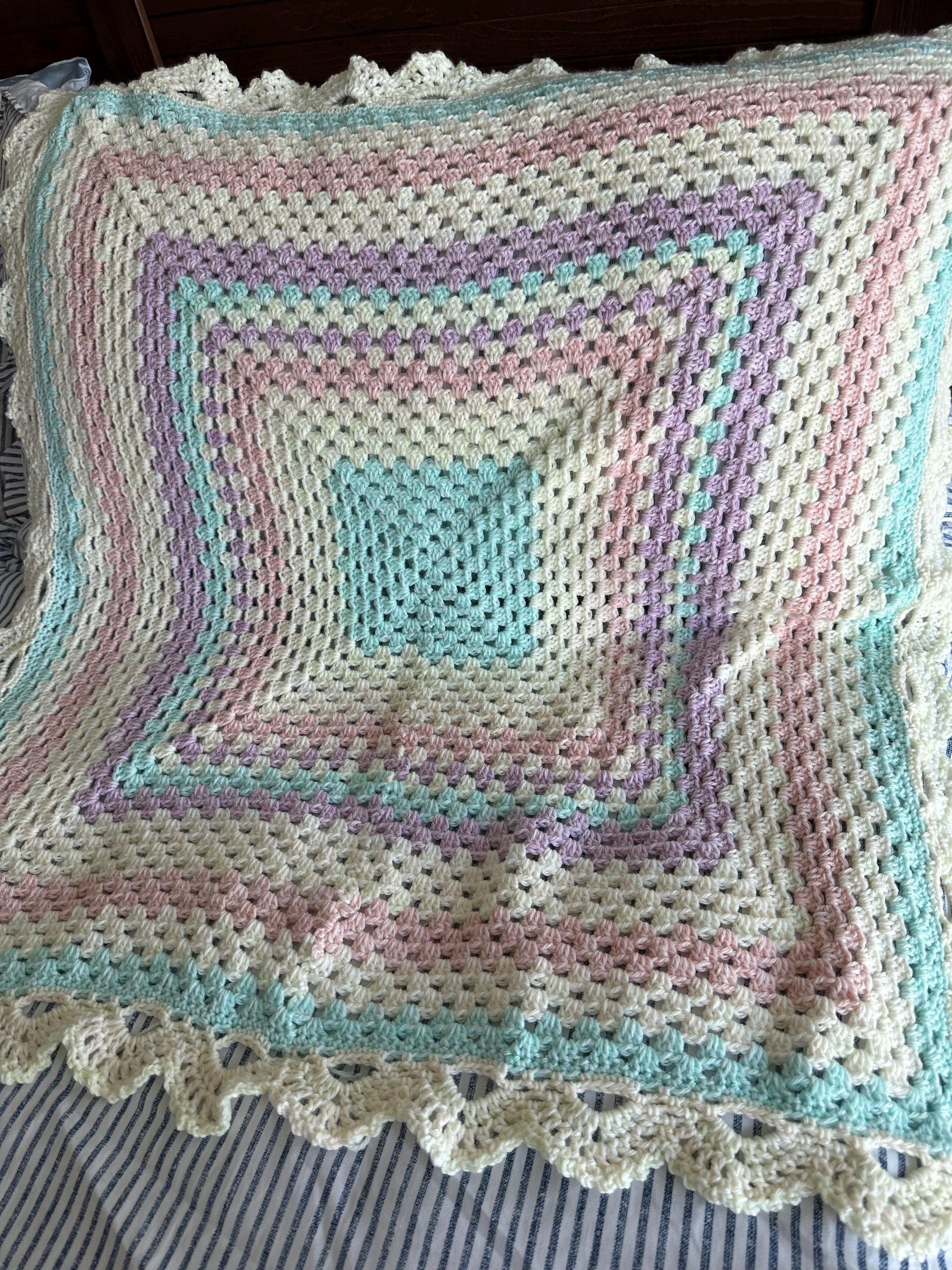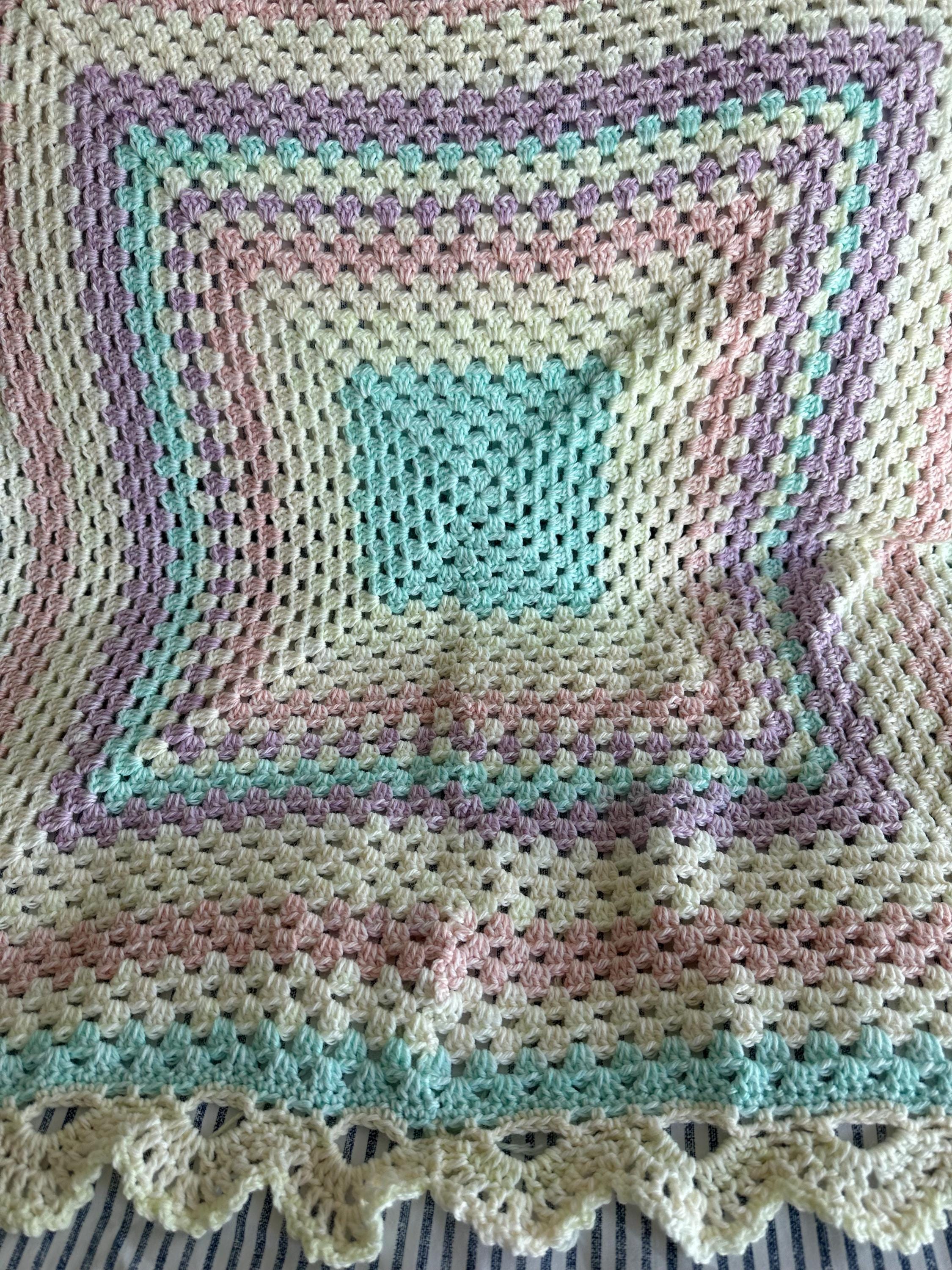 Beautiful pastel granny square baby blanket in SoHo rainbow colors with creamy lace edge. Super soft baby crocheted blanket in a wonderful NEW granny square Baby Tucker’s design.