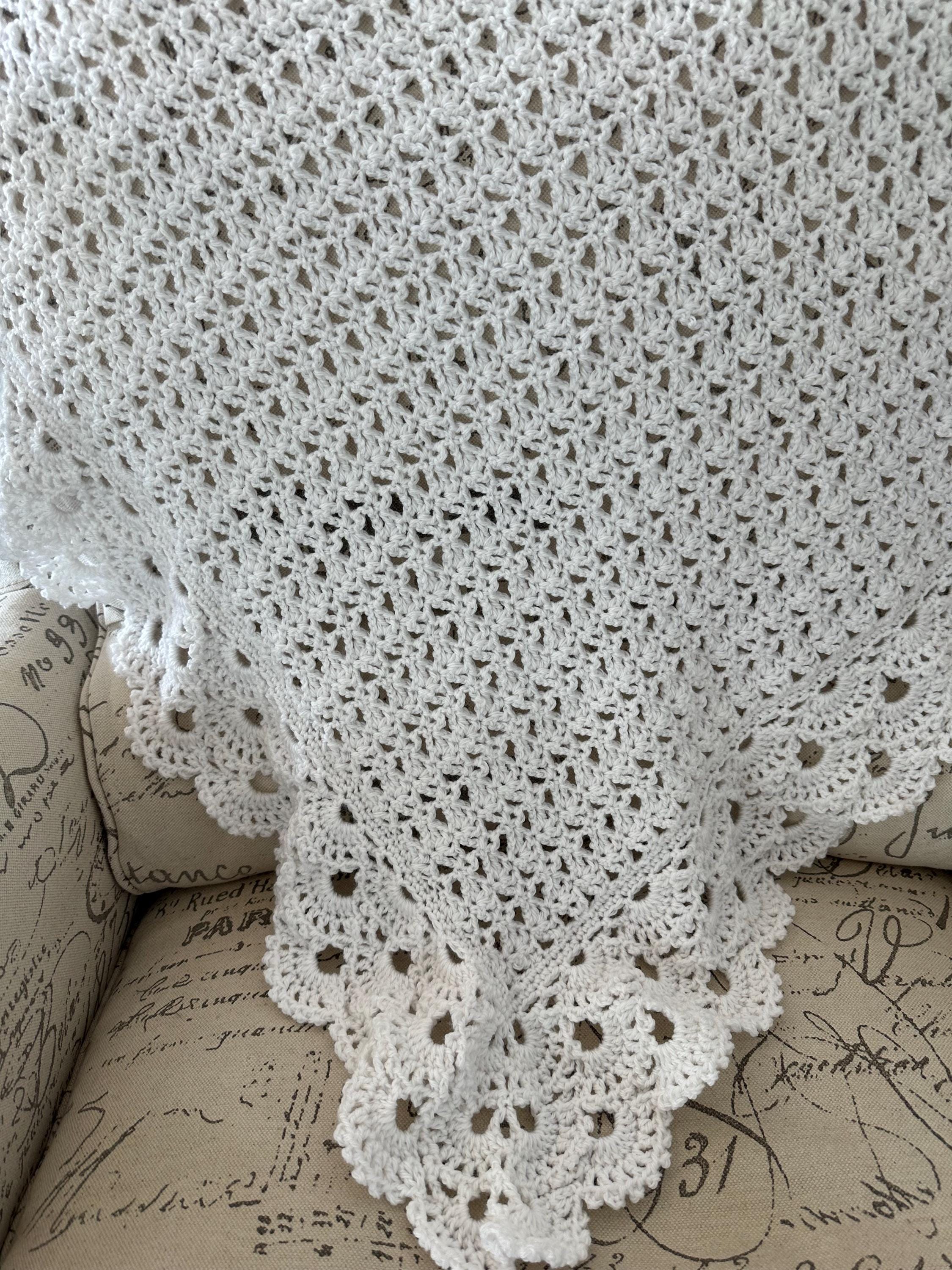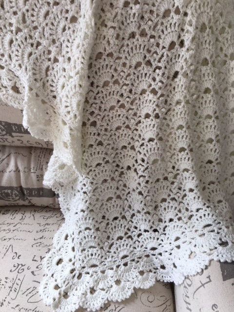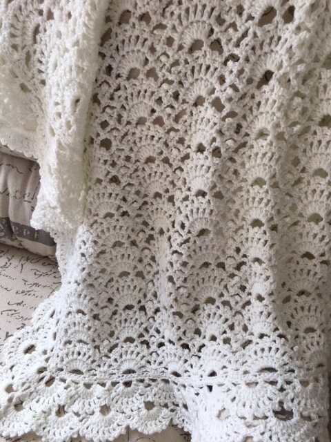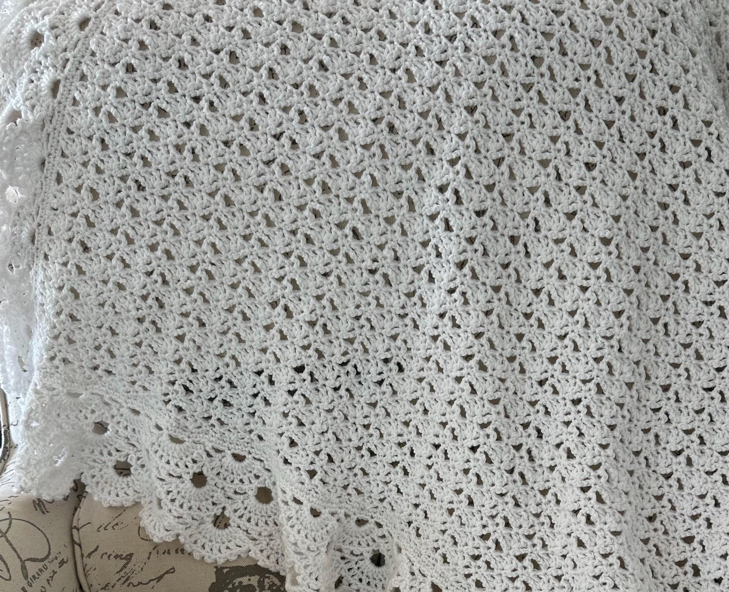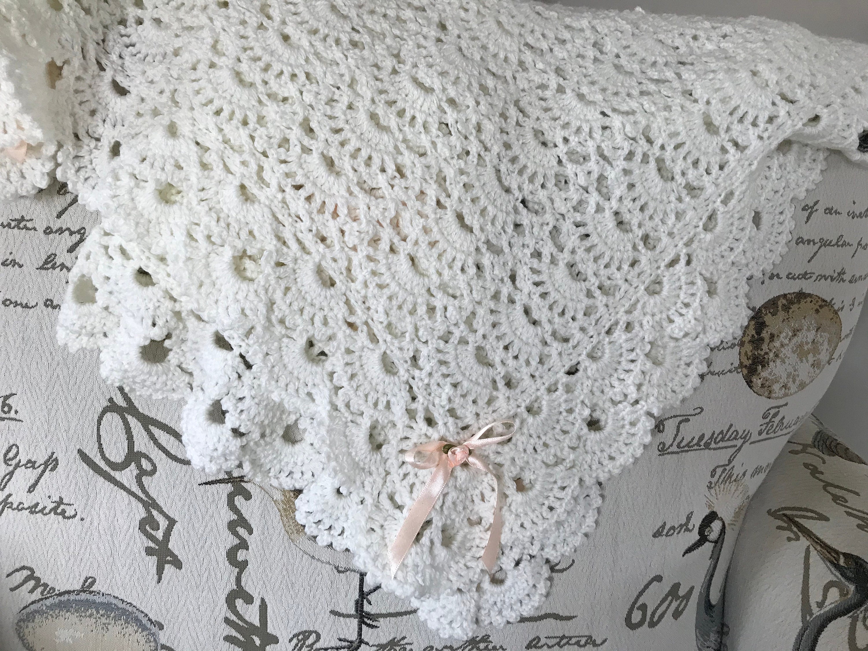 Custom Crochet baby blanket in white, in soft Paton Beehive Baby QUALITY yarn. Approximately 36 x 40 Baby Tuckers fan design with 3 tier intricate picot edging. With or without satin bows and rosettes in each corner. This is a stunning design. Beautiful detail. Custom, unique Baby Tuckers original.
