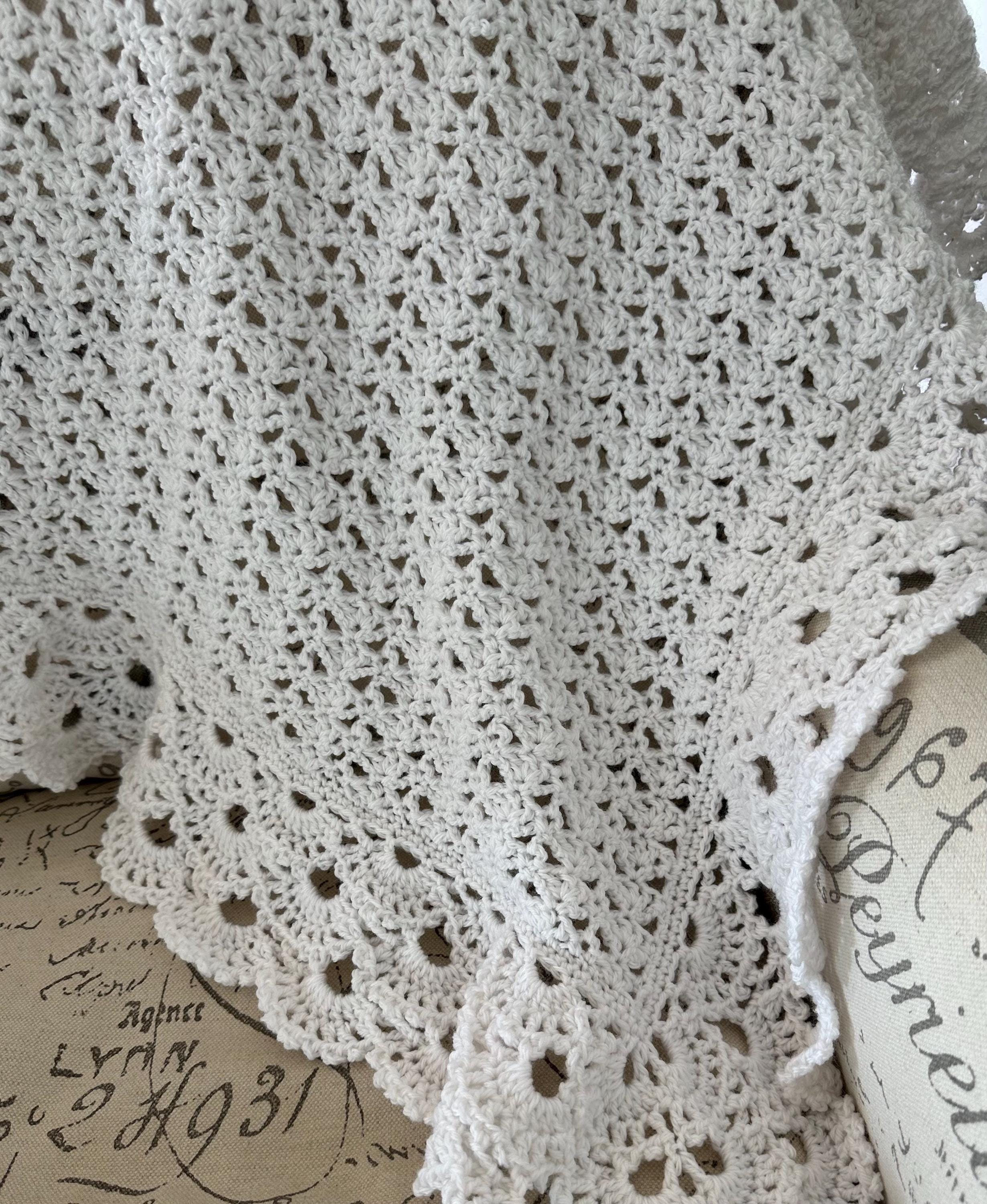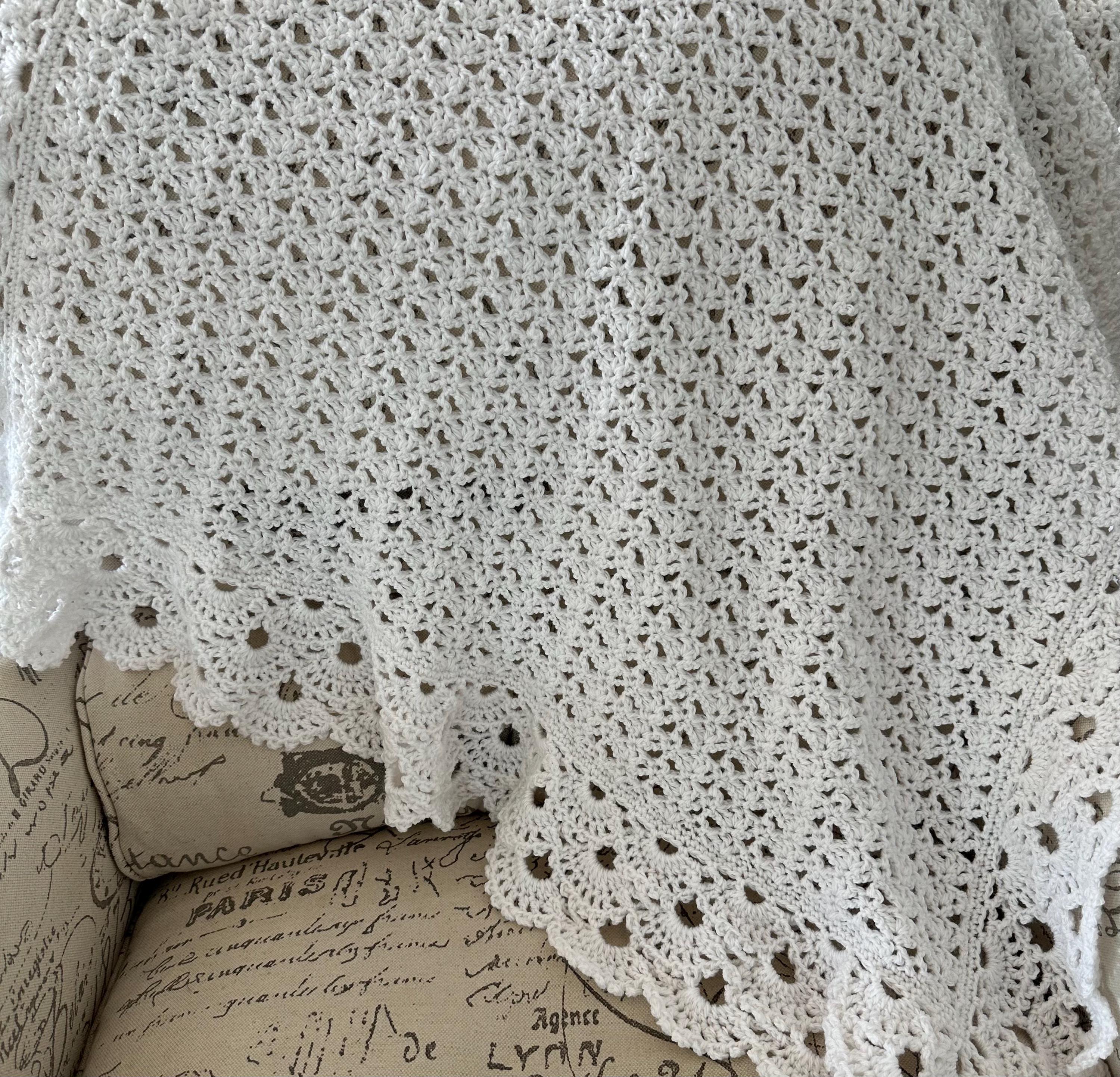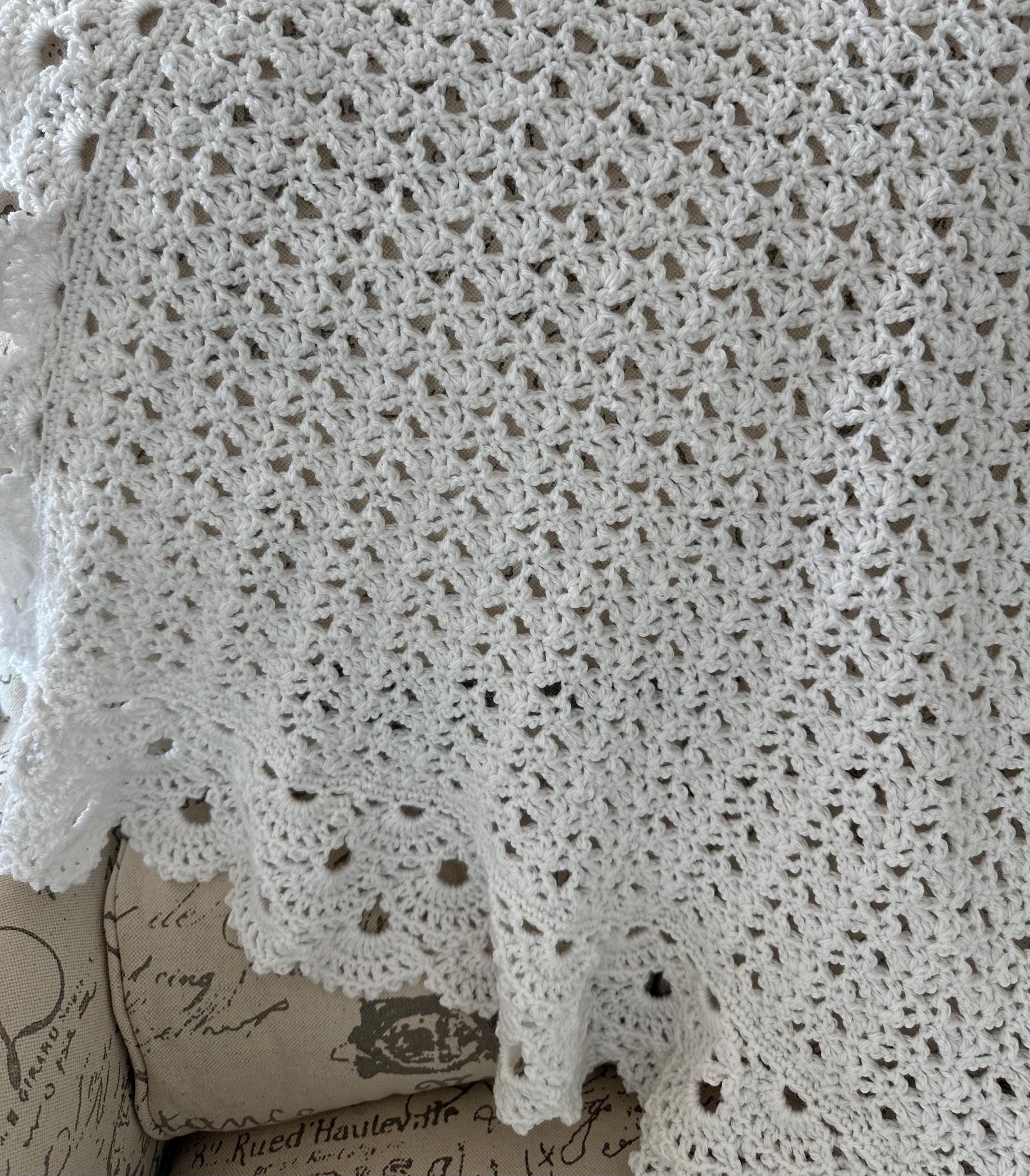 Custom Crochet baby blanket in white, in soft Paton Beehive Baby QUALITY yarn. Approximately 36 x 40 Baby Tuckers fan design with 3 tier intricate picot edging. With or without satin bows and rosettes in each corner. This is a stunning design. Beautiful detail. Custom, unique Baby Tuckers original.