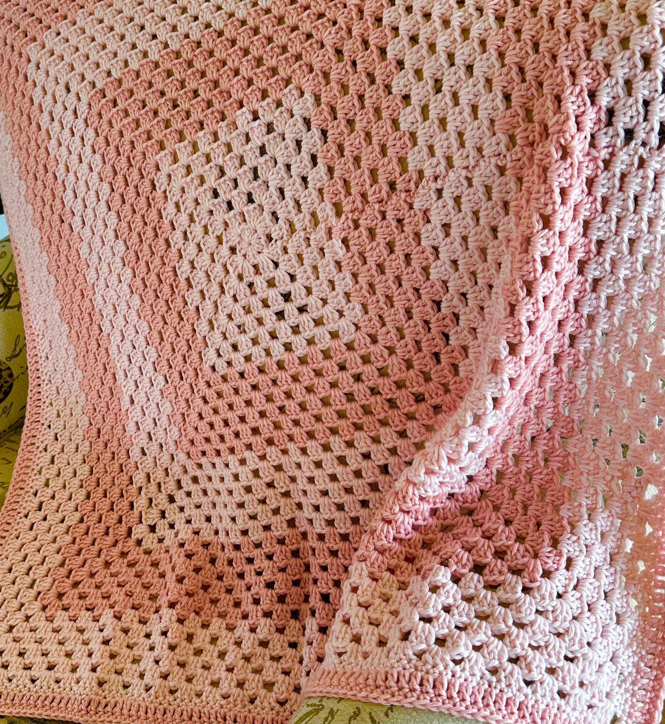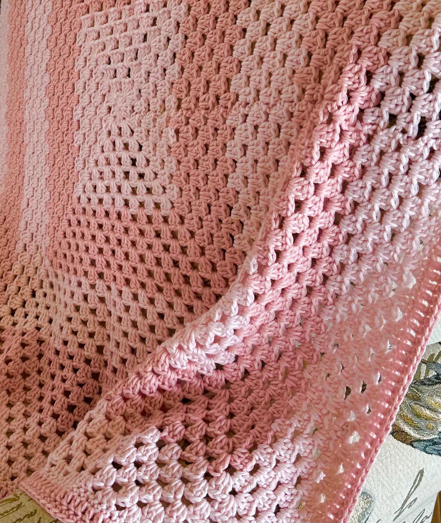 Beautiful crochet baby blanket handmade in baby pink and rose pink in granny square design. SoHo BOHO colors. Super soft baby crocheted blanket in a wonderful NEW granny square Baby Tucker’s design.