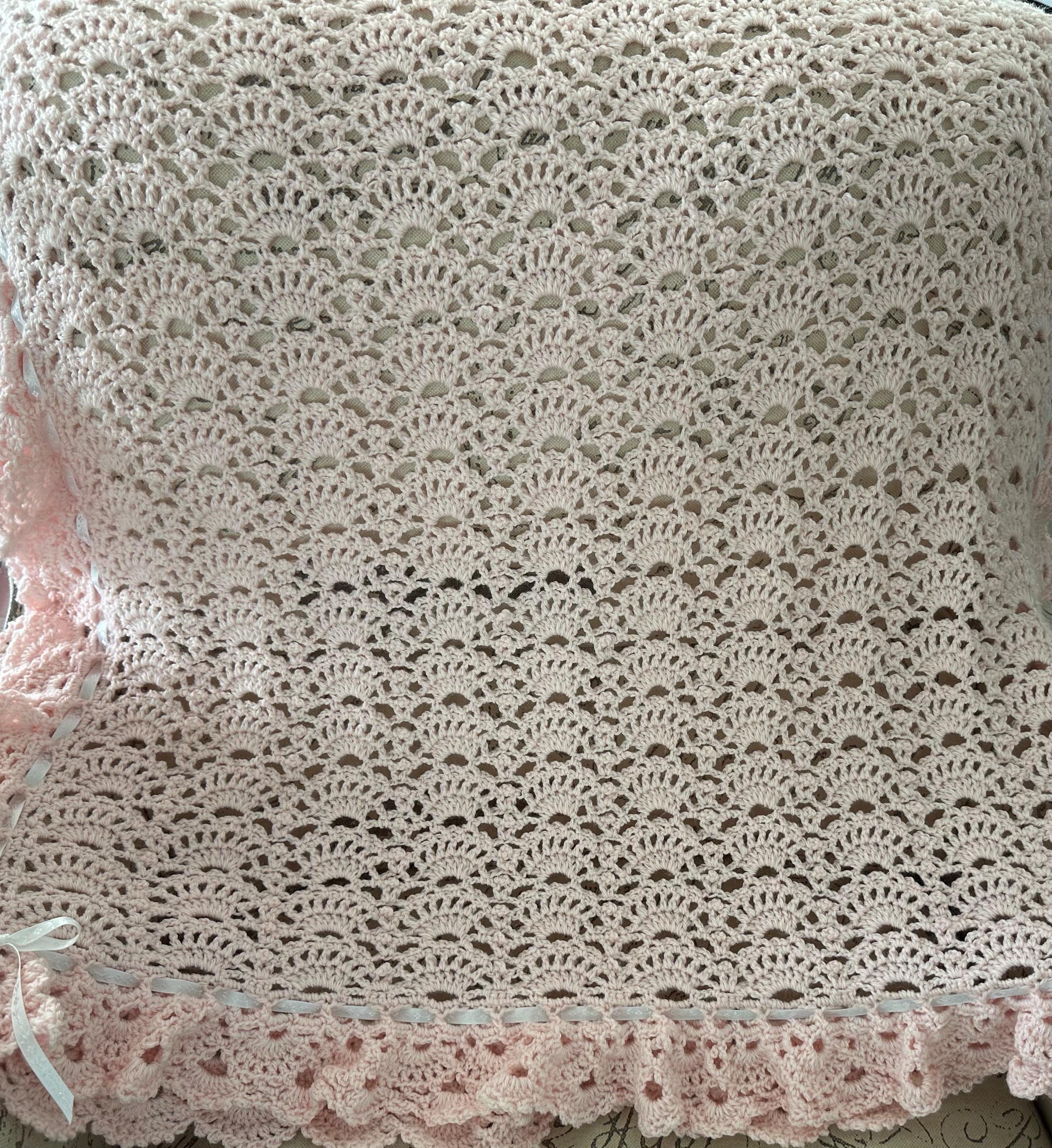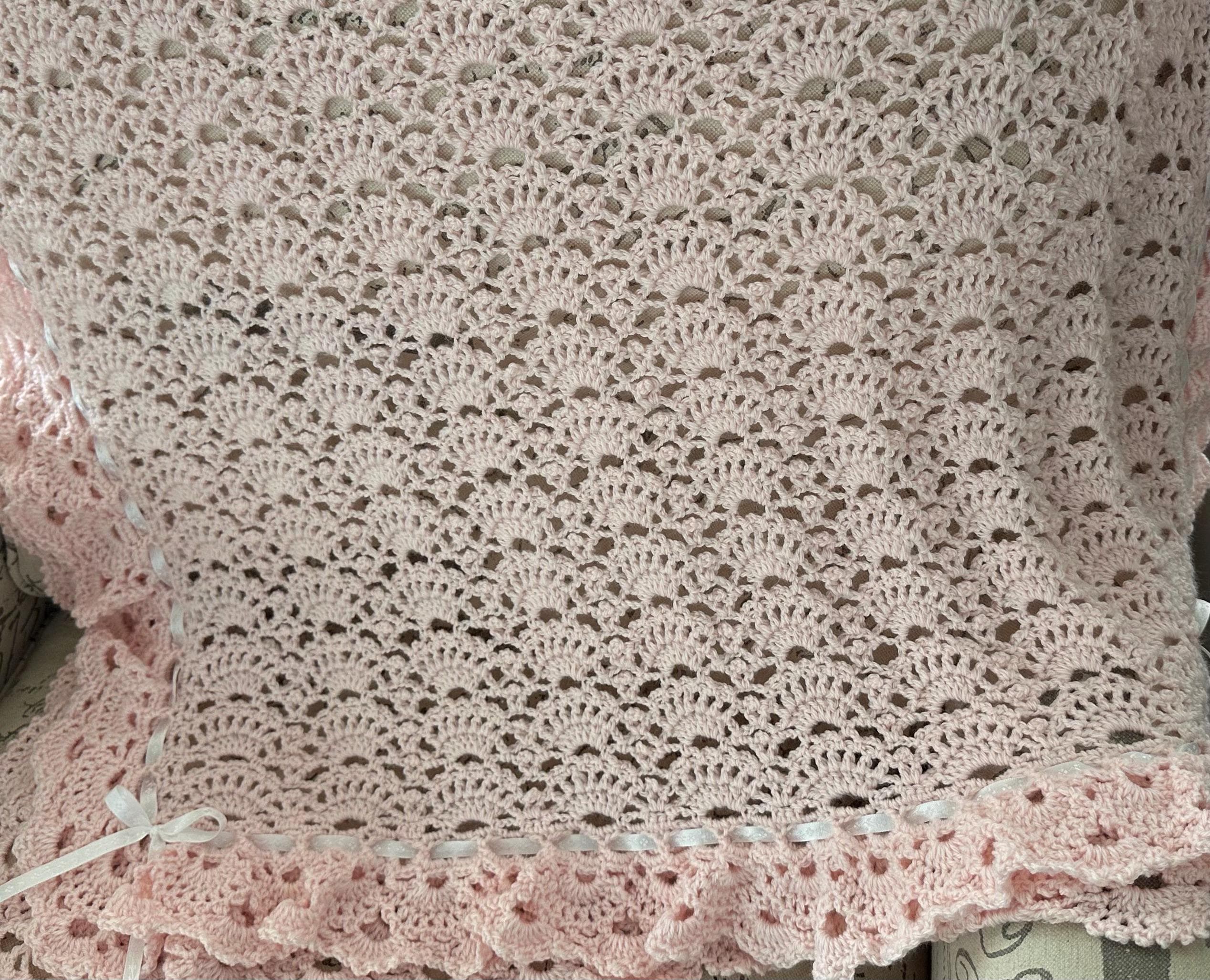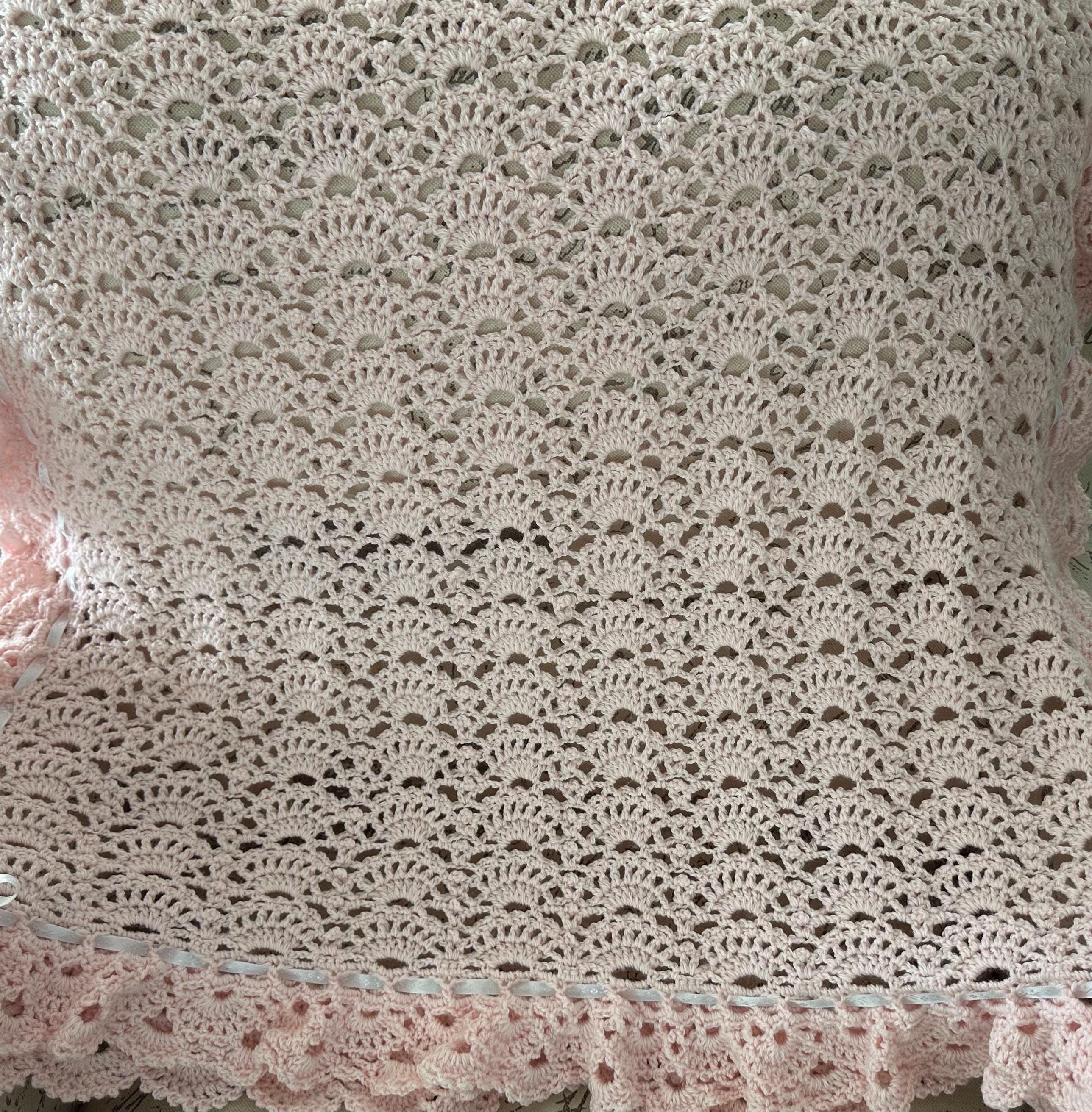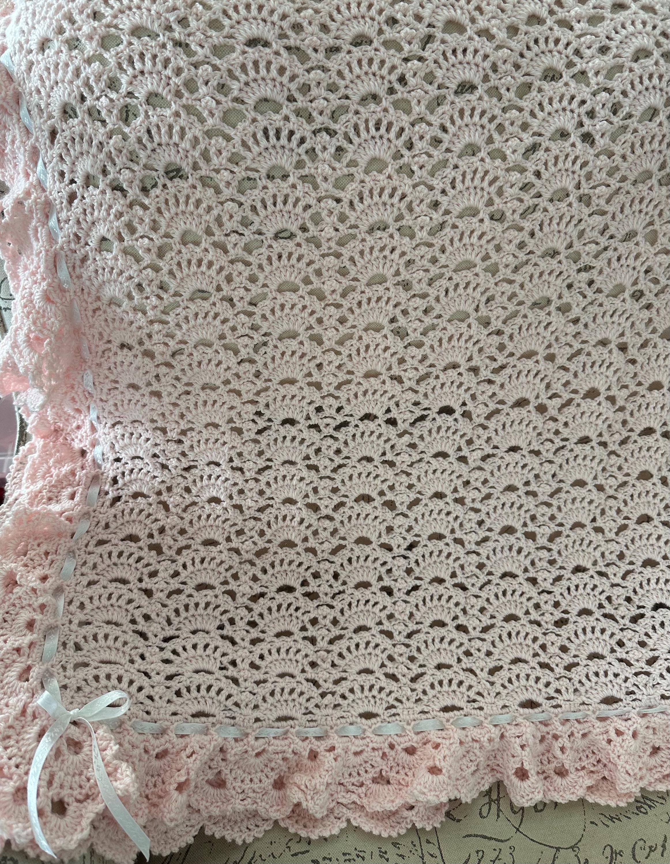 Handmade Crochet double ruffled, scallop design baby blanket! Light baby pink crocheted baby blanket in a beautiful fan pattern with white etched satin ribbon lacing. Beautiful full double scallop ruffle! Baby Tuckers exclusive design. Approximately 38x 38 Customize your one of a kind Heirloom.