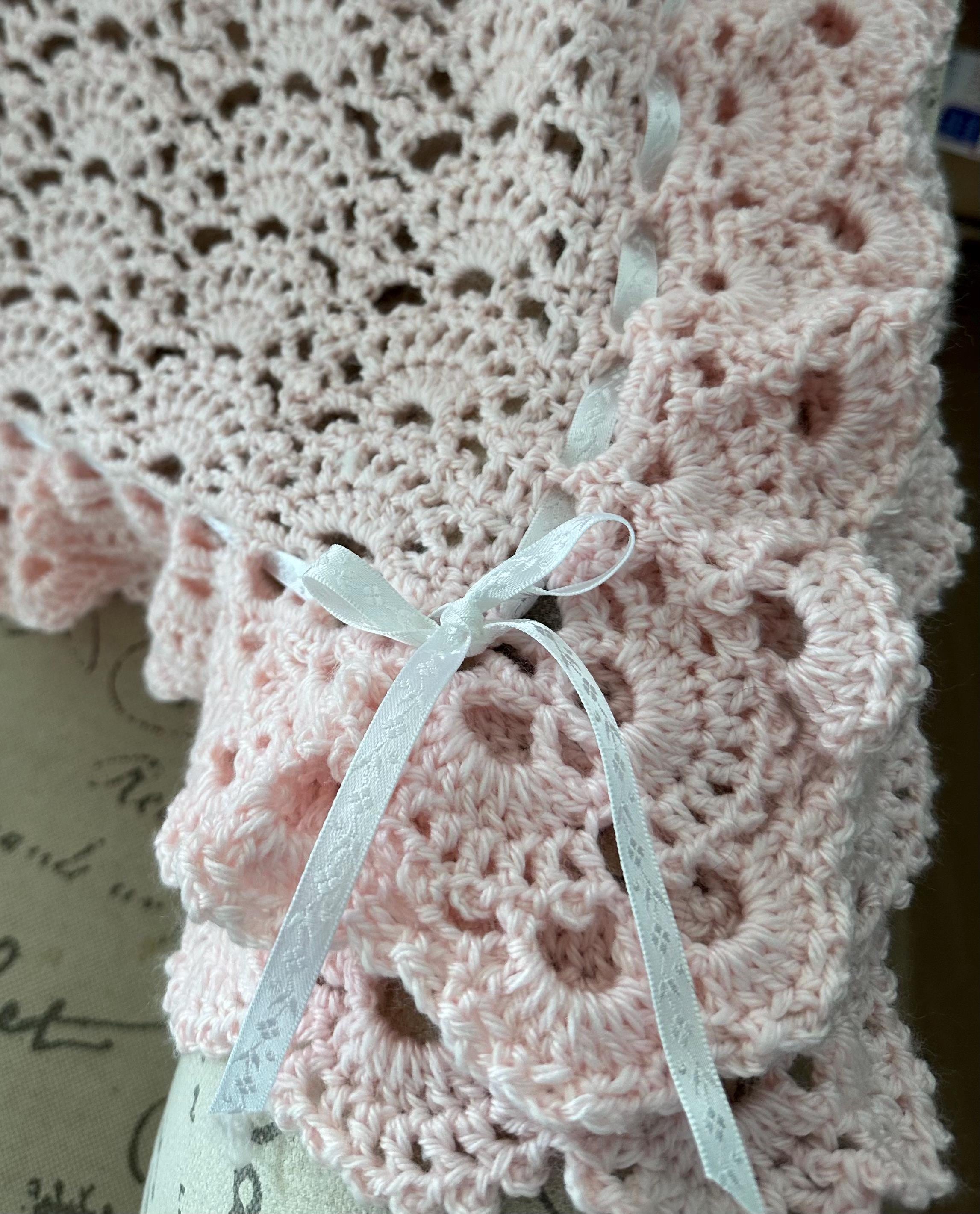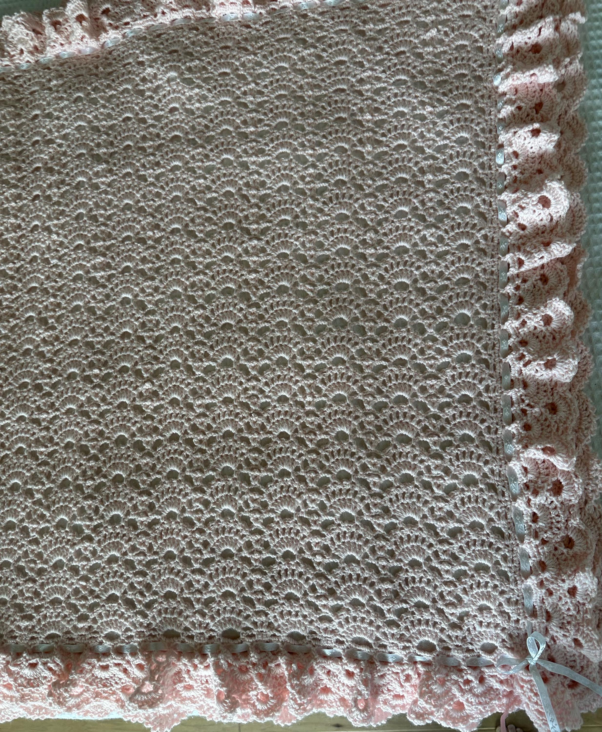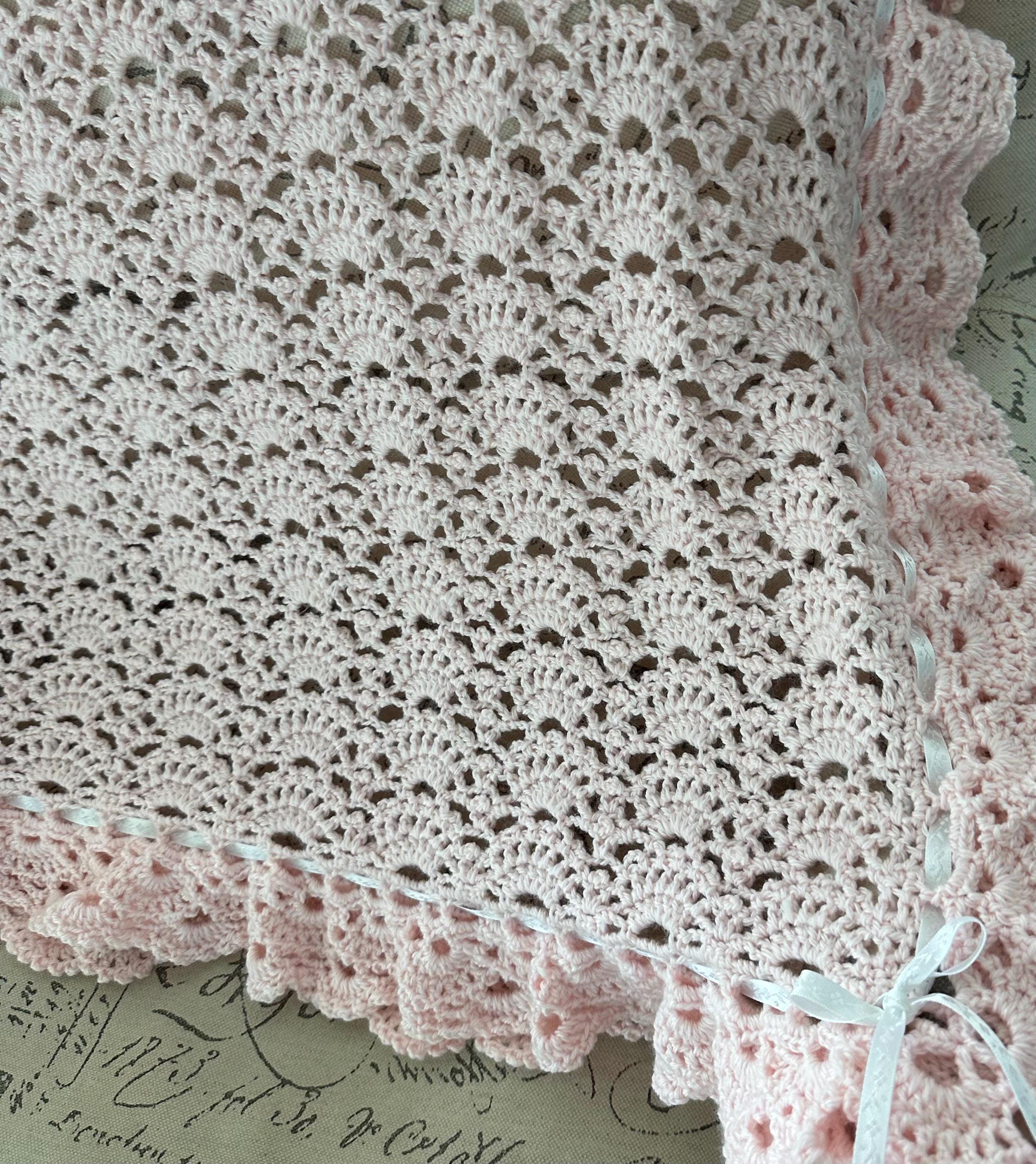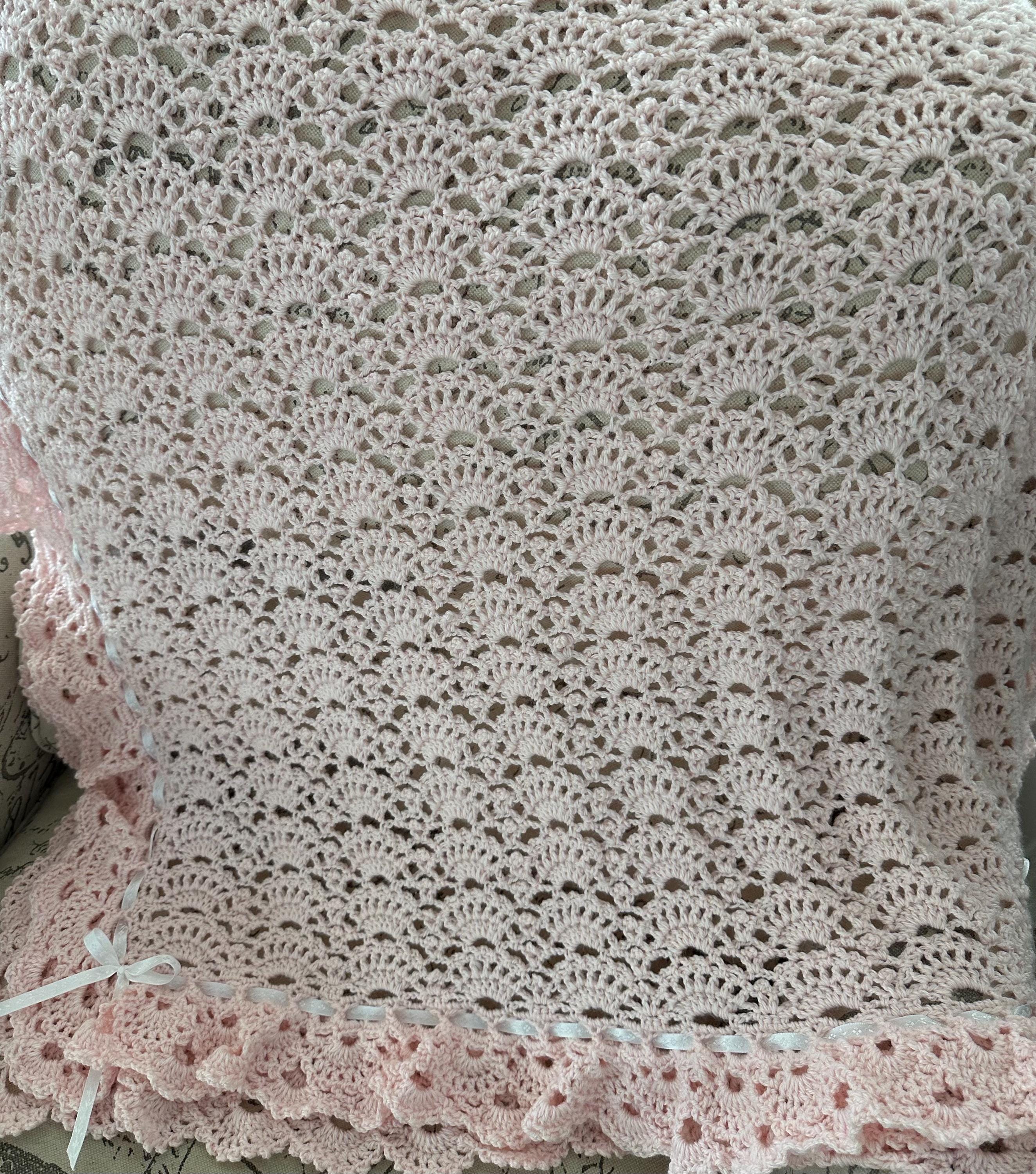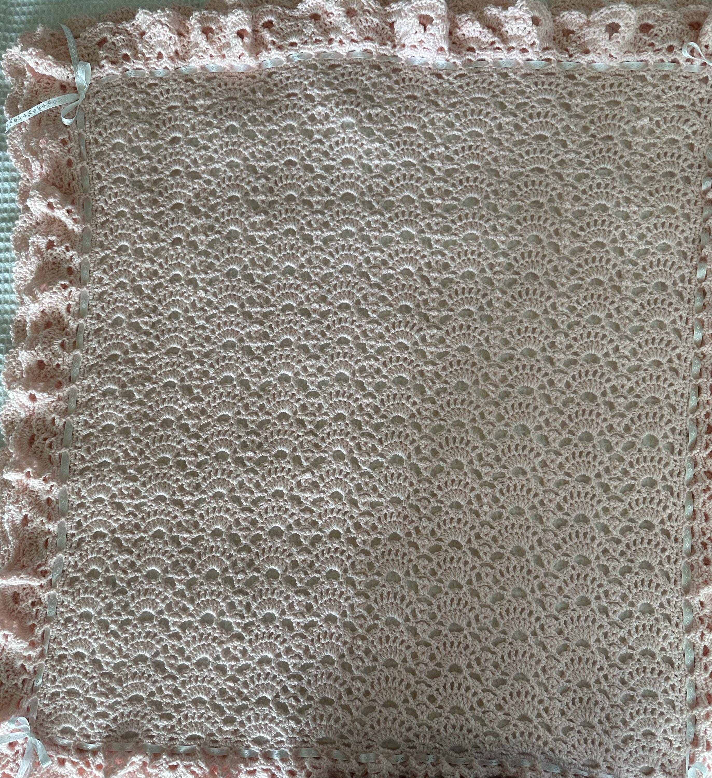 Handmade Crochet double ruffled, scallop design baby blanket! Light baby pink crocheted baby blanket in a beautiful fan pattern with white etched satin ribbon lacing. Beautiful full double scallop ruffle! Baby Tuckers exclusive design. Approximately 38x 38 Customize your one of a kind Heirloom.