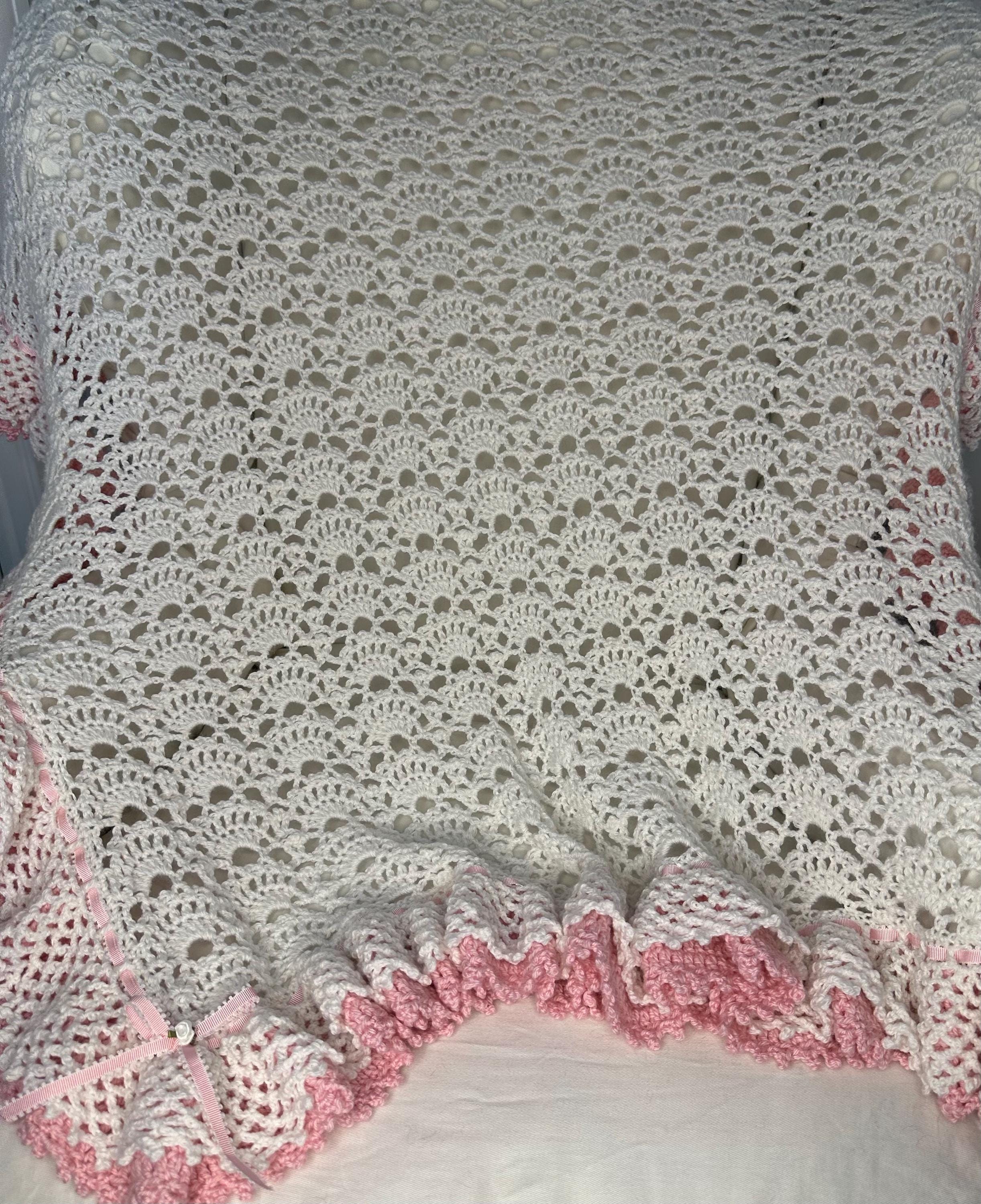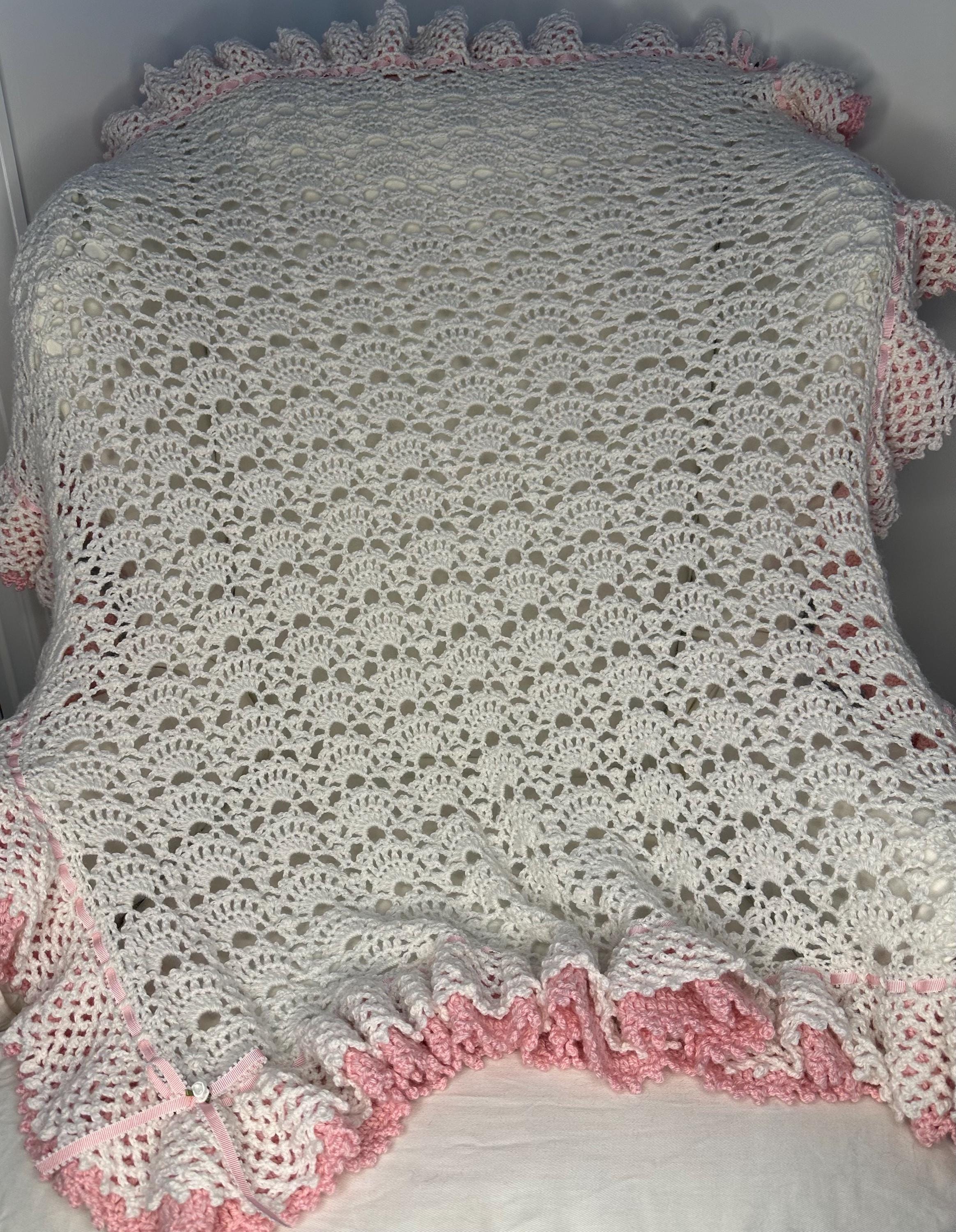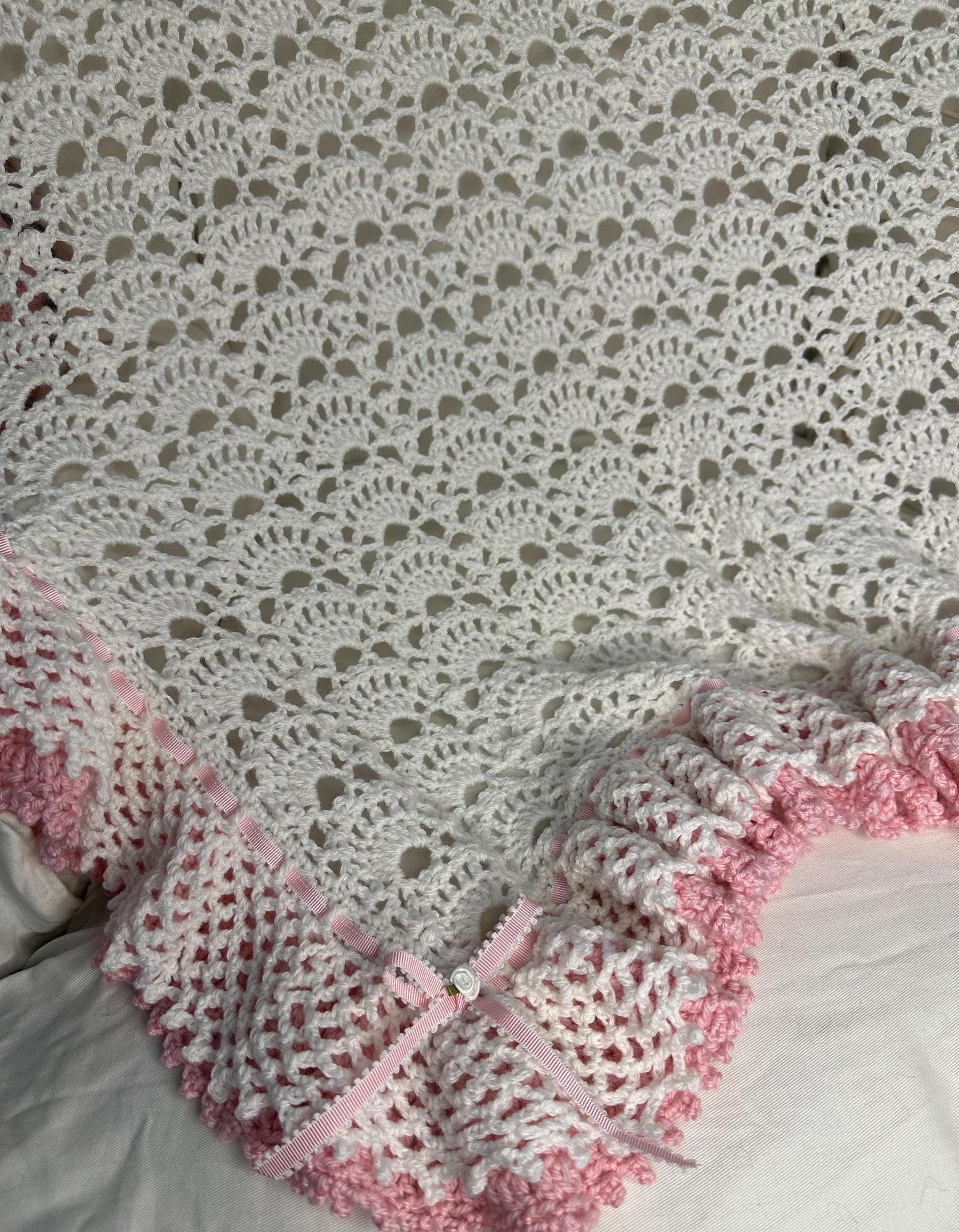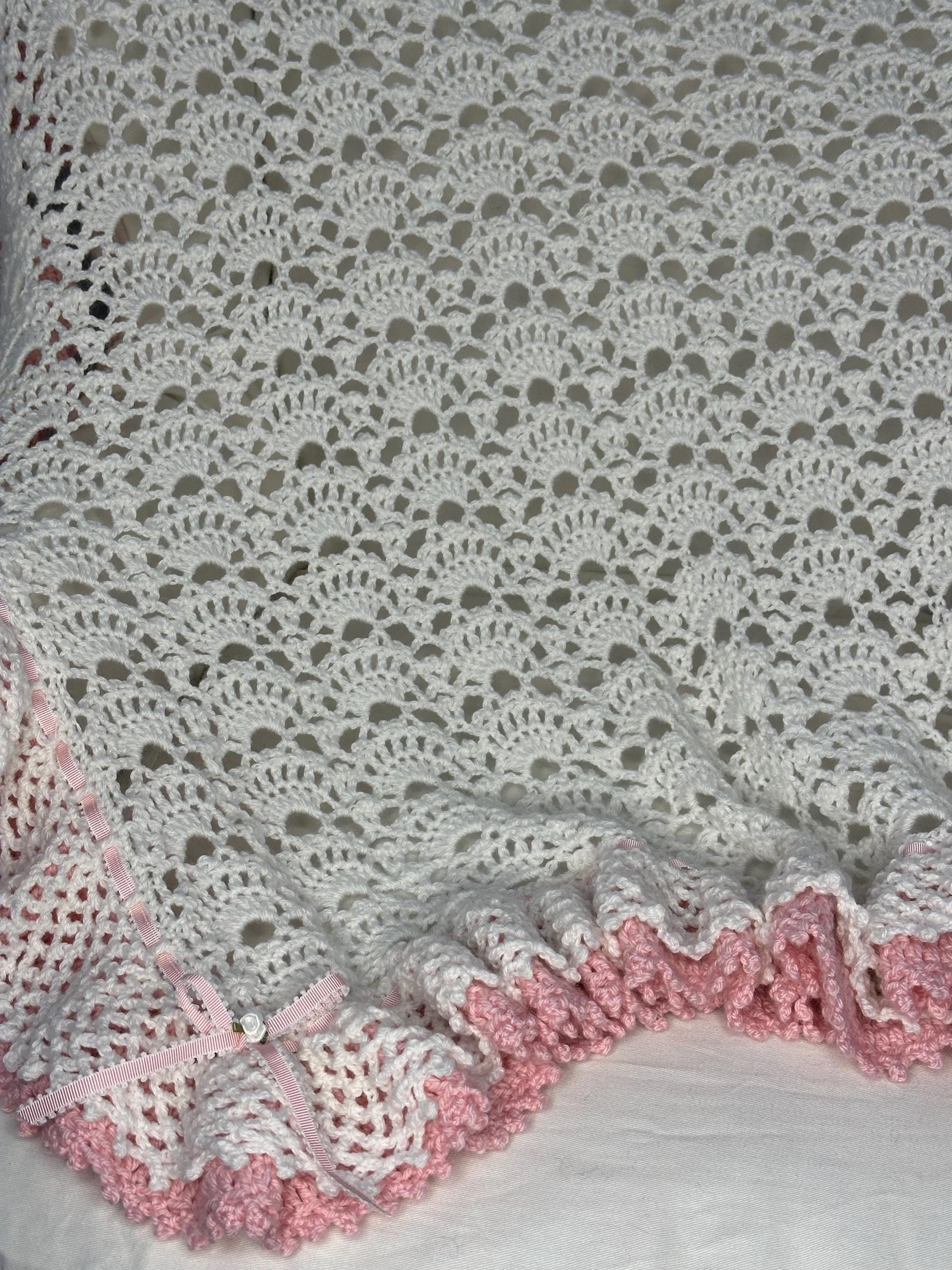Handmade Crochet double ruffled, fan design baby blanket! White crocheted baby blanket in a beautiful fan pattern with pink satin ribbon lacing and small white rosettes. The upper ruffle is white and the bottom ruffle is a beautiful shade of pink. This blanket takes a week to create due to the extensive full ruffles. Approximately 37 x 39