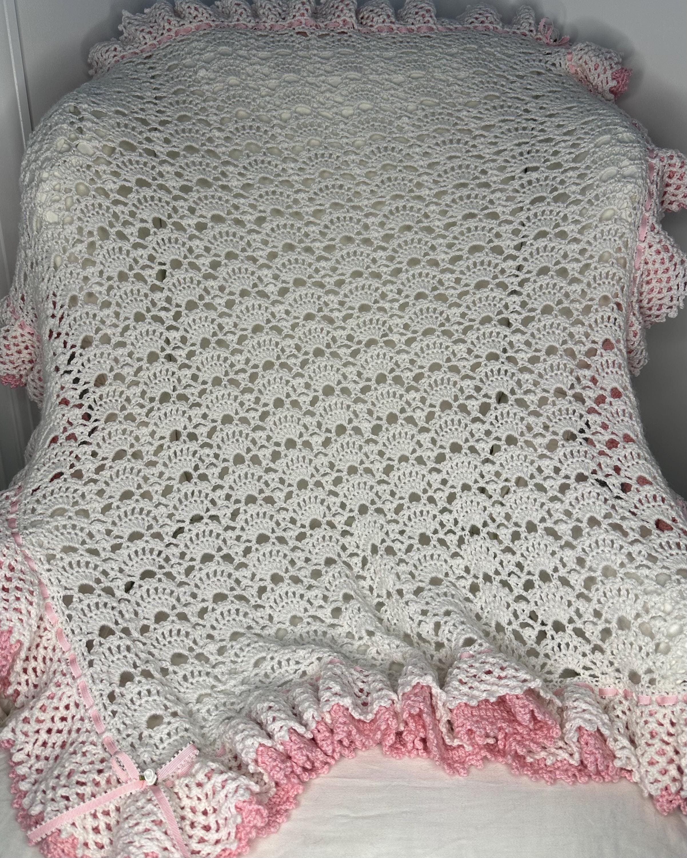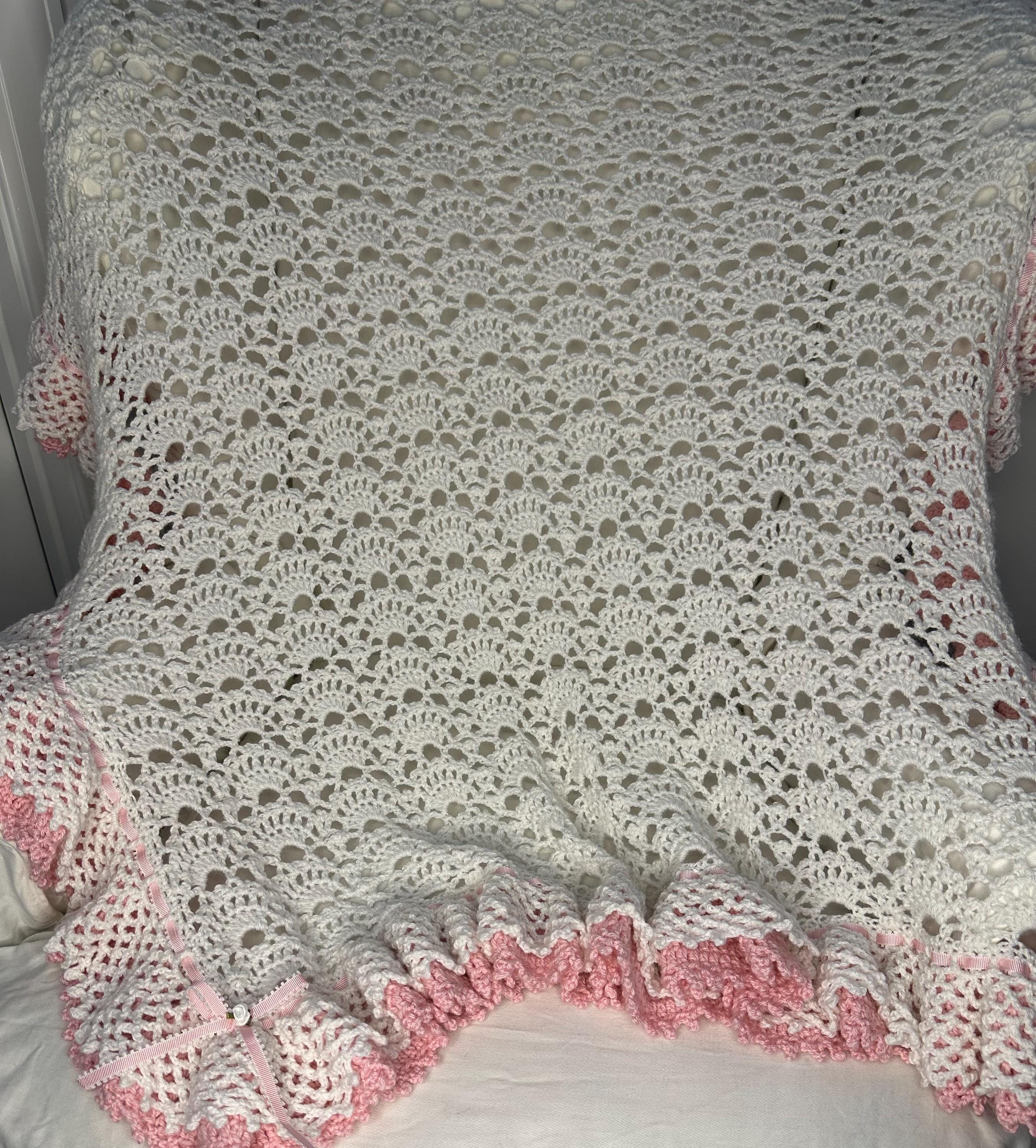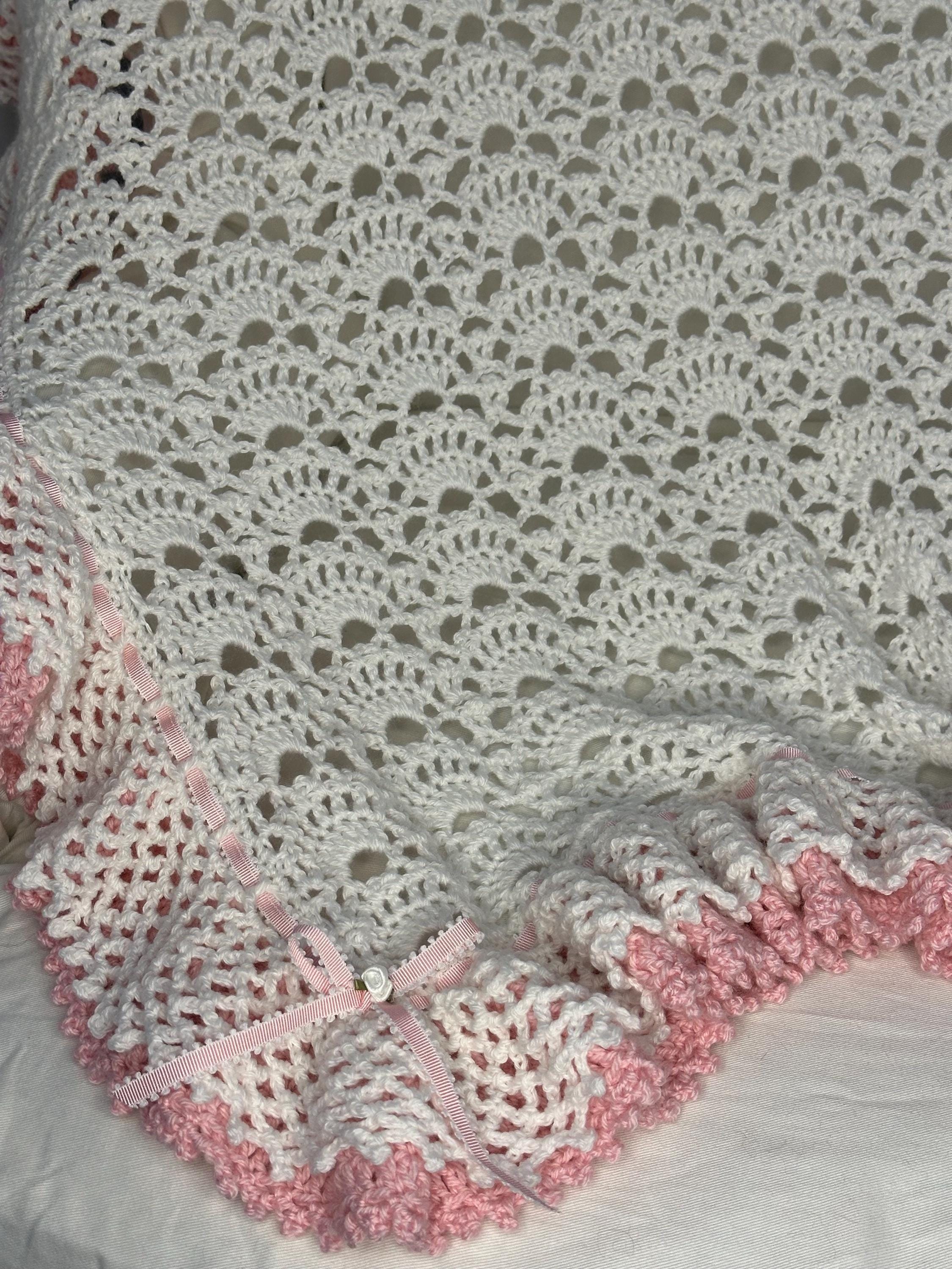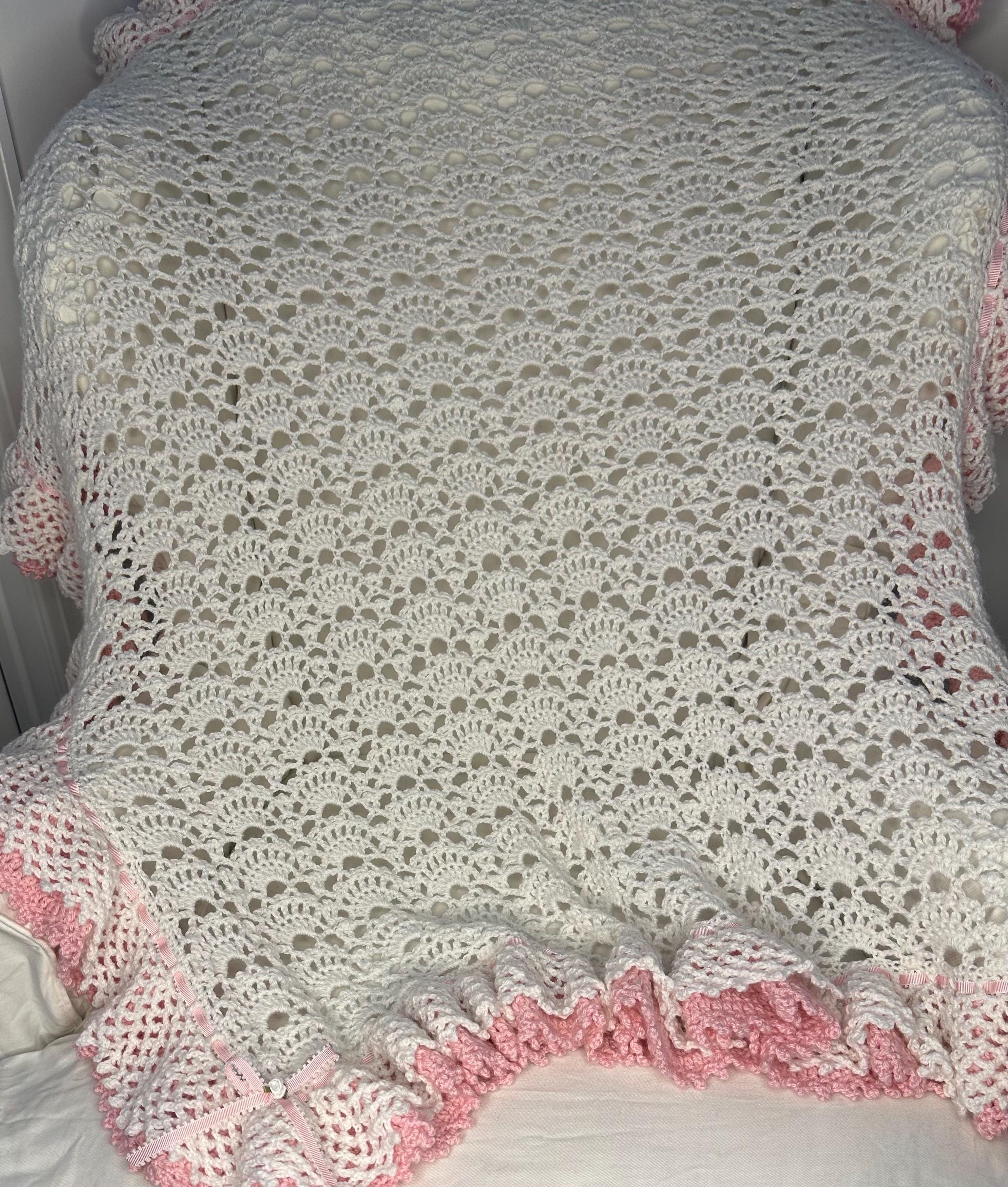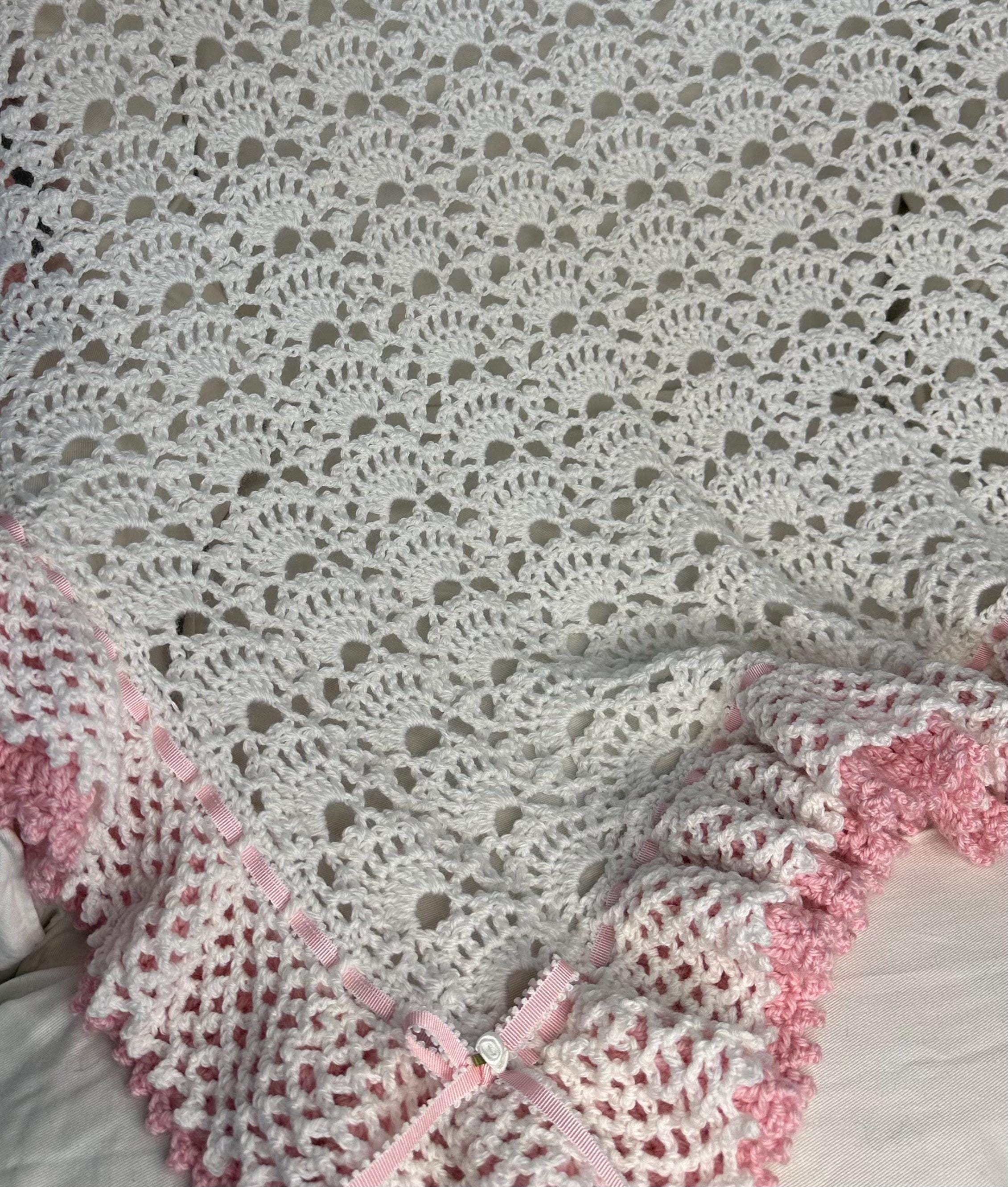 Handmade Crochet double ruffled, fan design baby blanket! White crocheted baby blanket in a beautiful fan pattern with pink satin ribbon lacing and small white rosettes. The upper ruffle is white and the bottom ruffle is a beautiful shade of pink. This blanket takes a week to create due to the extensive full ruffles. Approximately 37 x 39
