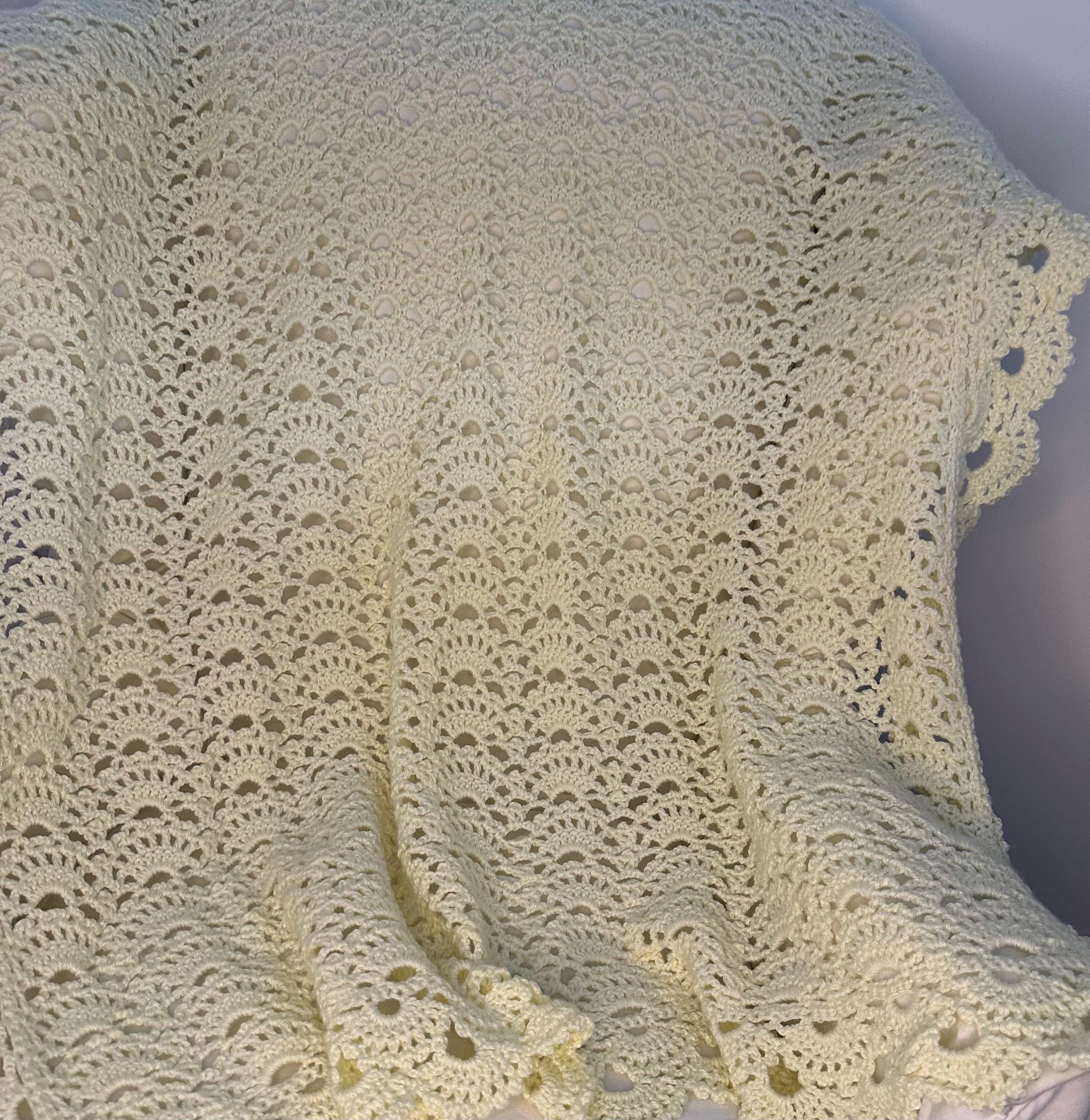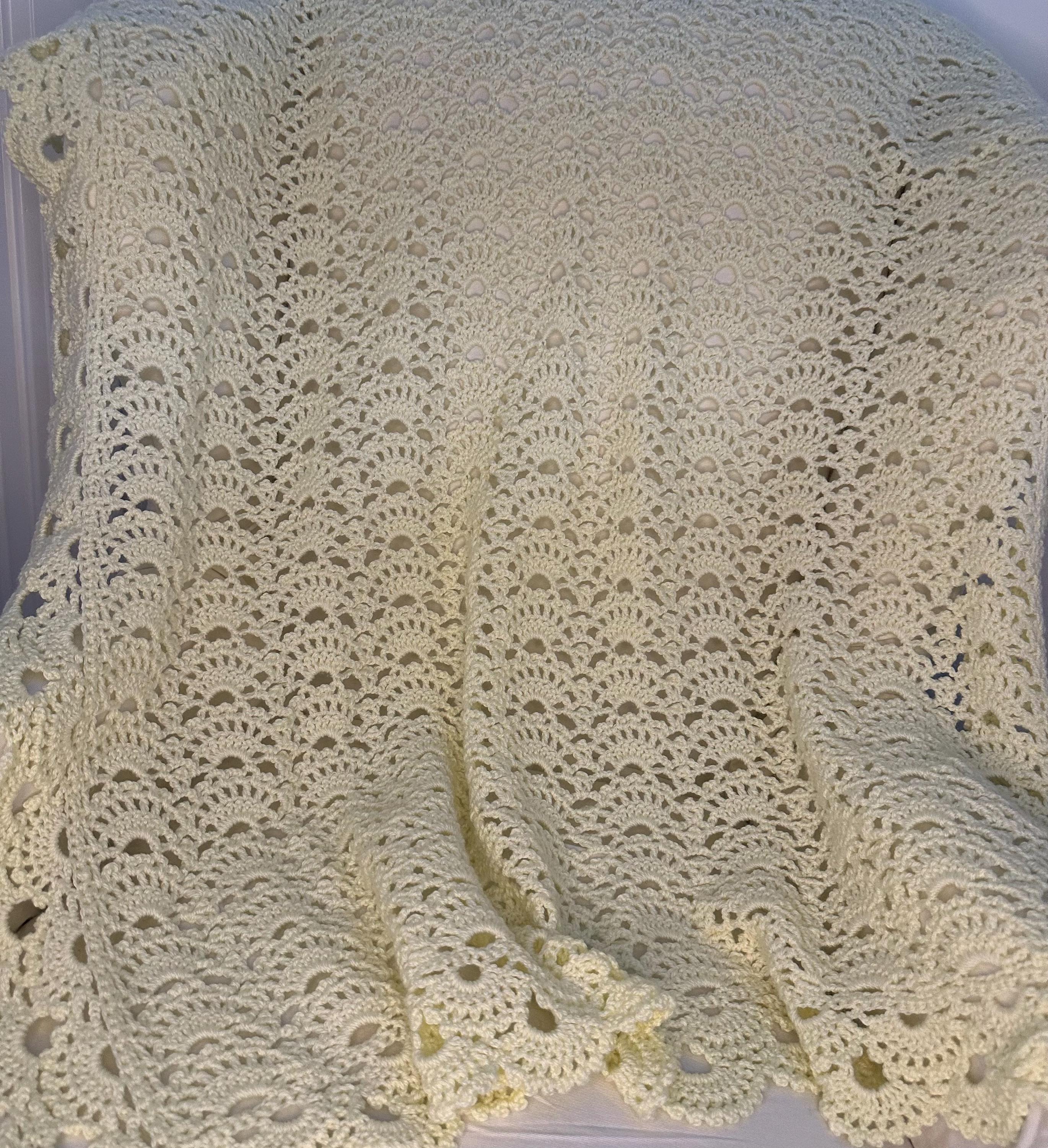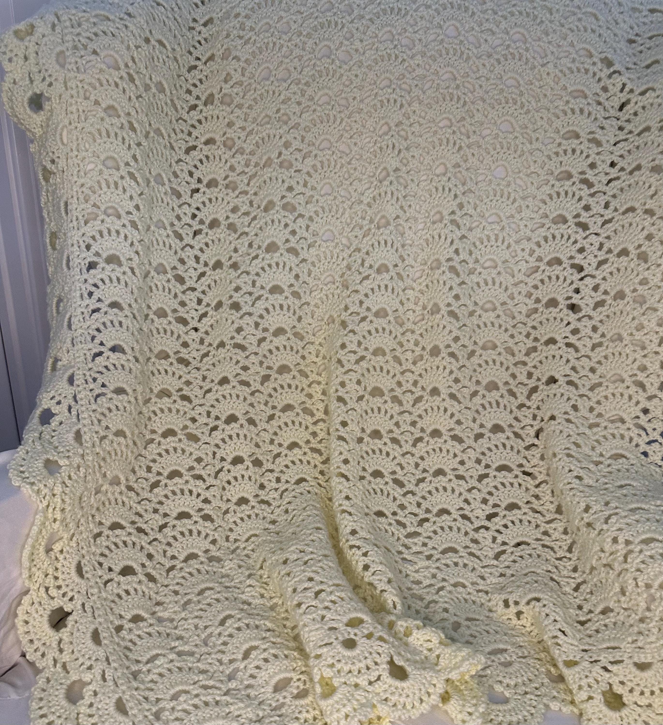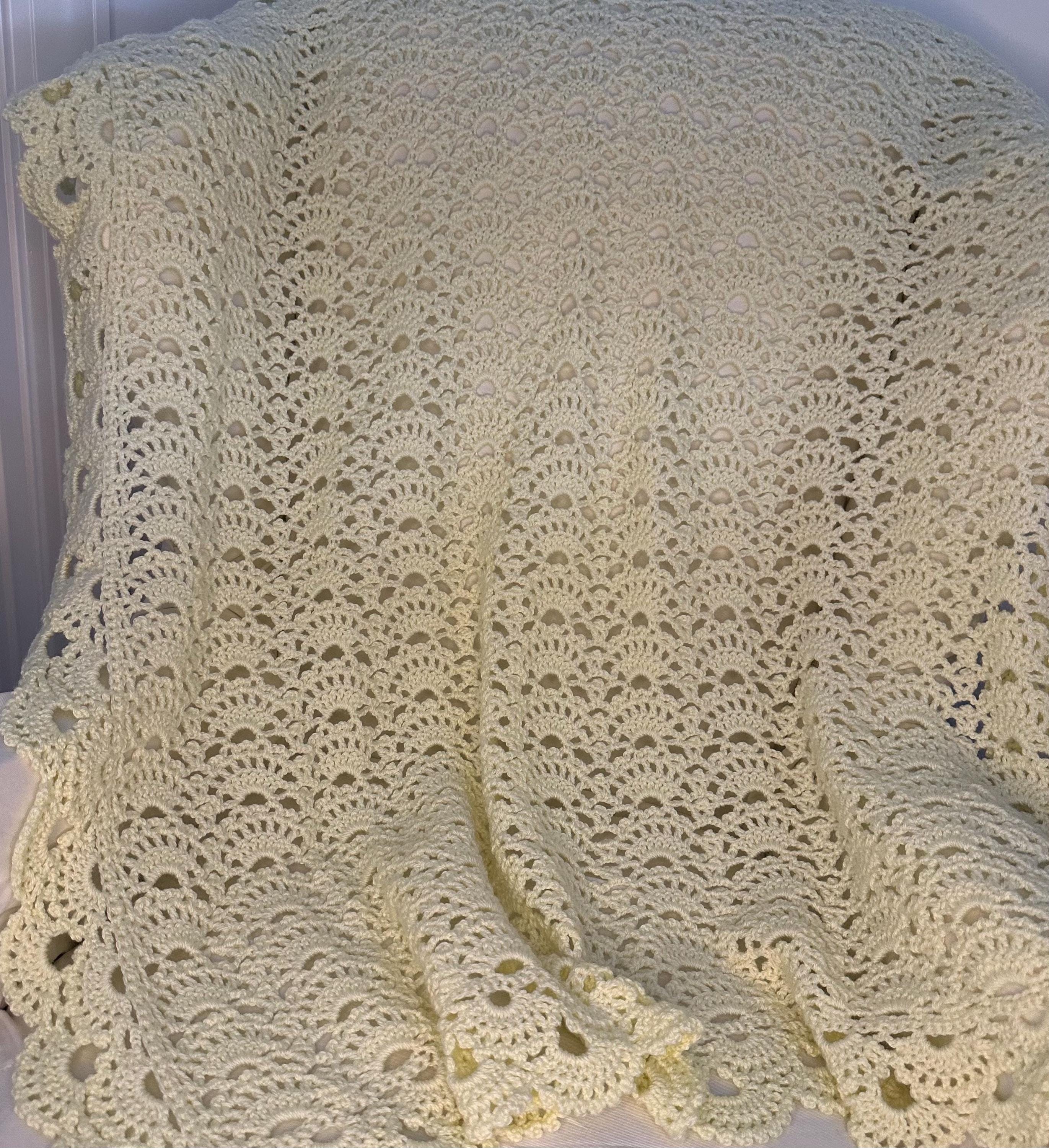 Custom Crochet baby blanket in a creamy pale yellow. Super soft King Cole Paradise Beach QUALITY yarn. Baby Tuckers fan design with 2 tier intricate picot edging. Perfect babyNursery/Christening/Baby Shower/Newborn Gift. Great gift....wonderful heirloom...a treasured baby blanket.