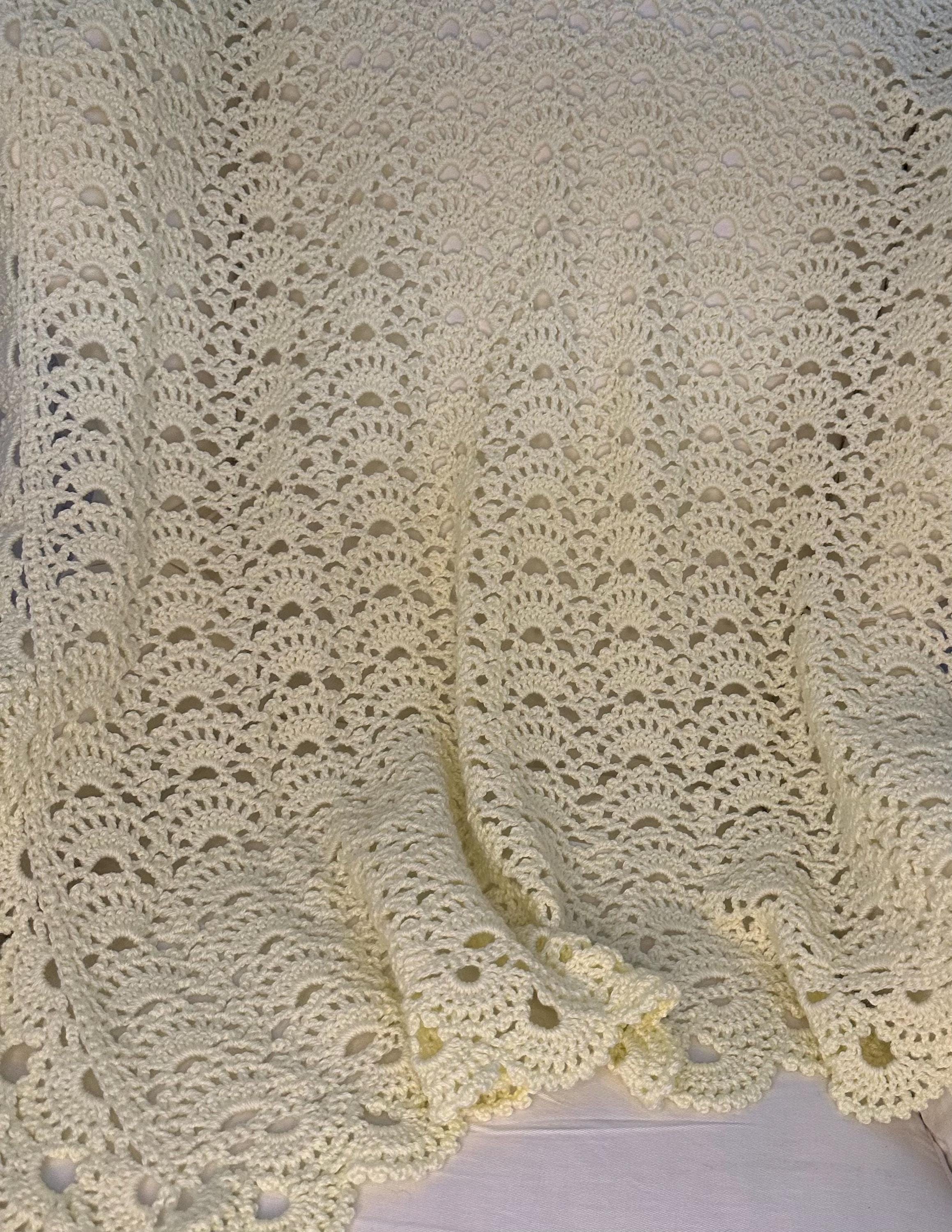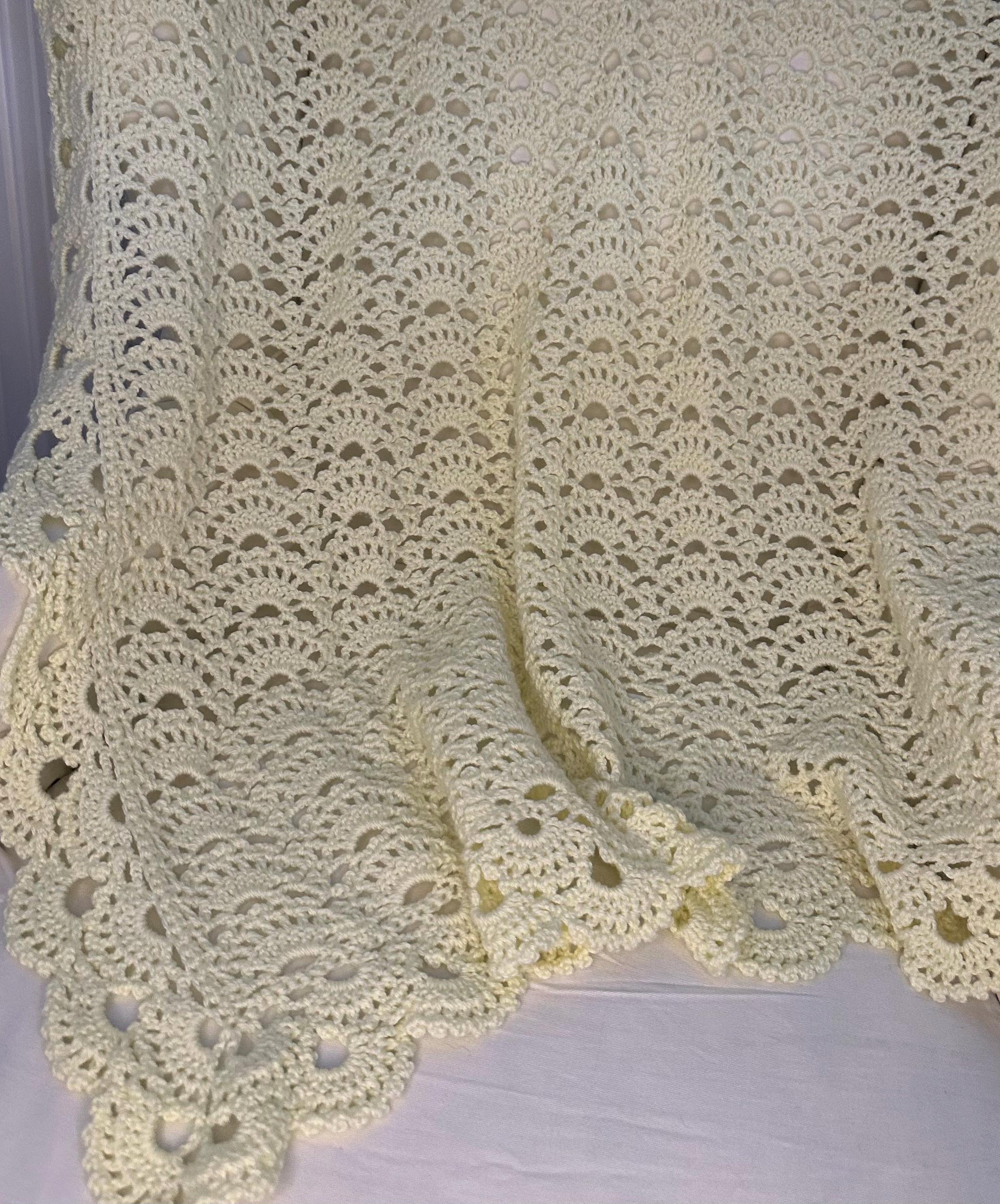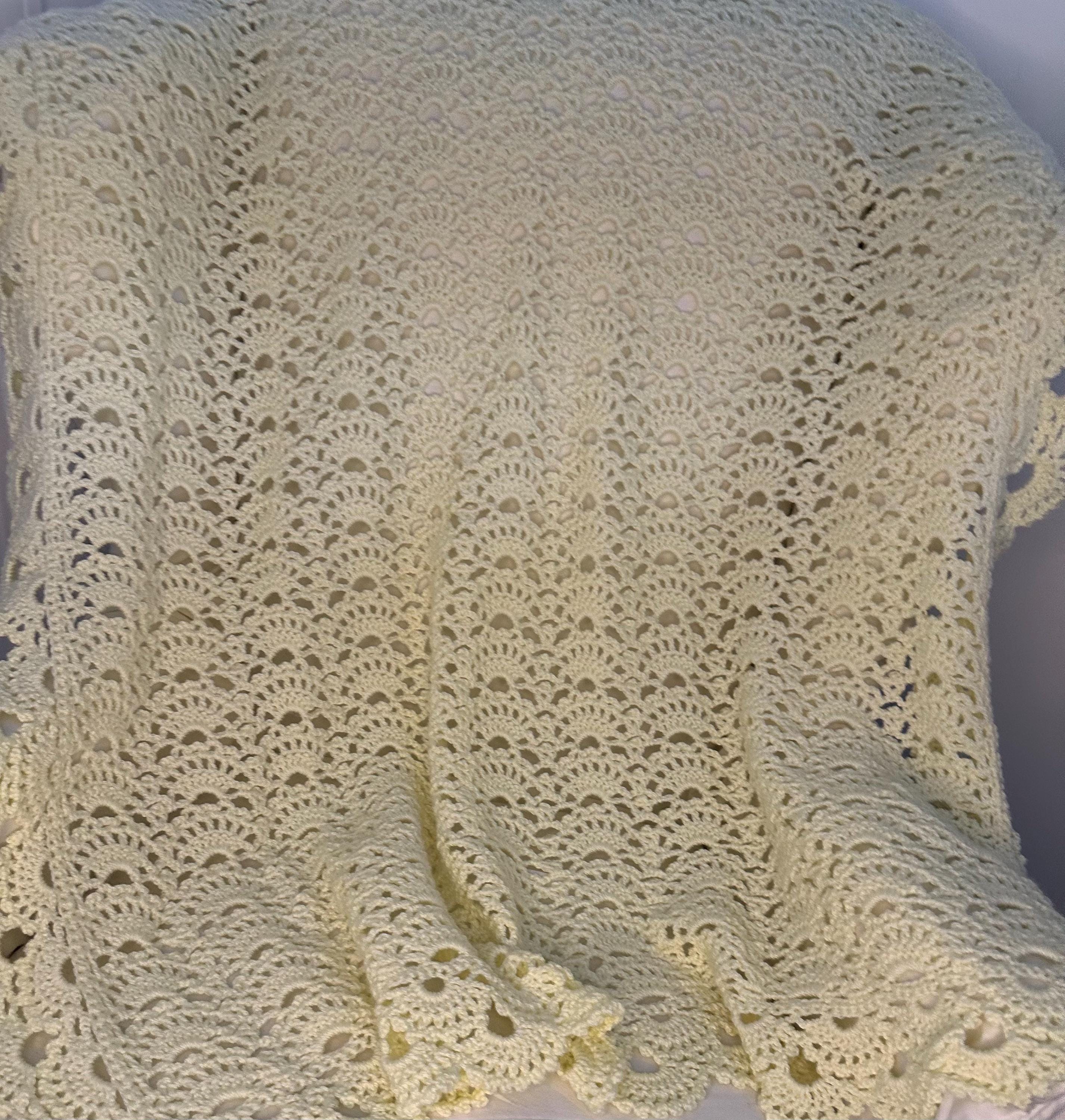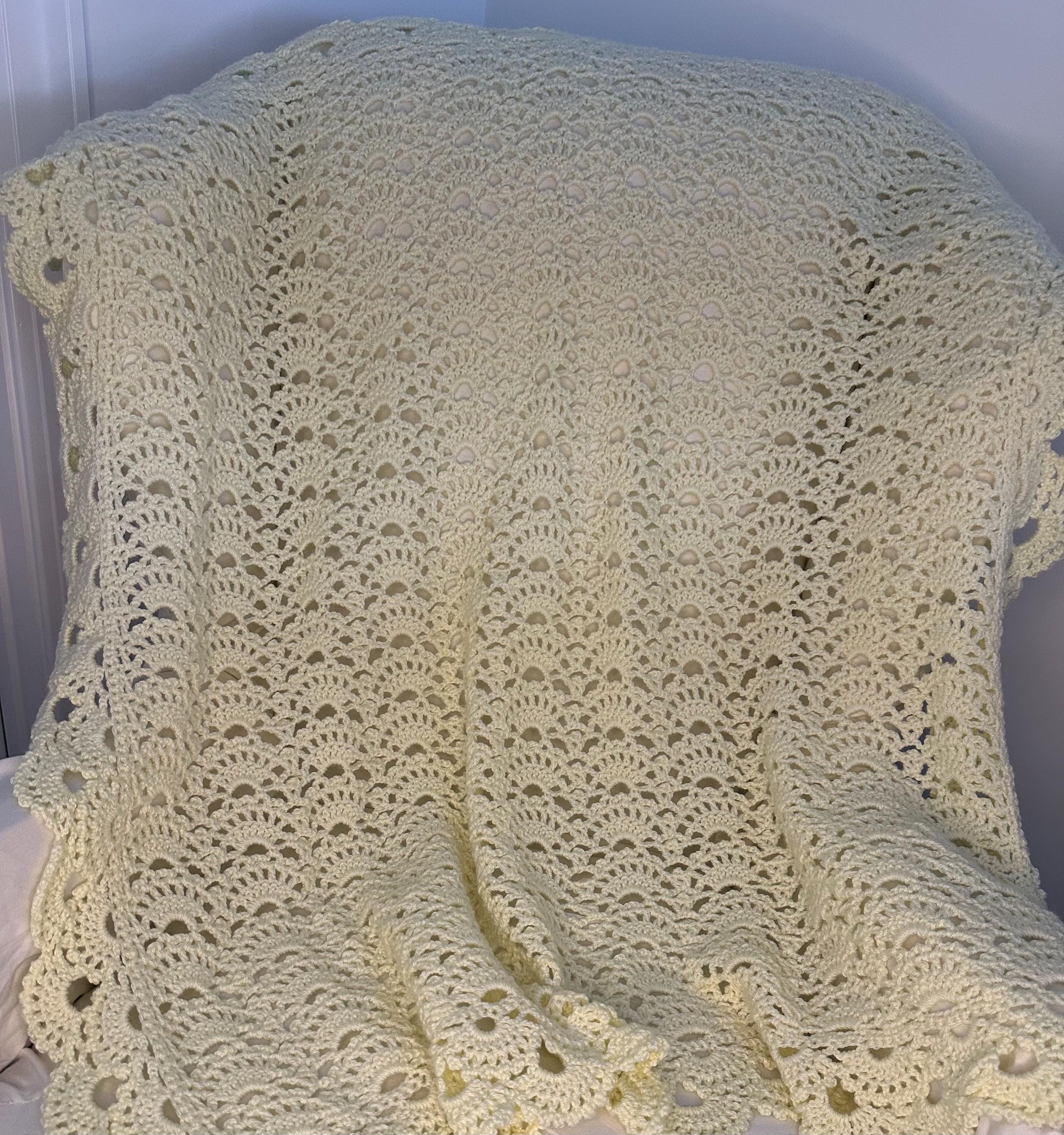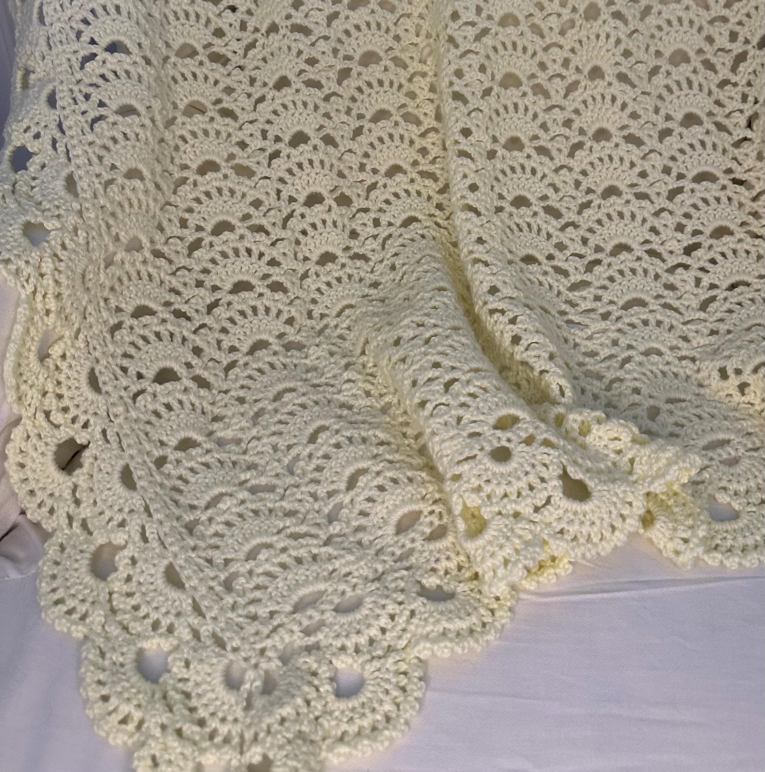 Custom Crochet baby blanket in a creamy pale yellow. Super soft King Cole Paradise Beach QUALITY yarn. Baby Tuckers fan design with 2 tier intricate picot edging. Perfect babyNursery/Christening/Baby Shower/Newborn Gift. Great gift....wonderful heirloom...a treasured baby blanket.
