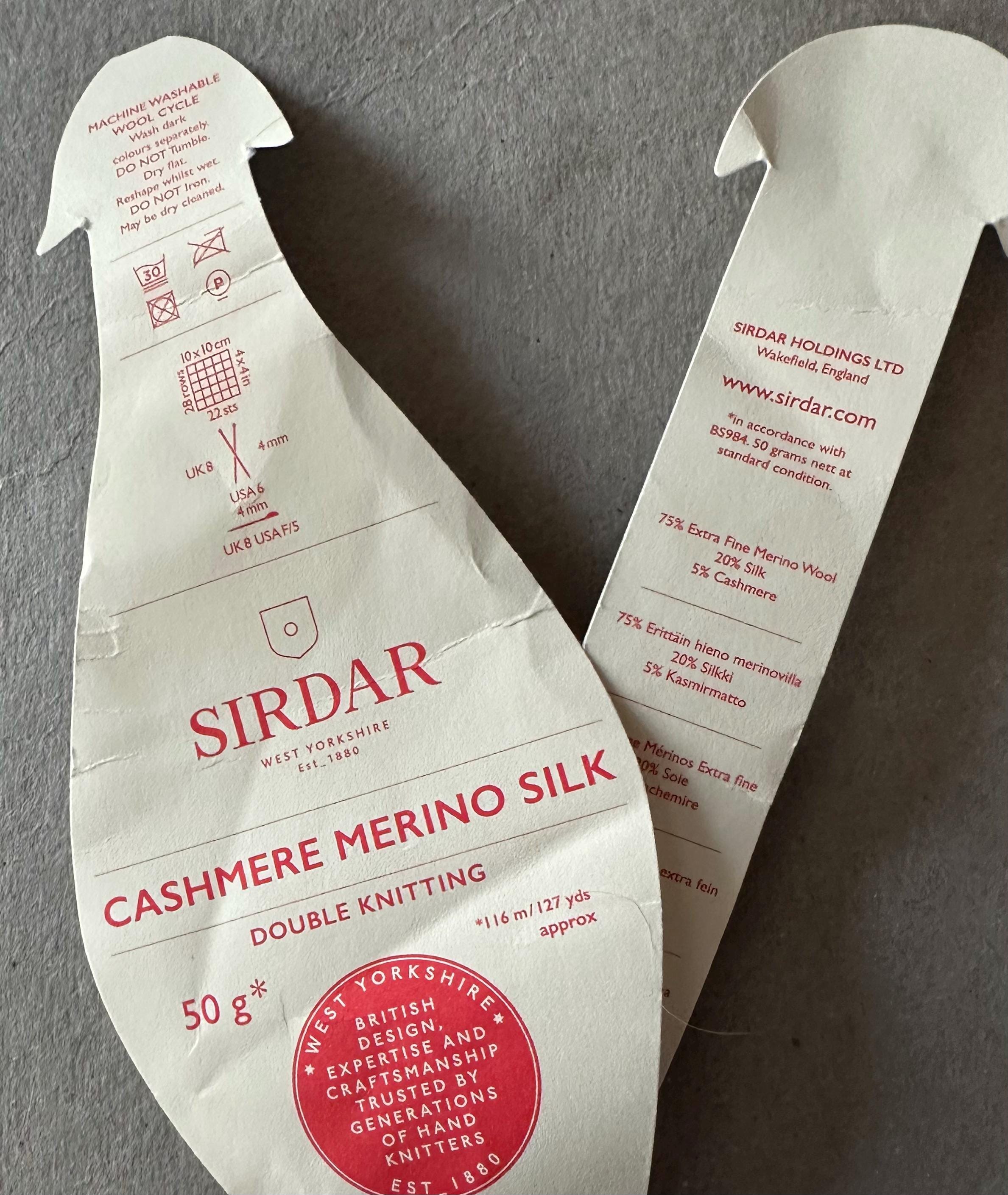 Sirdar cashmere, merino, silk. Machine wash in cold water on the GENTLE cycle. (See care instructions below)