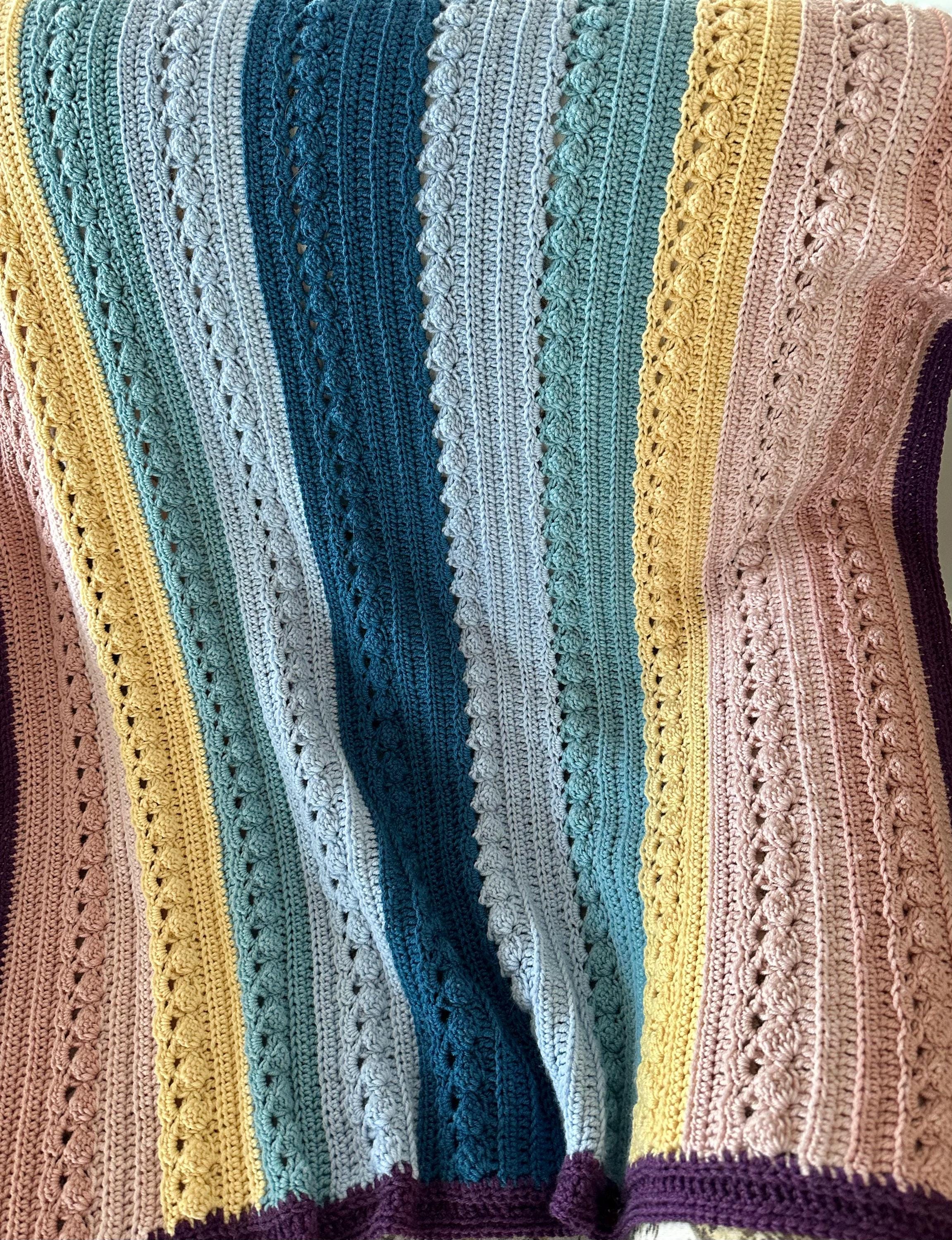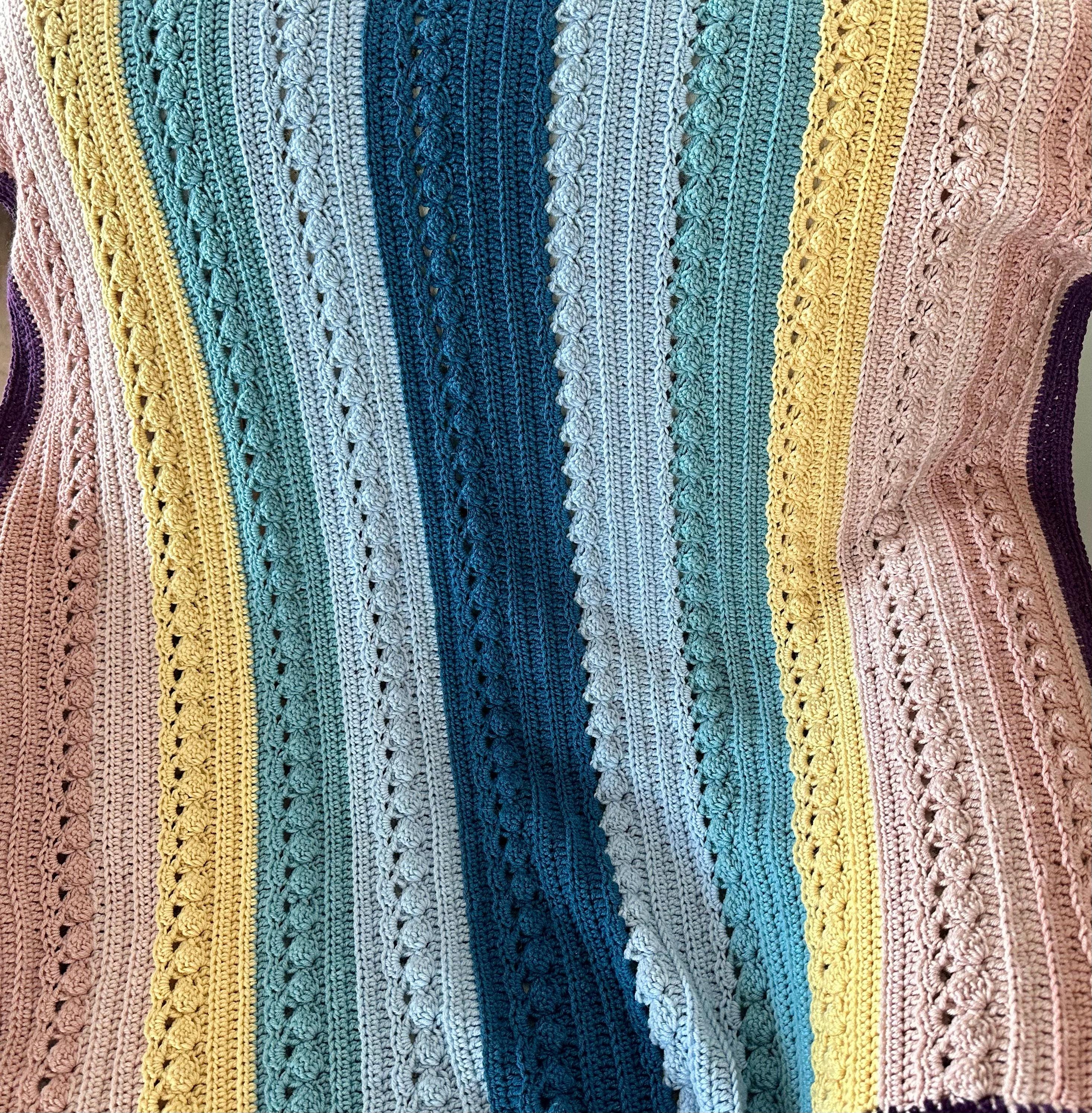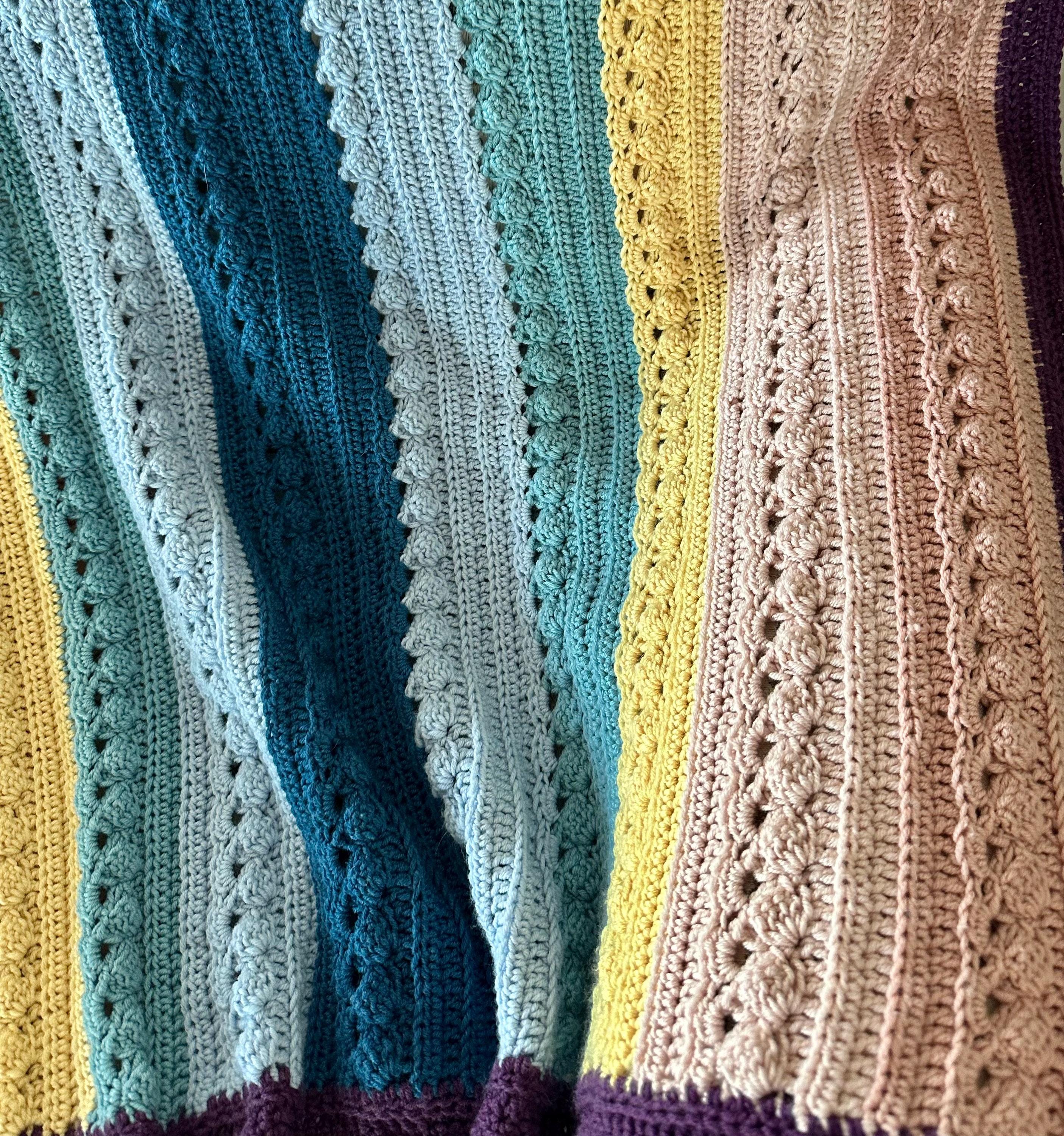 Hand crocheted rainbow baby blanket in a luxurious ALL NATURAL FIBERS baby yarn. Beautiful shades of rosey pinks, yellow, bluish green, baby blue, teal, and plum edging.