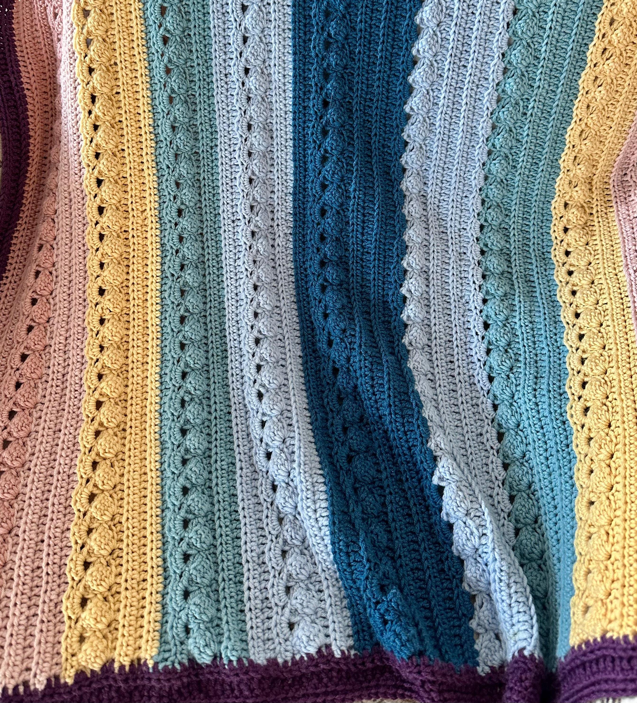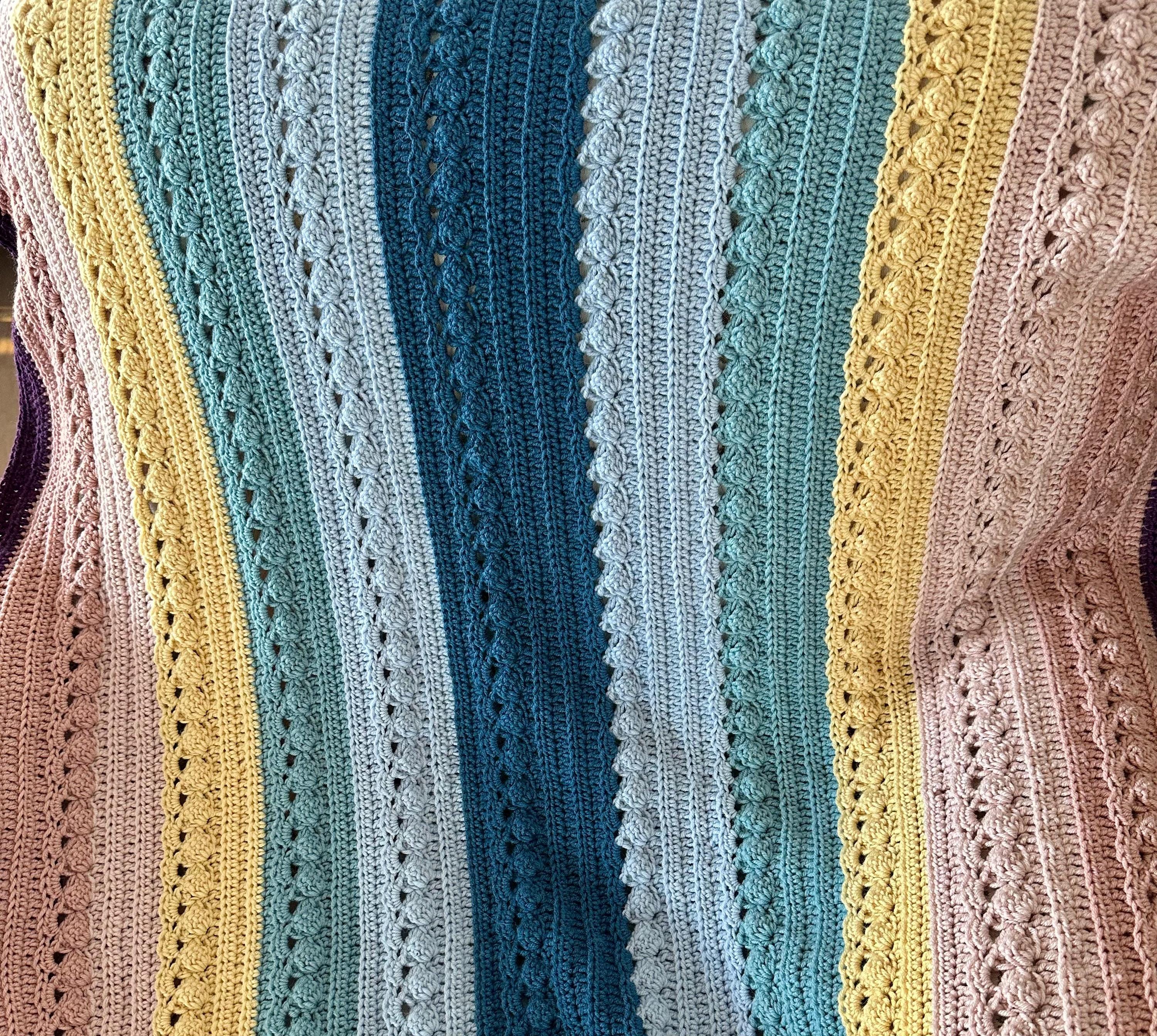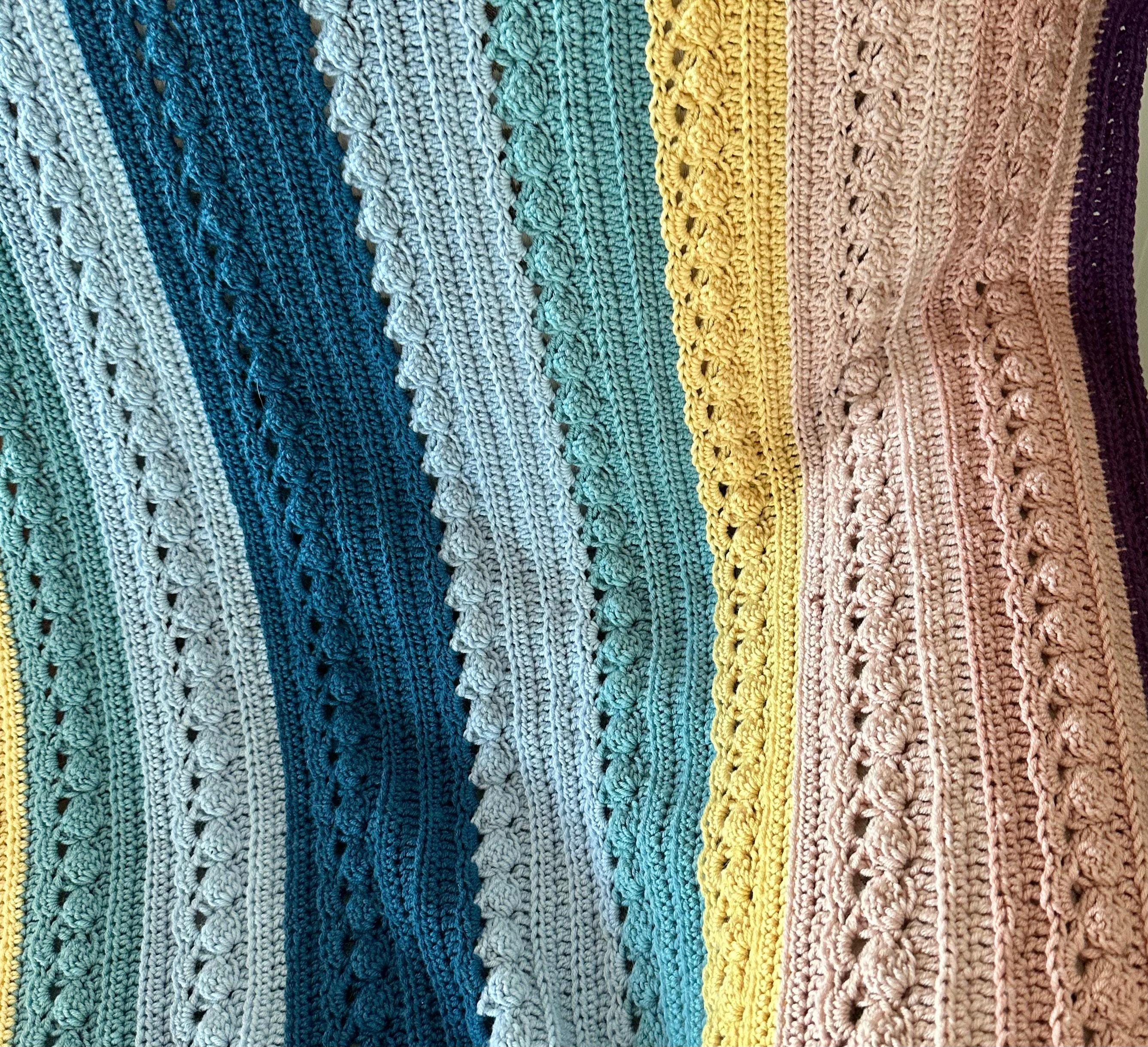 Hand crocheted rainbow baby blanket in a luxurious ALL NATURAL FIBERS baby yarn. Beautiful shades of rosey pinks, yellow, bluish green, baby blue, teal, and plum edging.