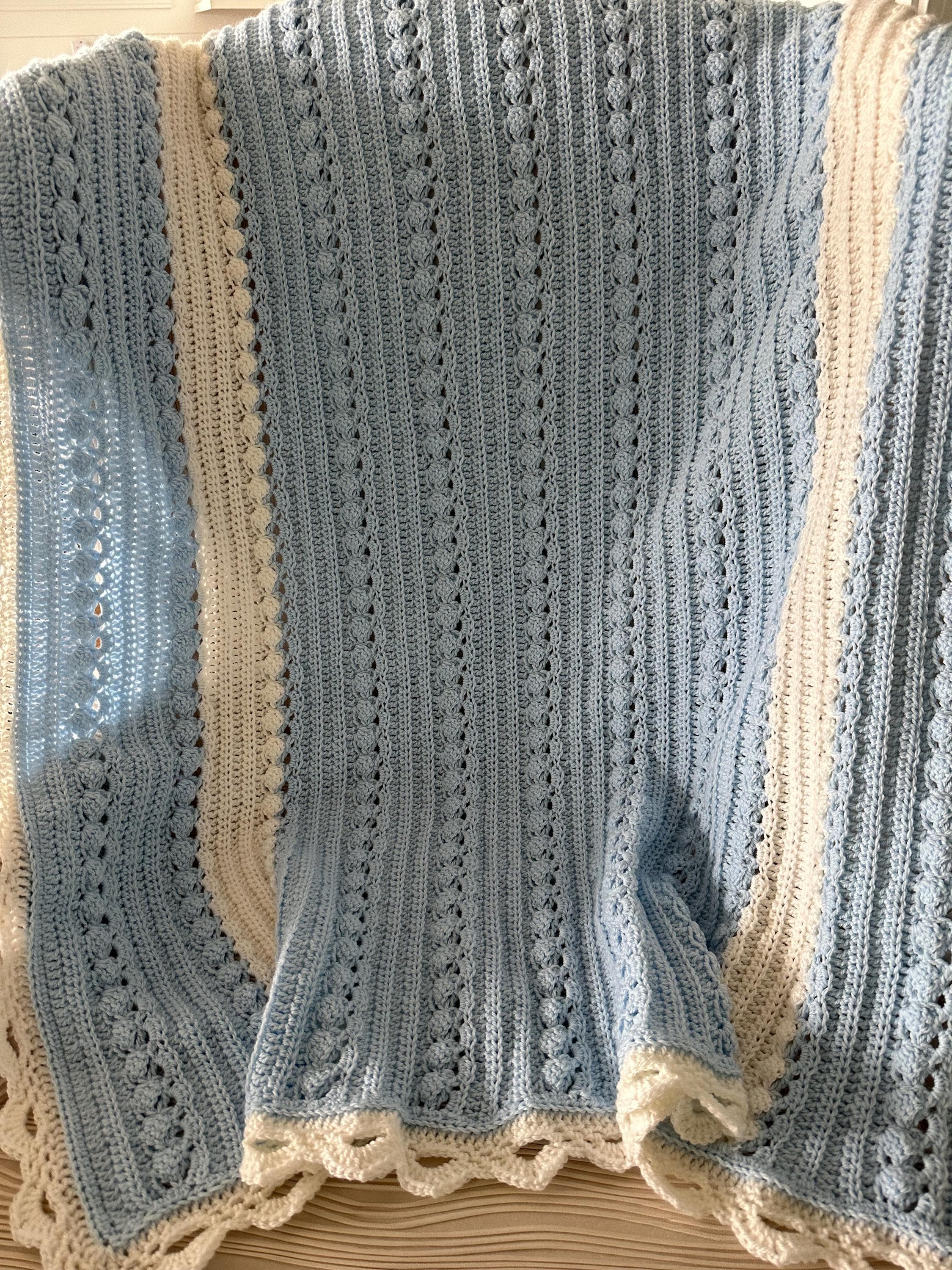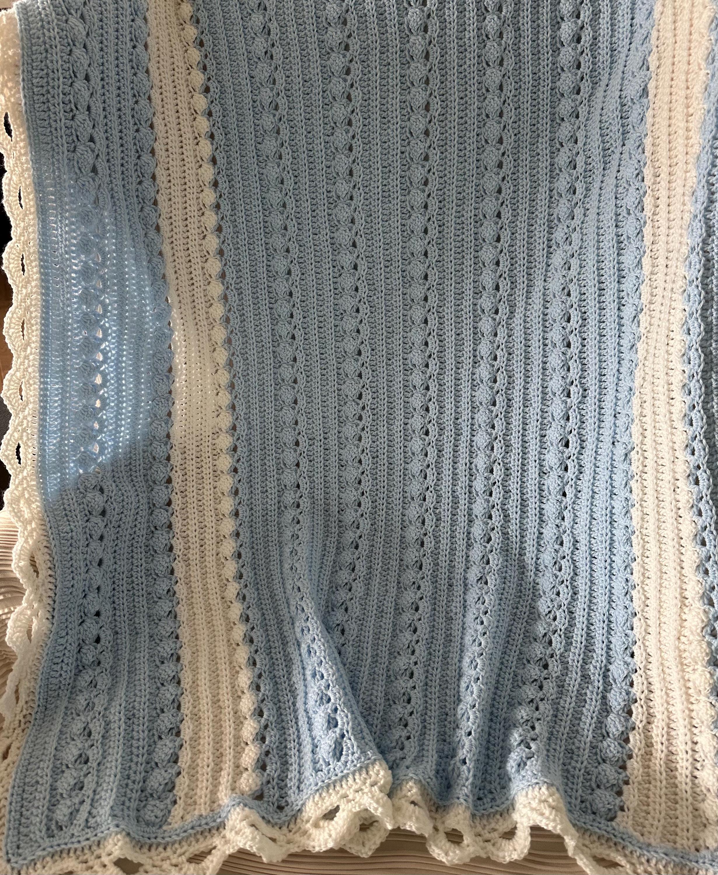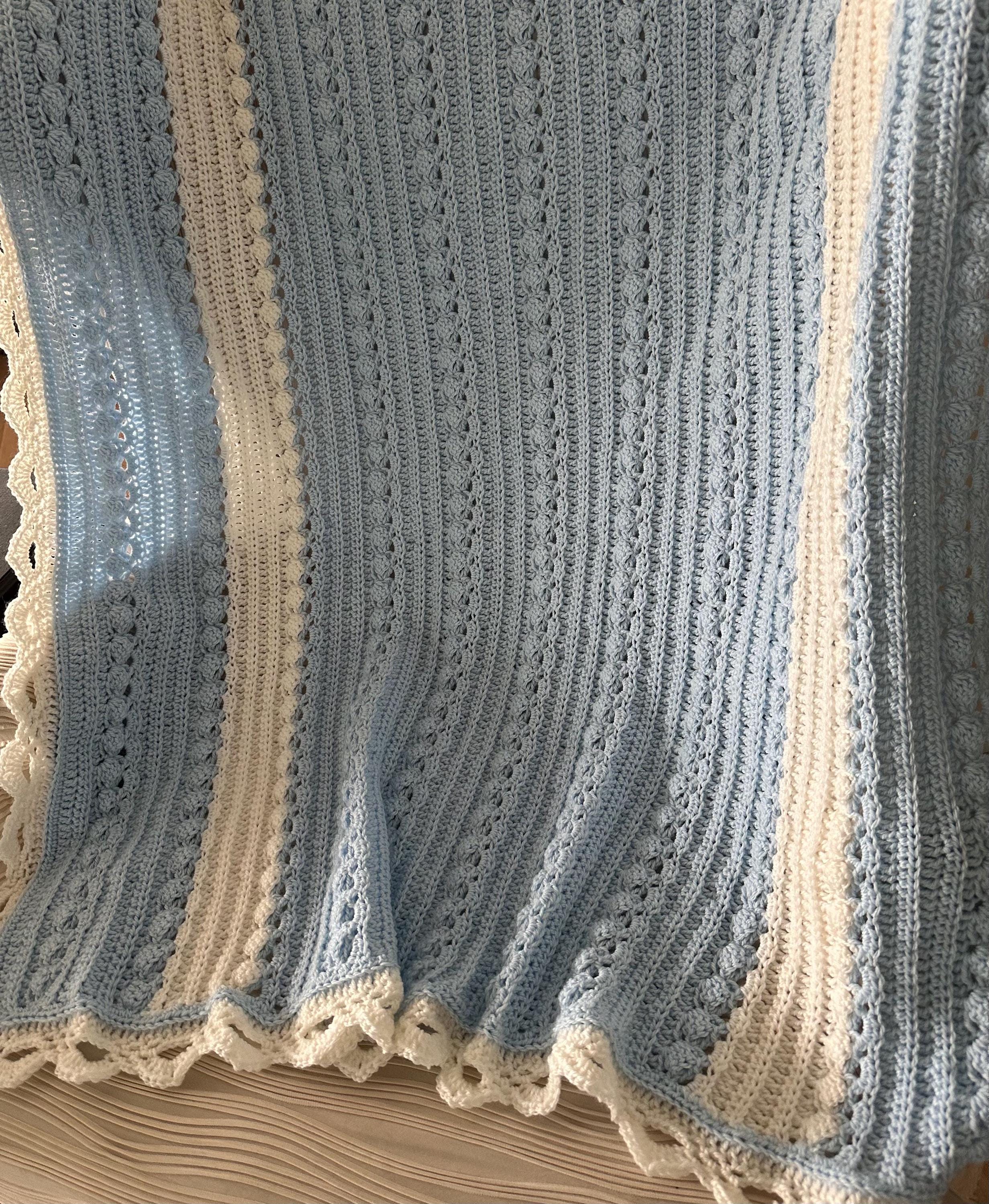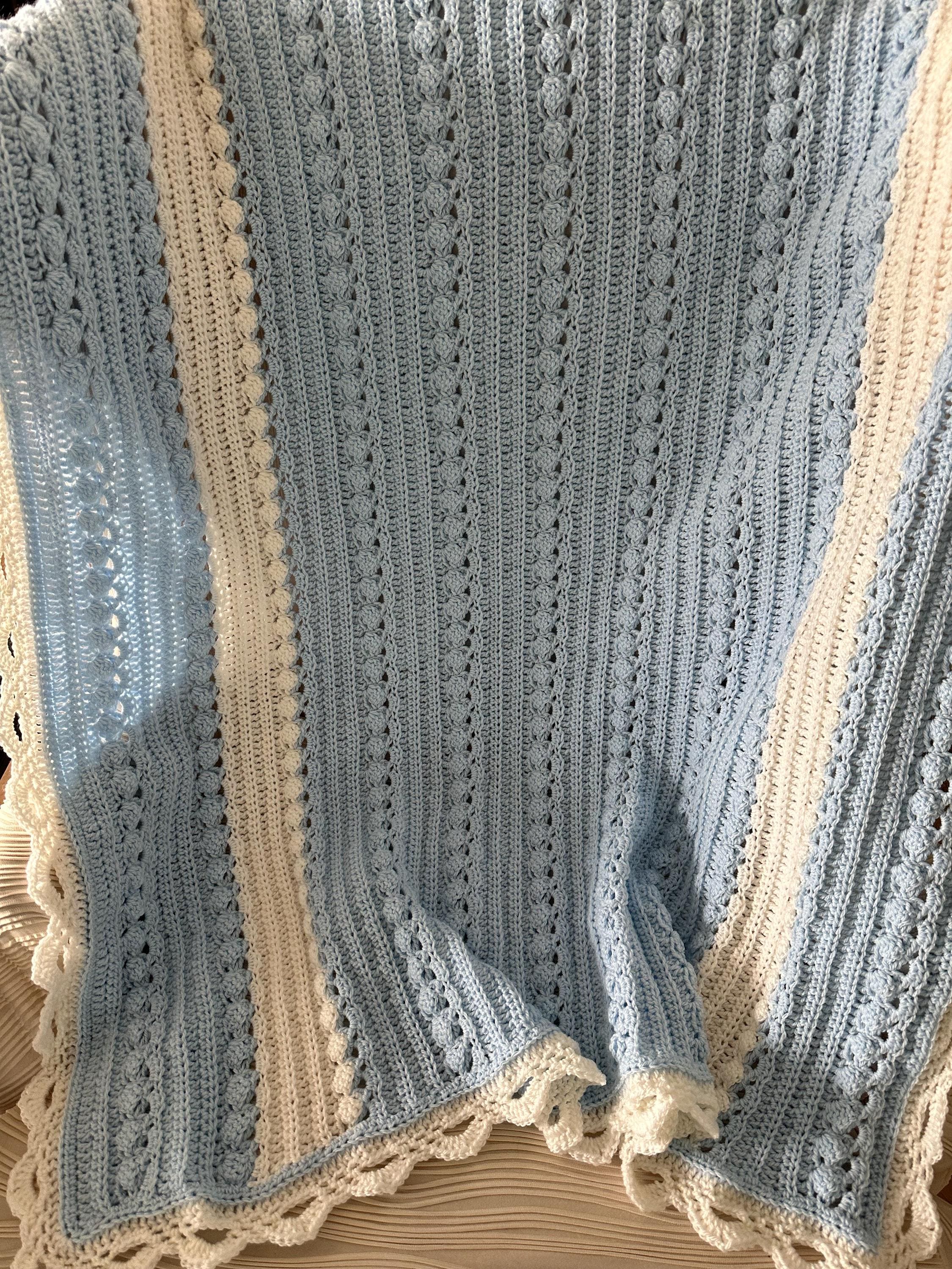 Baby blanket hand crocheted in baby sky blue with white, and intricate white edge in a wonderful custom cable pattern. Approximately 37 x 42.