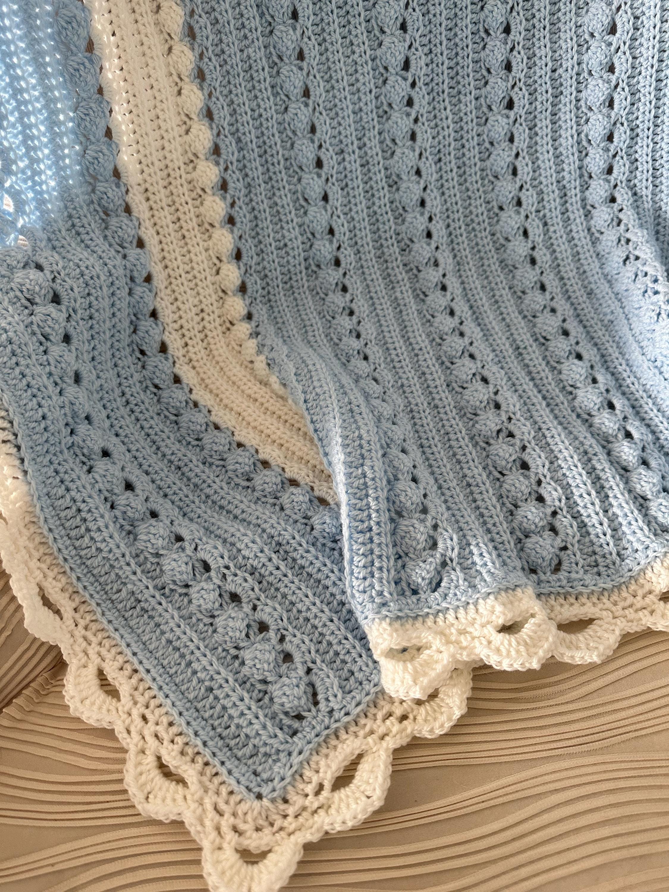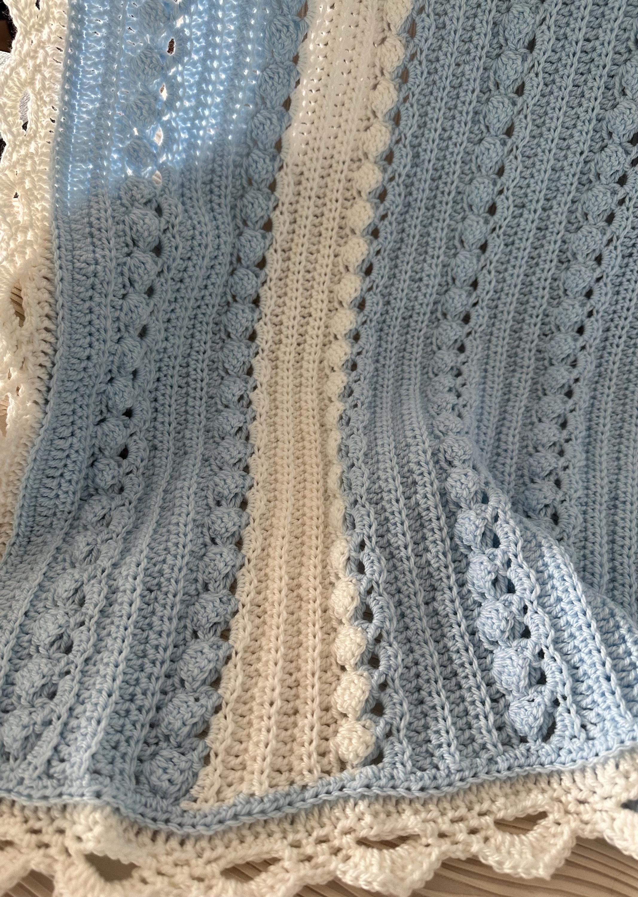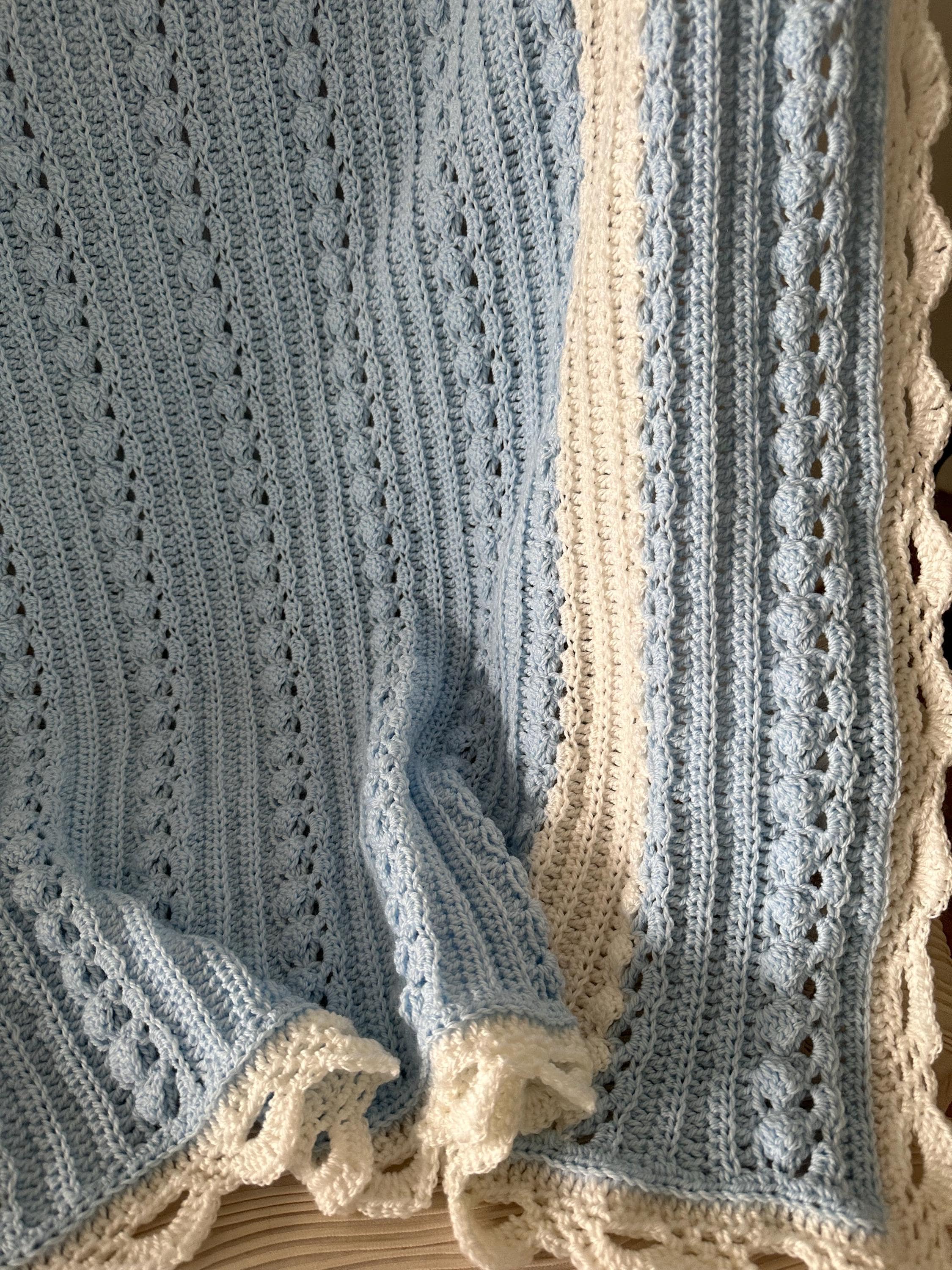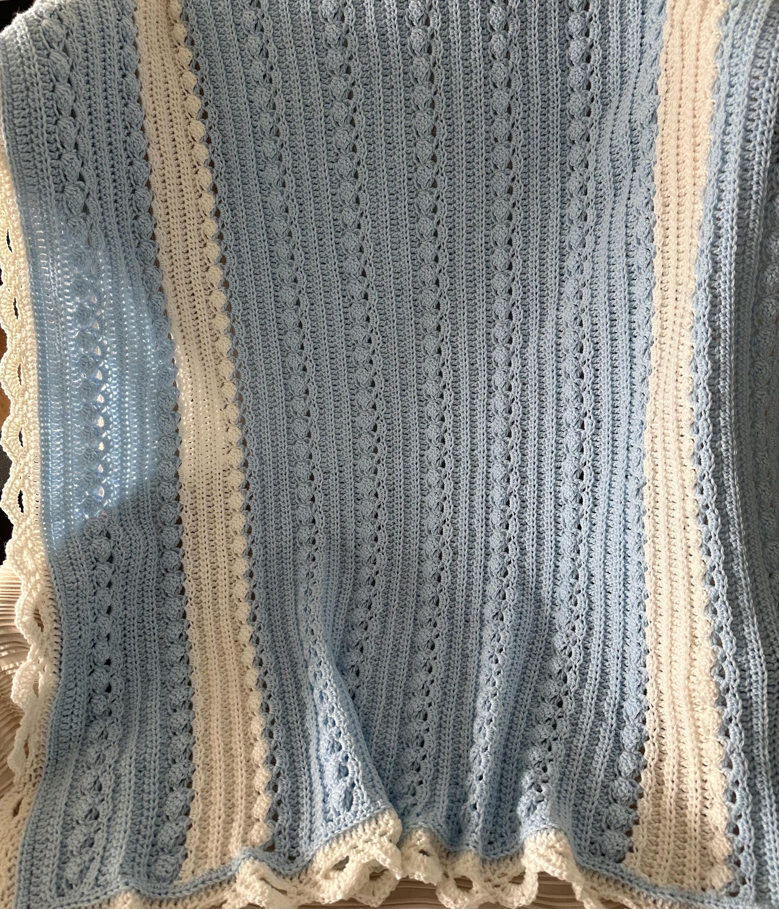 Baby blanket hand crocheted in baby sky blue with white, and intricate white edge in a wonderful custom cable pattern. Approximately 37 x 42.