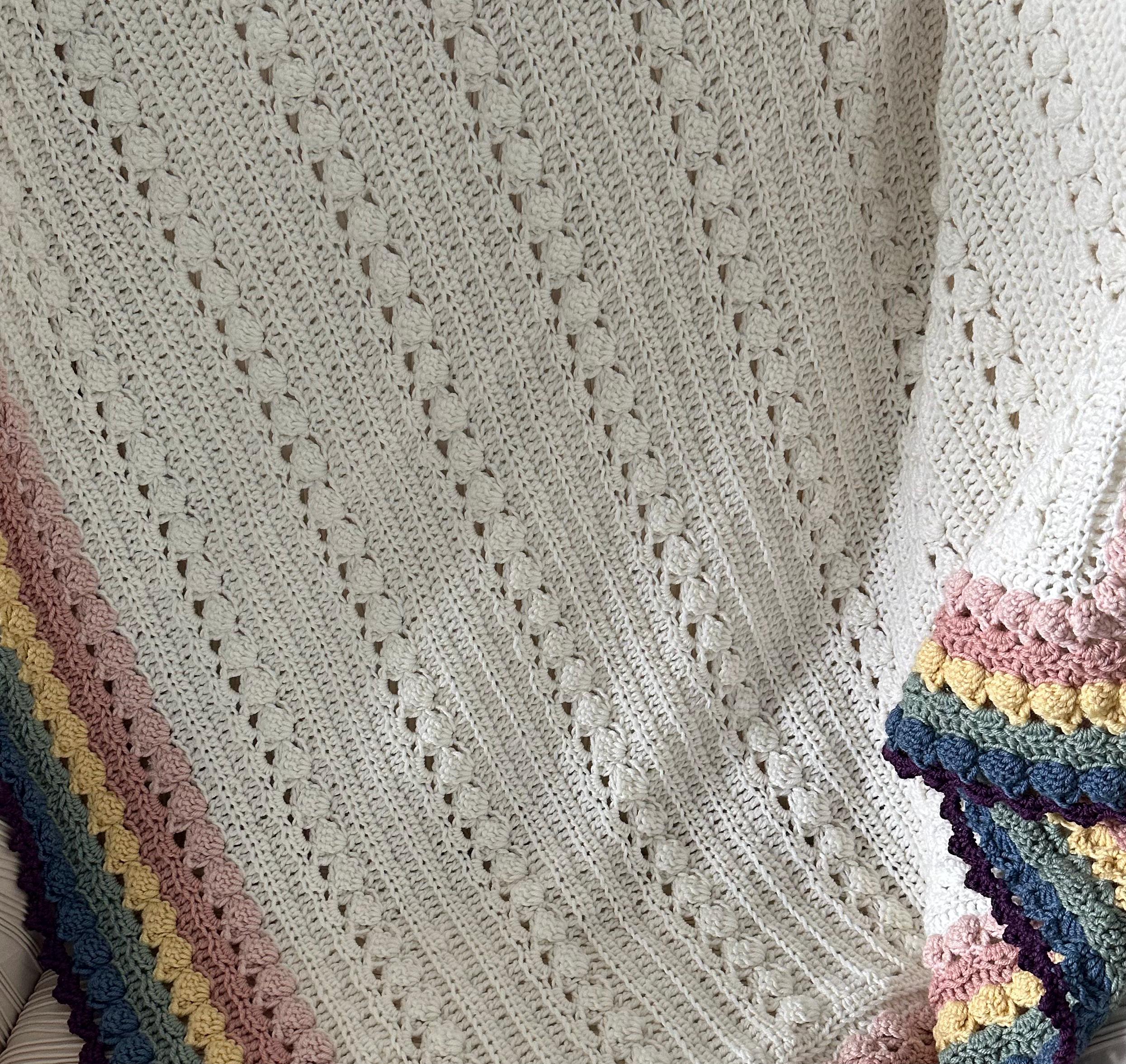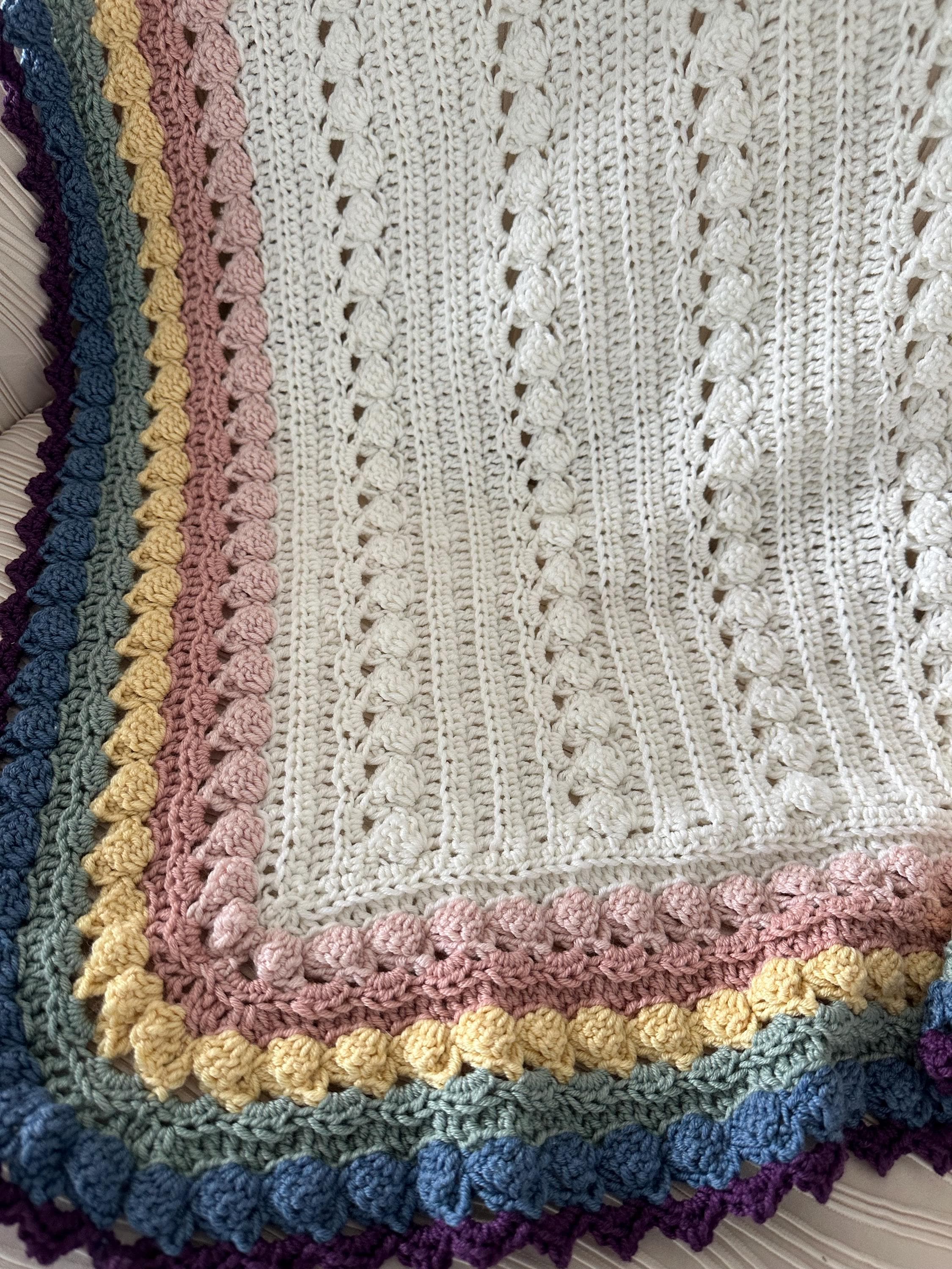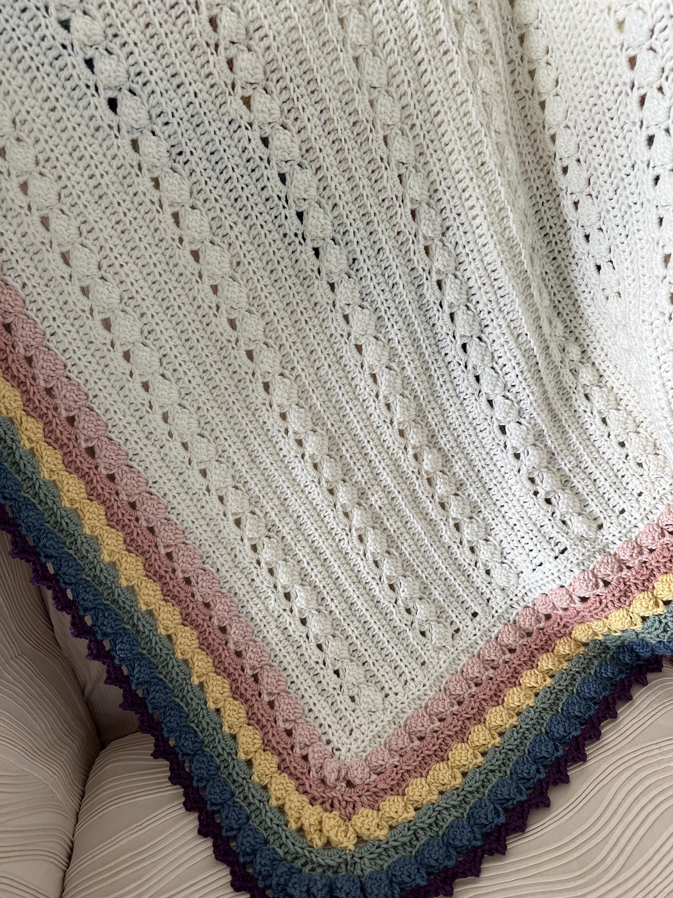 BOHO rainbow baby blanket hand crocheted in off white natural fiber blend. Debbie Bliss Baby Cashmerino, with rich BOHO color edge. These are super soft quality natural blend baby yarns. Beautiful colors! Approximately 38 x 42