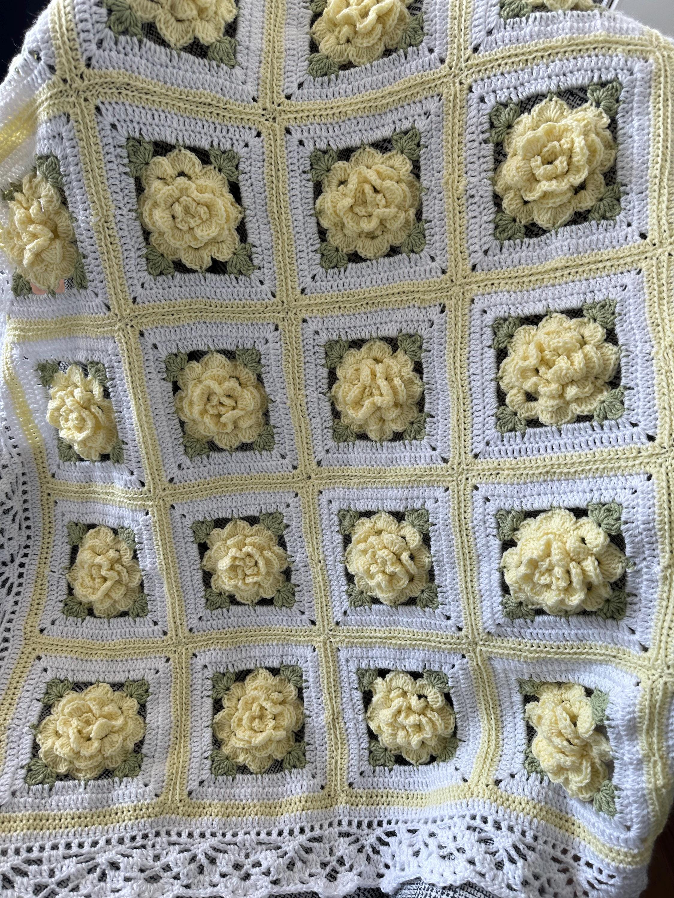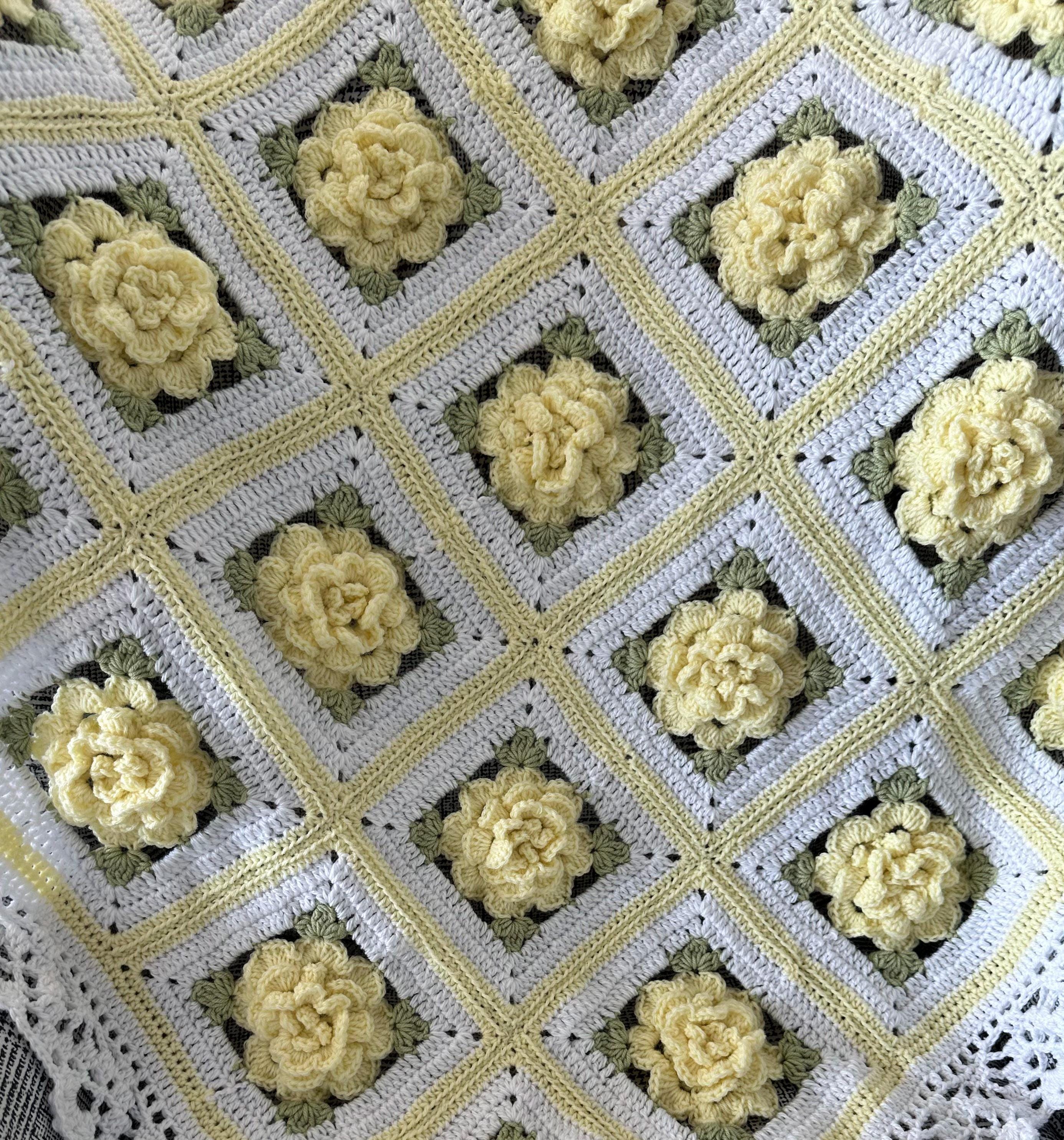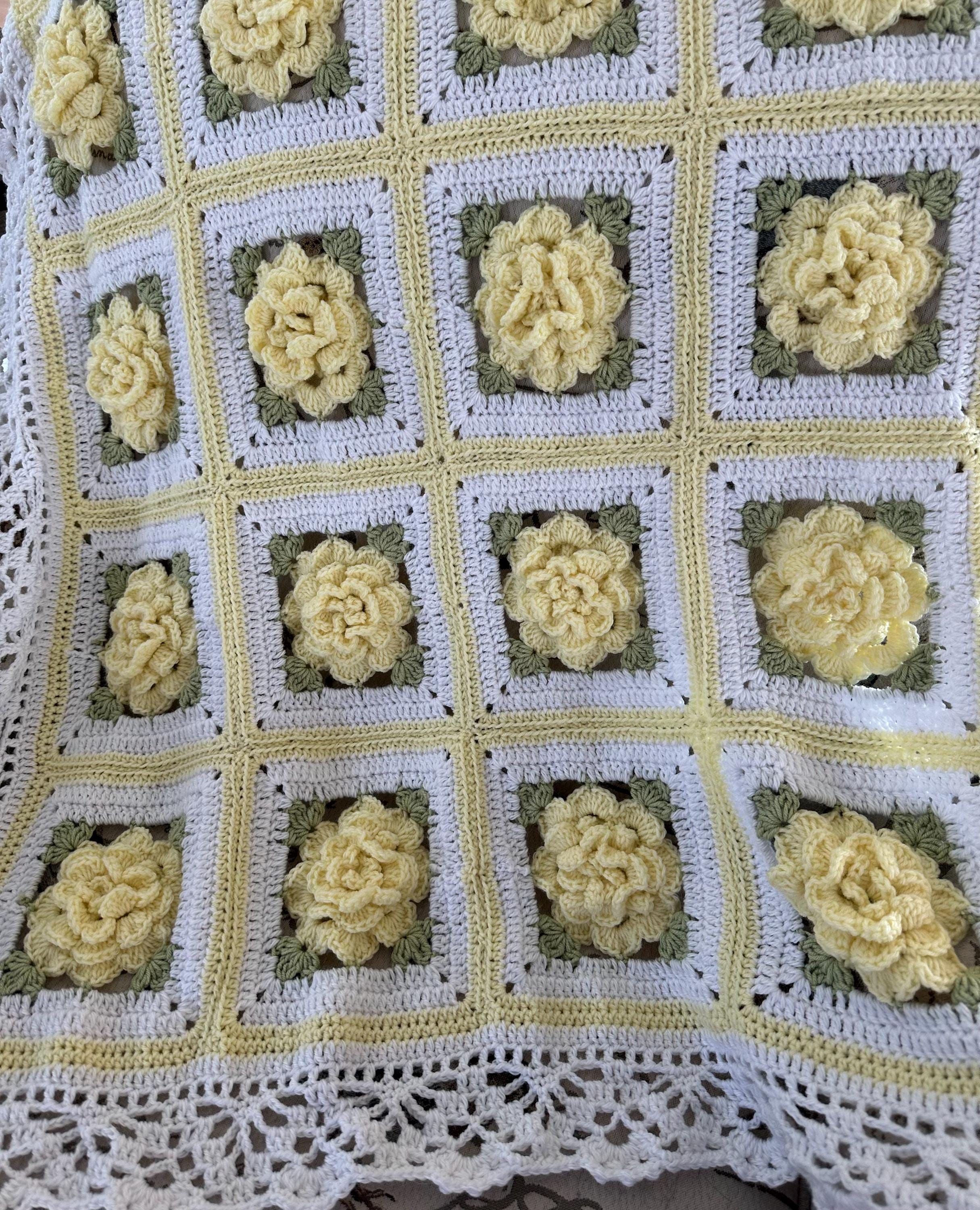 New improved design. Note that the centers of the roses are closed petals. Just like real flowers... no holes in the center. Beautiful full lace edging/border. Shown in baby yellow with white but there are many color combinations available or create your own custom blanket. Three sizes including one adult size. New unique Baby Tuckers design! Use color combinations or all solid colors. Your choice!