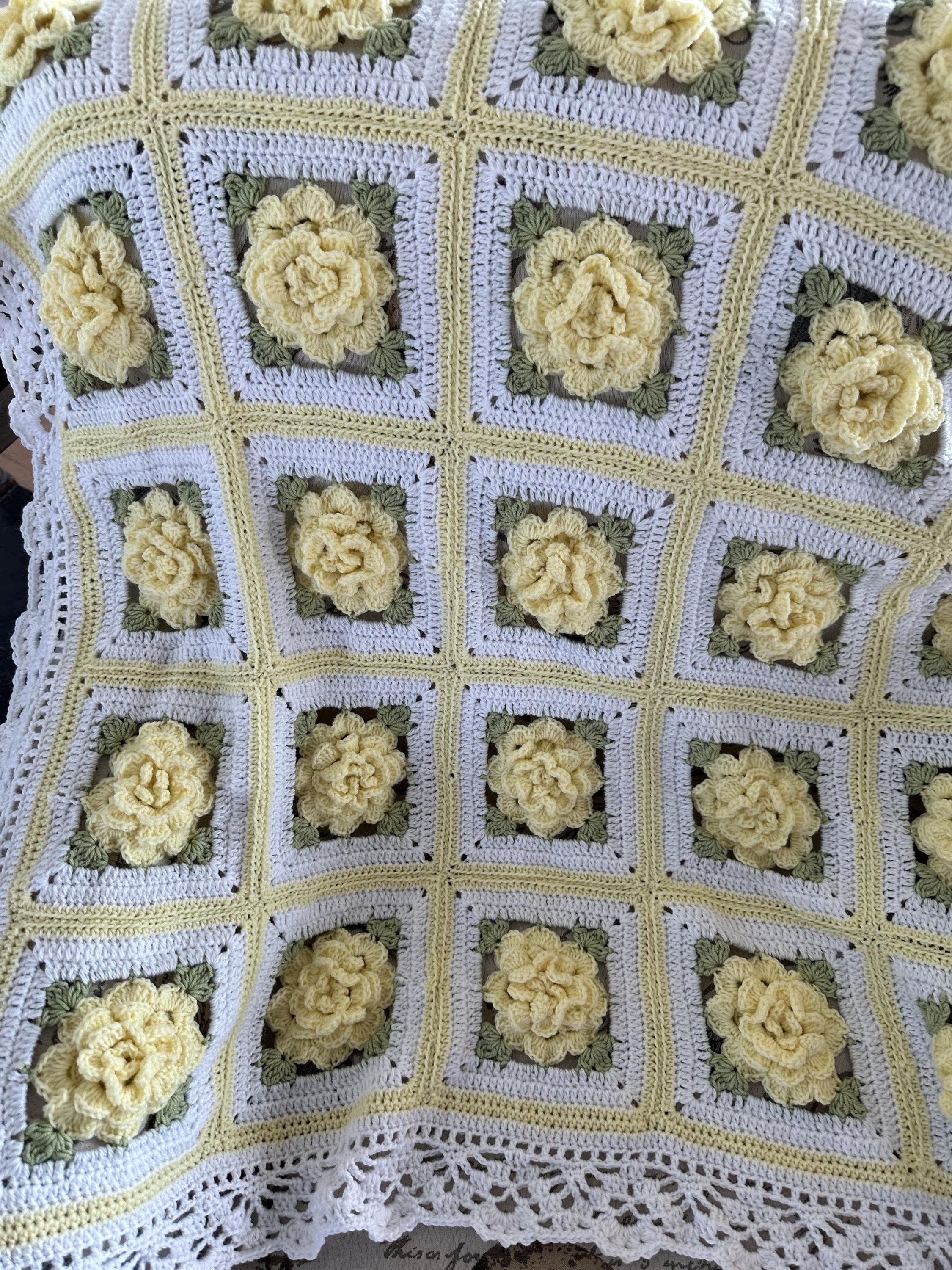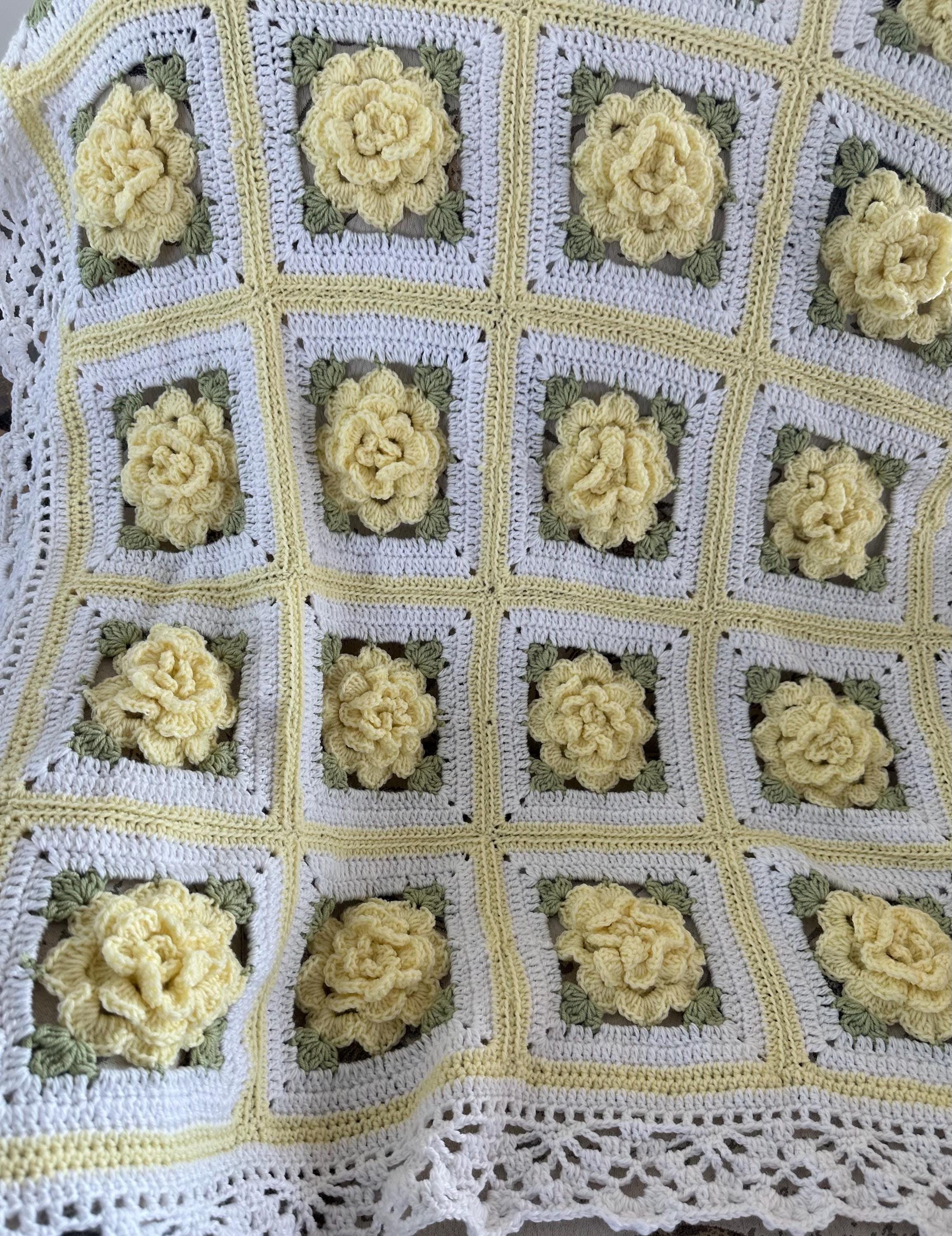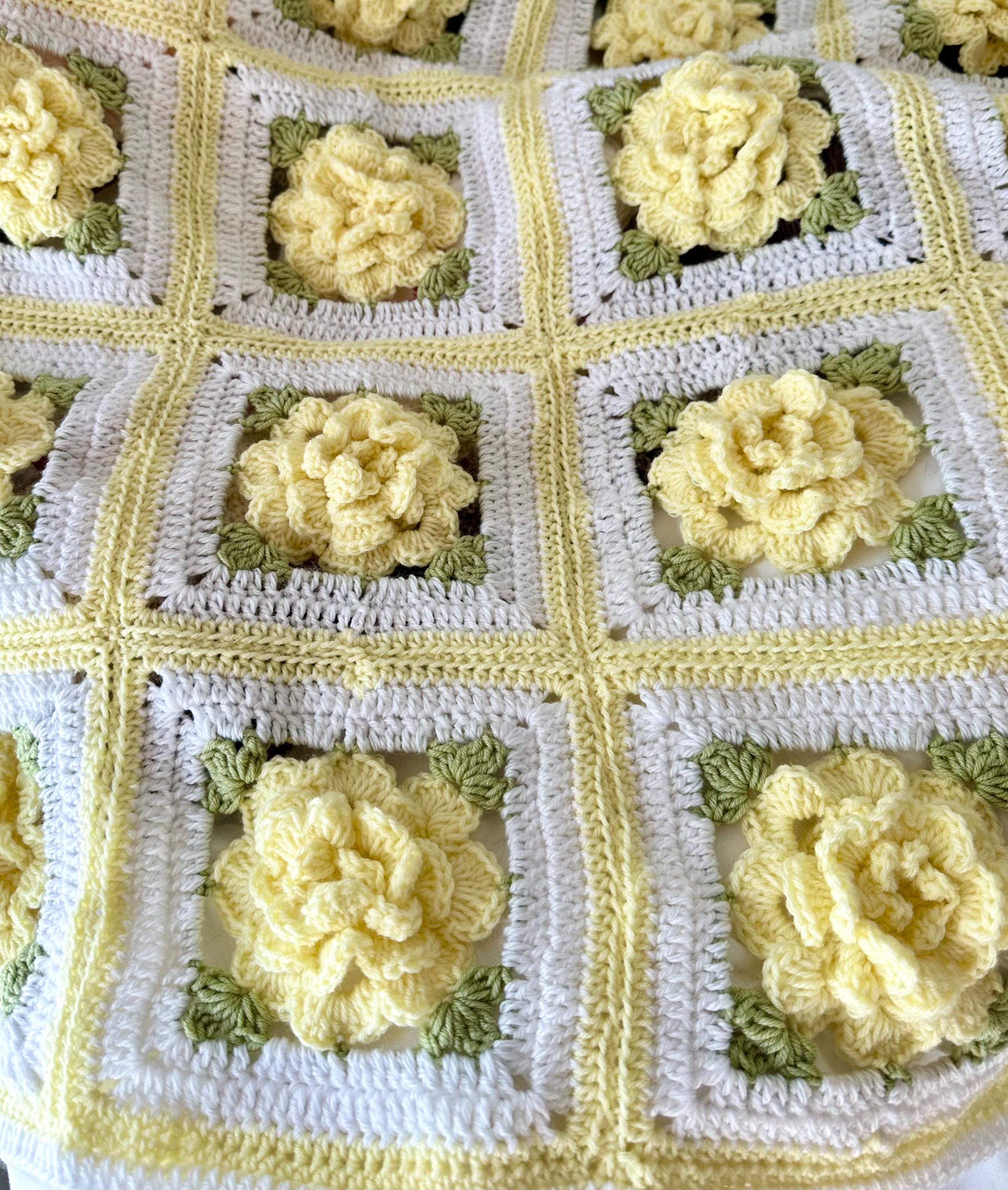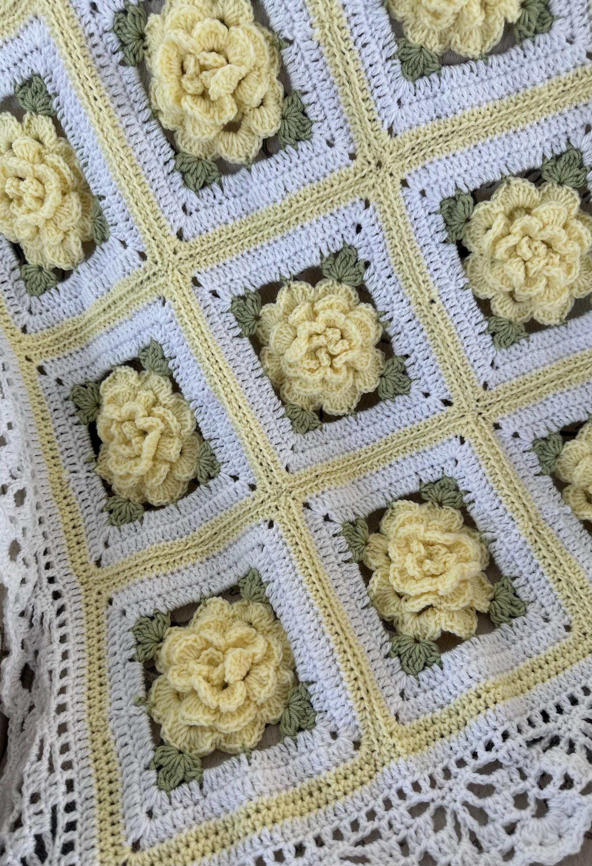 New improved design. Note that the centers of the roses are closed petals. Just like real flowers... no holes in the center. Beautiful full lace edging/border. Shown in baby yellow with white but there are many color combinations available or create your own custom blanket. Three sizes including one adult size. New unique Baby Tuckers design! Use color combinations or all solid colors. Your choice!