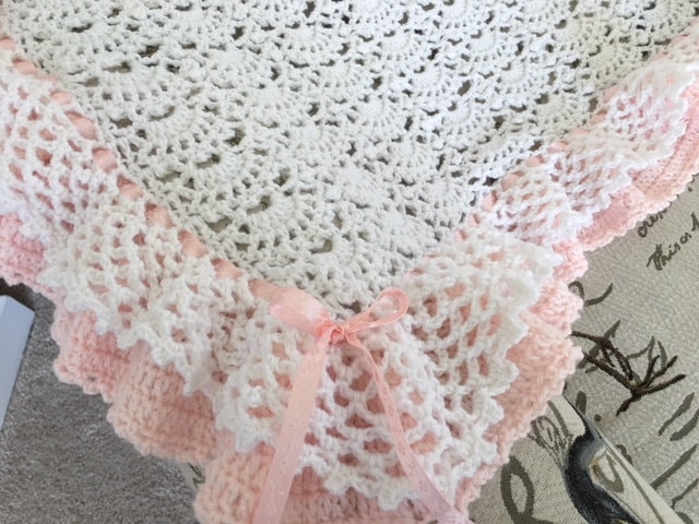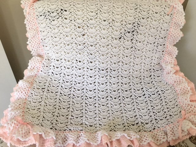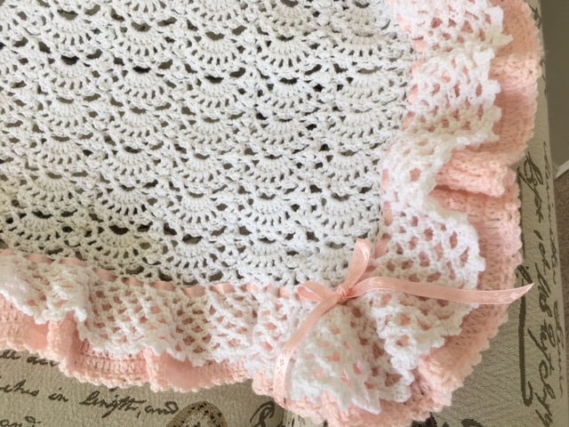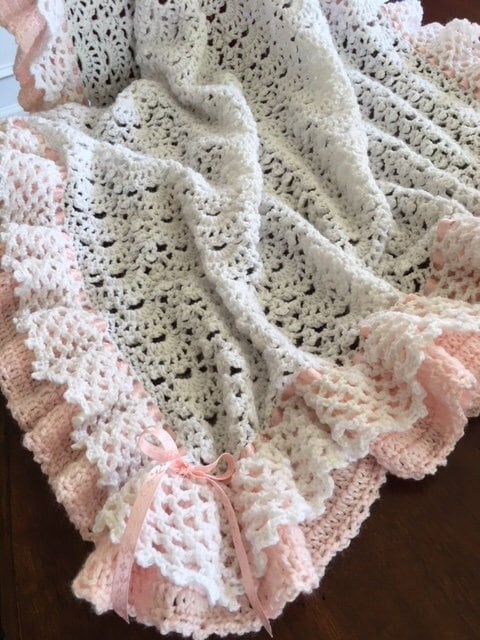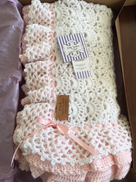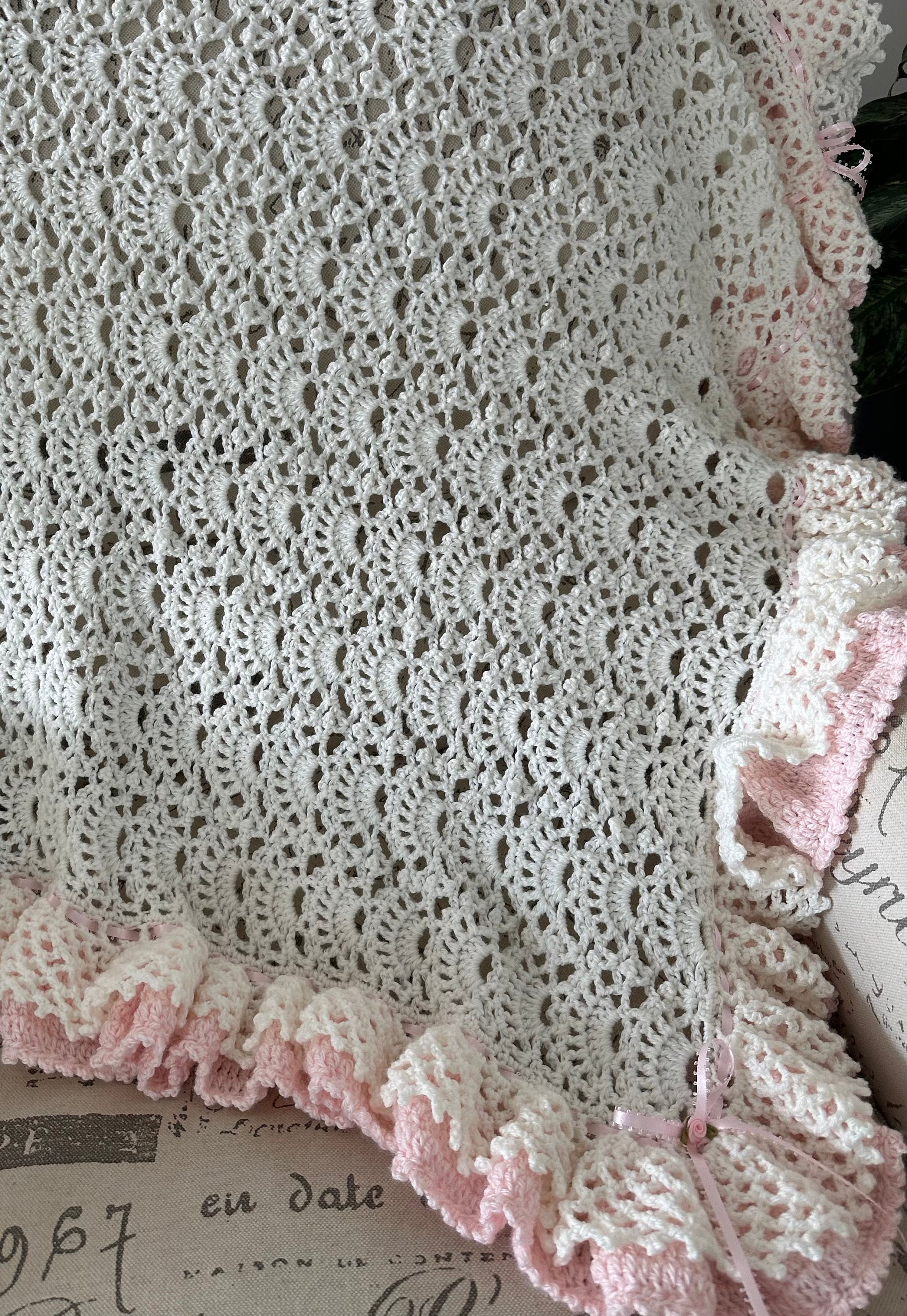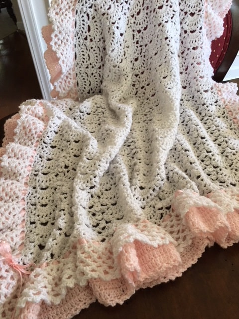 Handmade Crochet double ruffled, fan design baby blanket! White with pink crocheted baby blanket in a beautiful fan pattern with pink satin ribbon lacing. This blanket takes a week to create due to the extensive full ruffles.