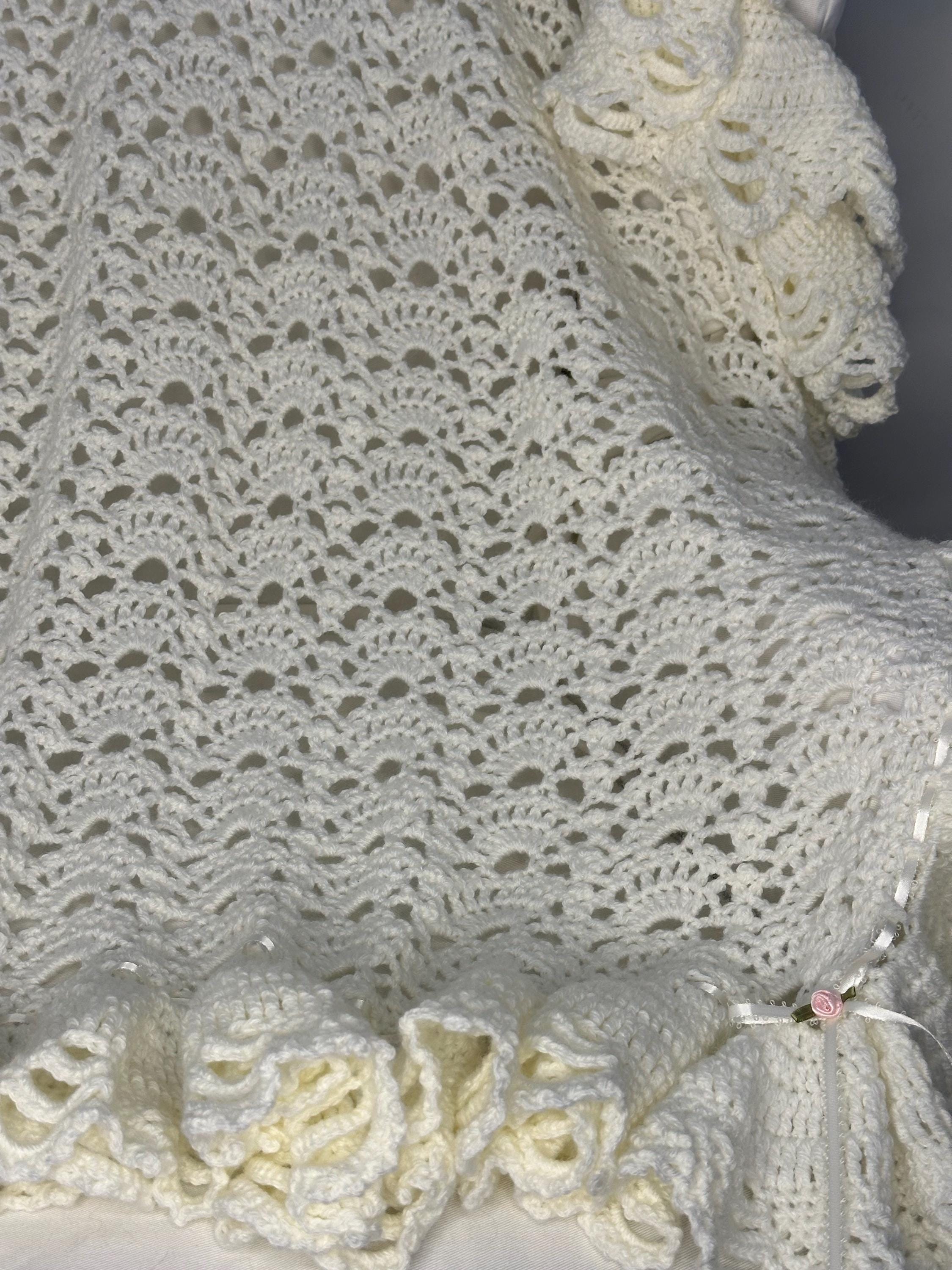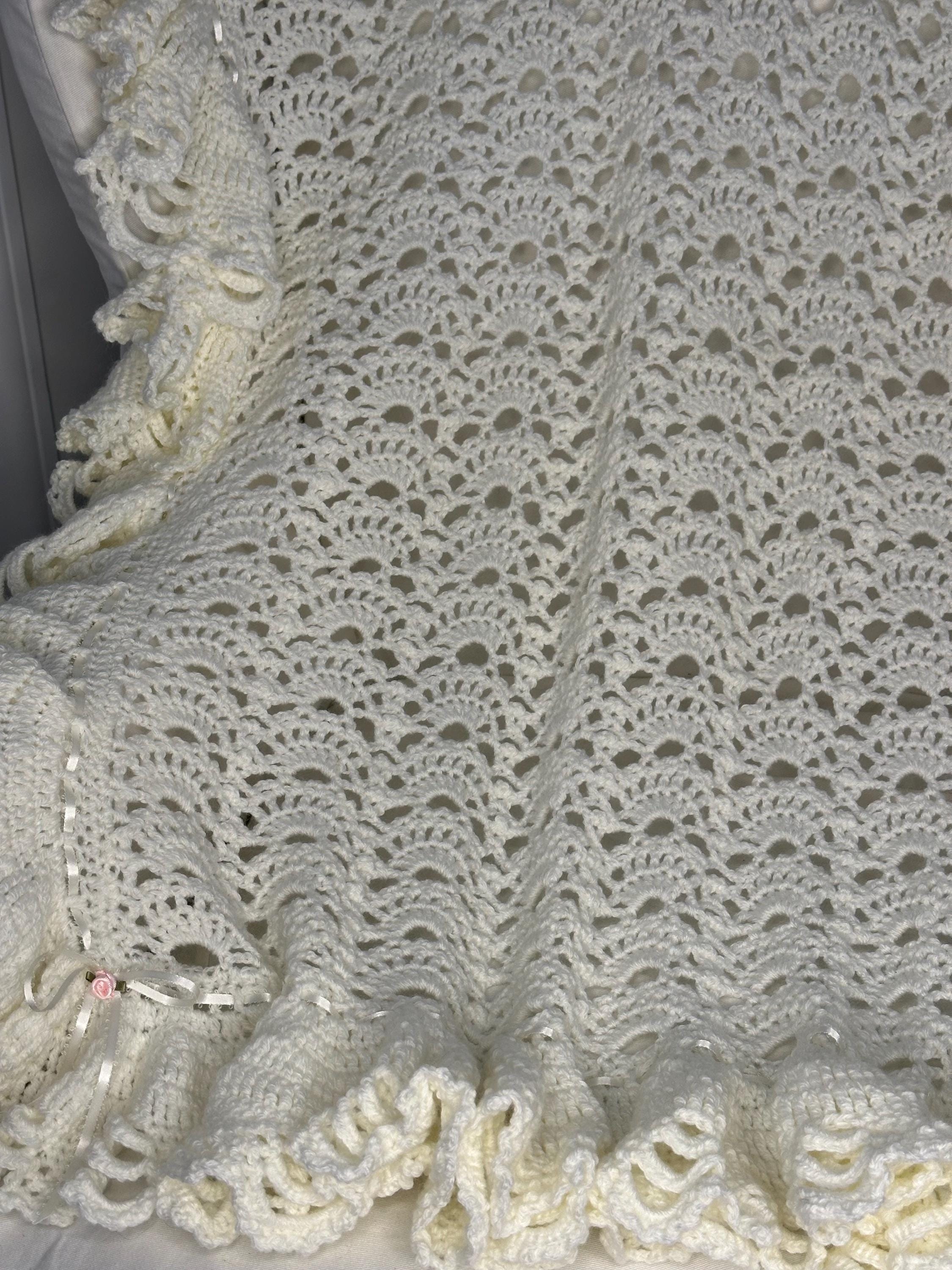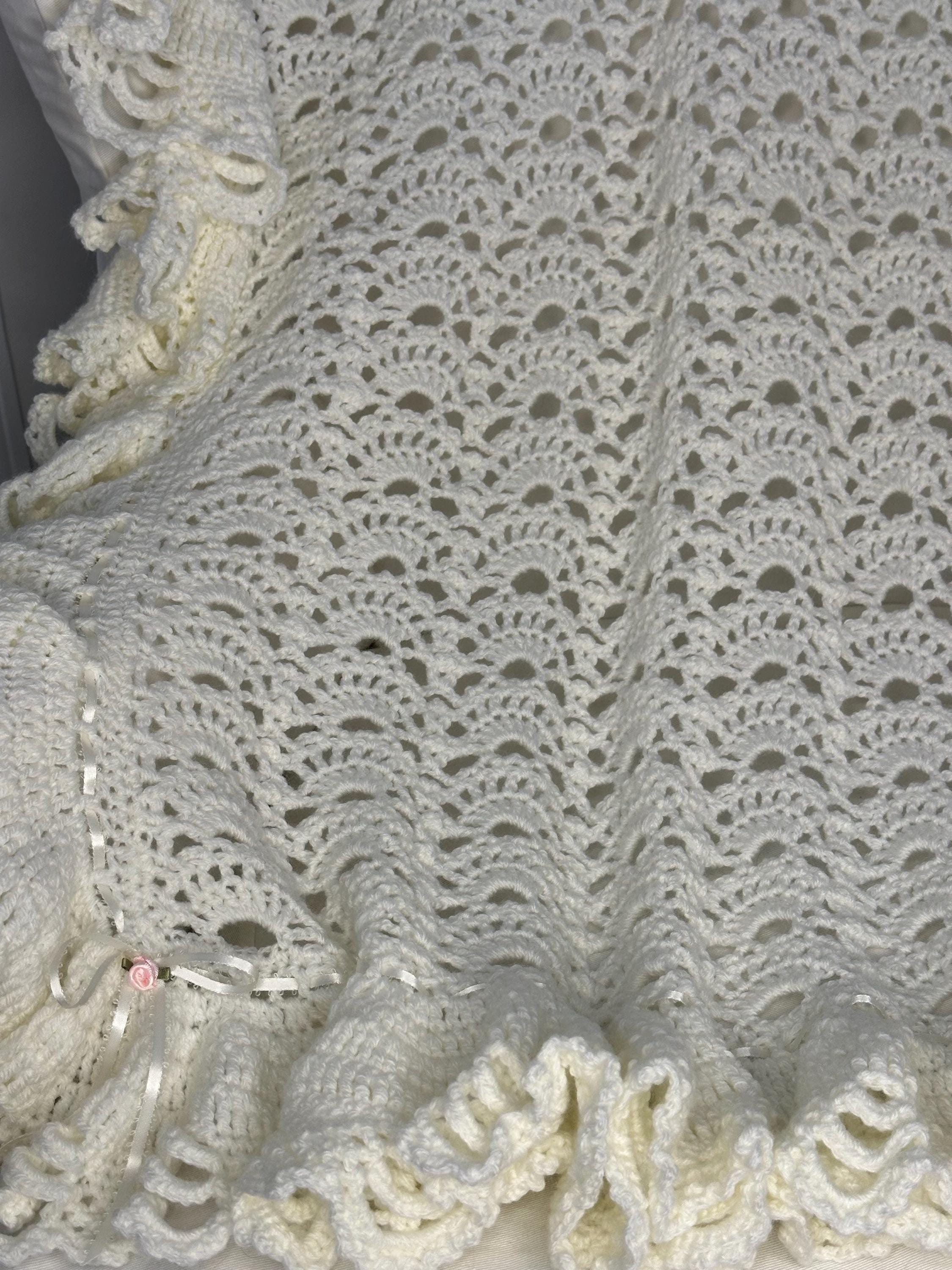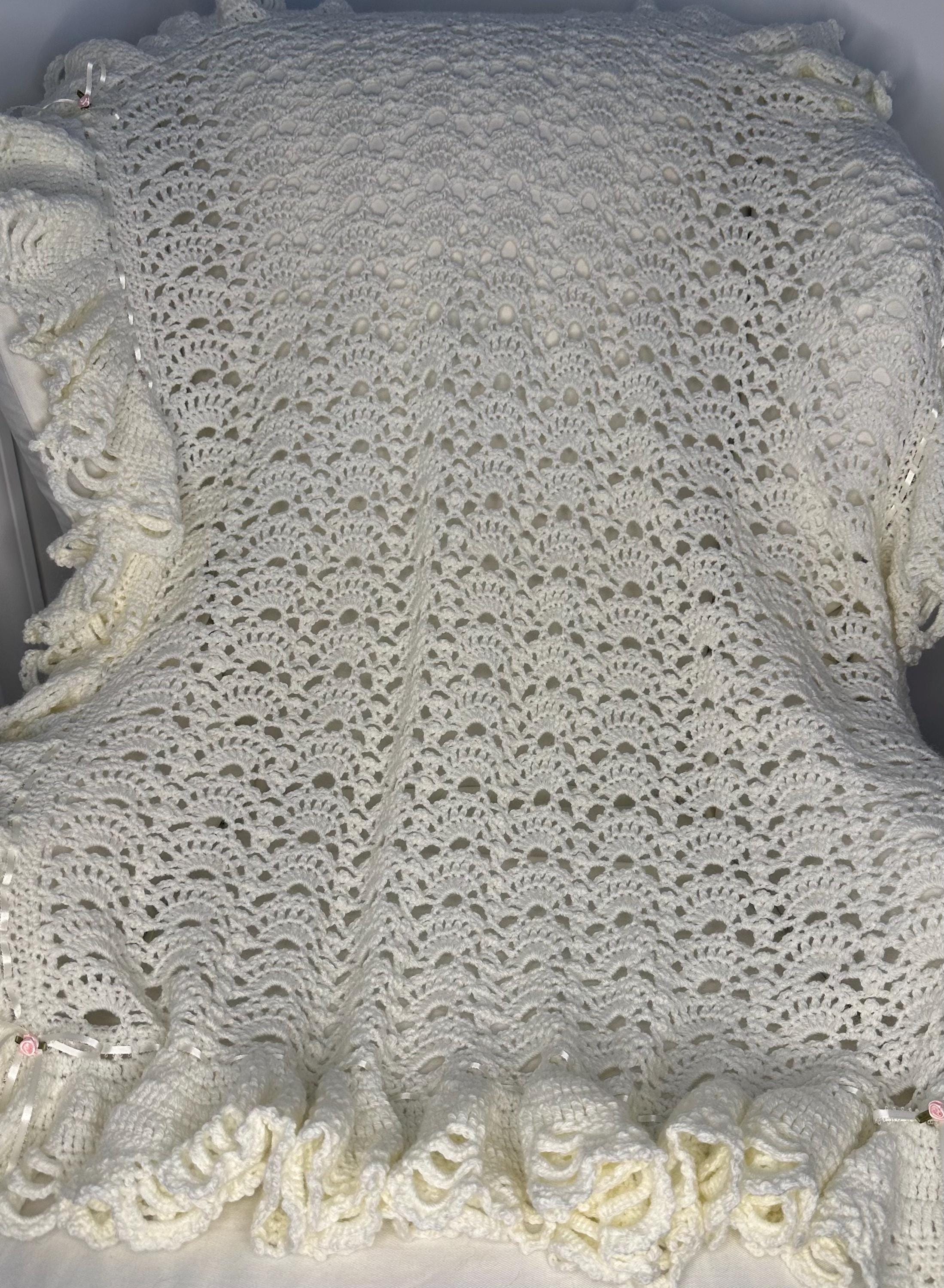 Beautiful handmade crochet off white baby blanket in Paton's Beehive Baby yarn. Beautiful heirloom keepsake design. Very soft, quality yarn. This beautiful blanket is adorned with off white satin ribbon and small pink rosettes.