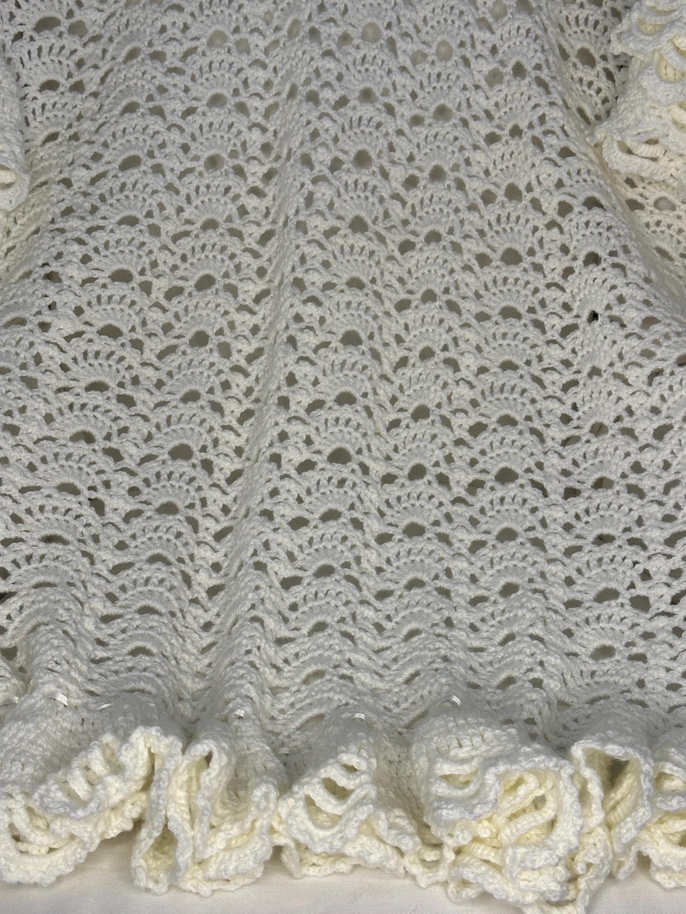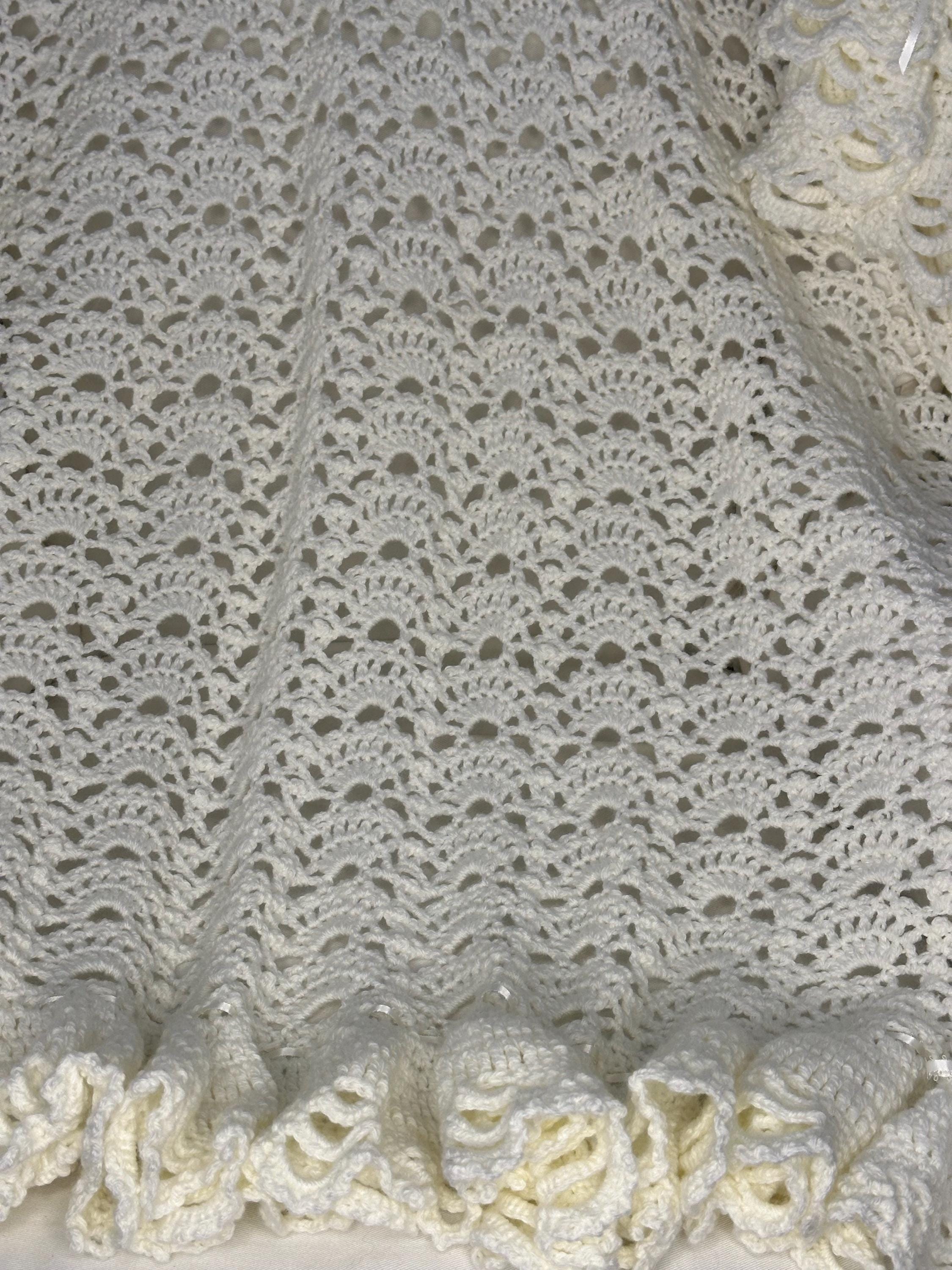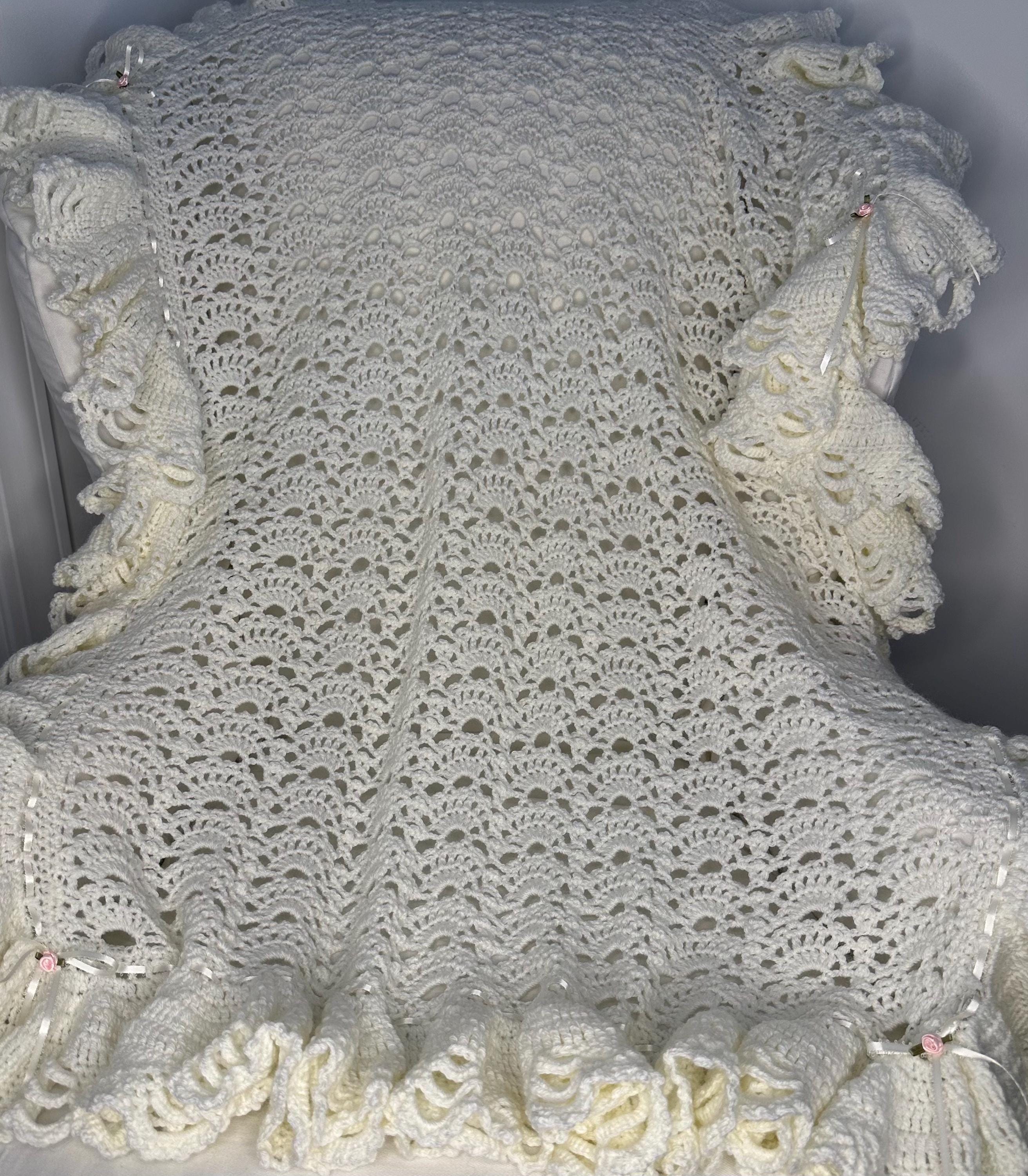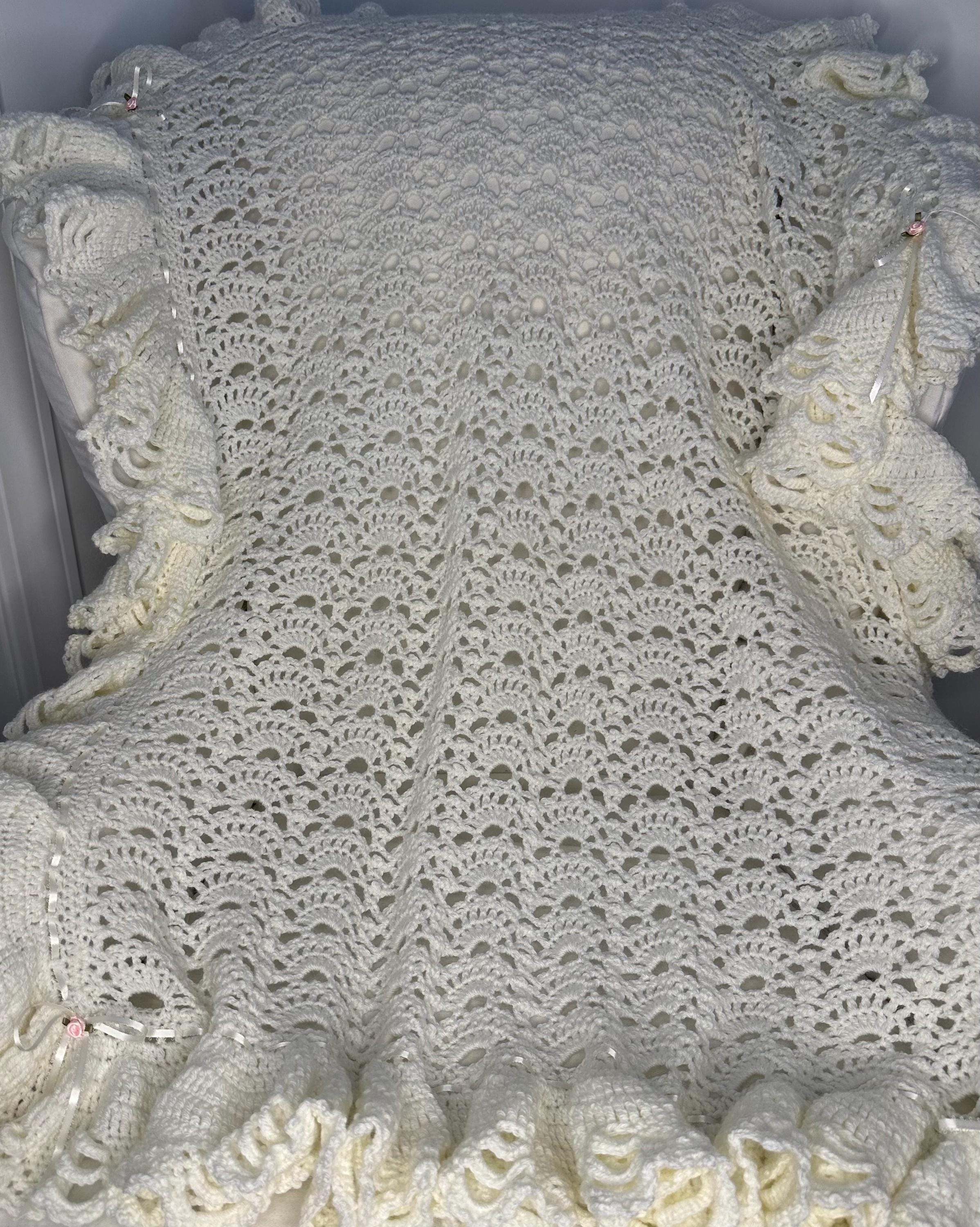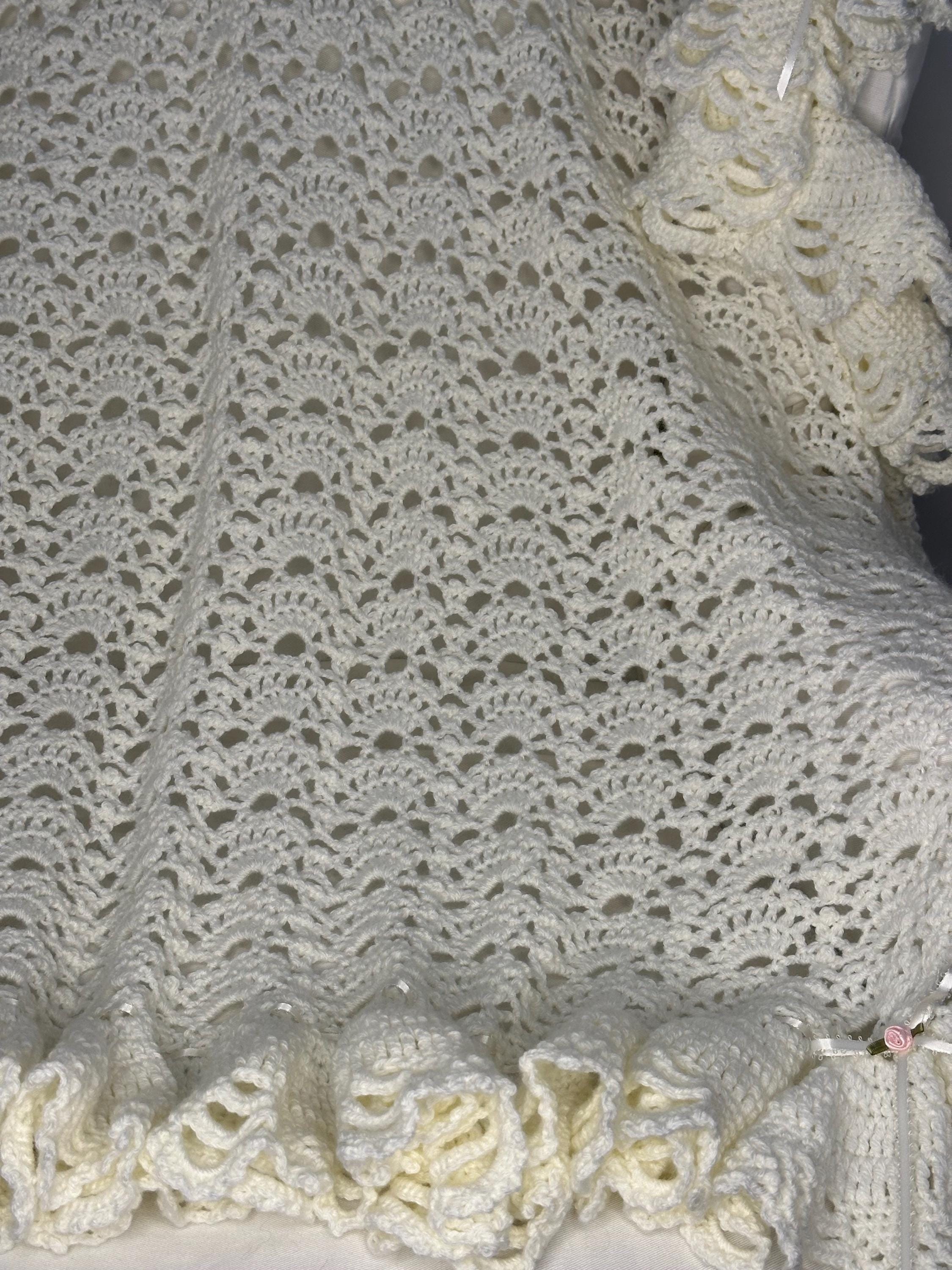 Beautiful handmade crochet off white baby blanket in Paton's Beehive Baby yarn. Beautiful heirloom keepsake design. Very soft, quality yarn. This beautiful blanket is adorned with off white satin ribbon and small pink rosettes.